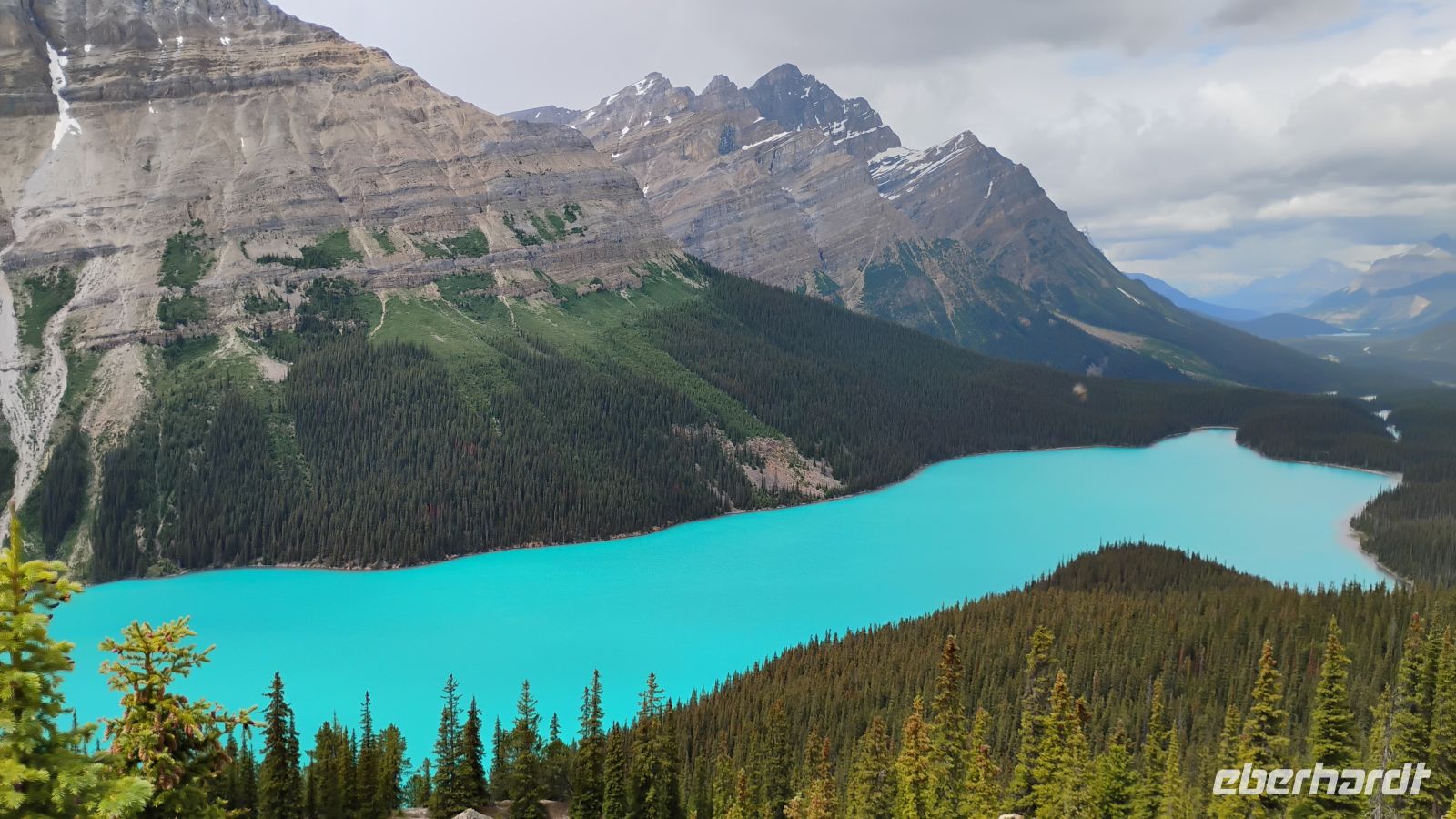 Nach einer kurzen Mittagspause legen wir mehrere Fotostopps ein: zuerst am stillen Bow Lake, eingerahmt von zerklüfteten Gipfeln, dann etwas später am Peyto Lake. Dieser See ist berühmt für seine auffällige, leuchtend türkisblaue Farbe – und seine Form, die an einen Wolfskopf erinnert. Vom Aussichtspunkt hoch über dem Tal ist der Blick einfach atemberaubend.