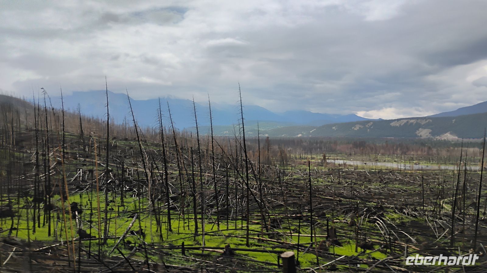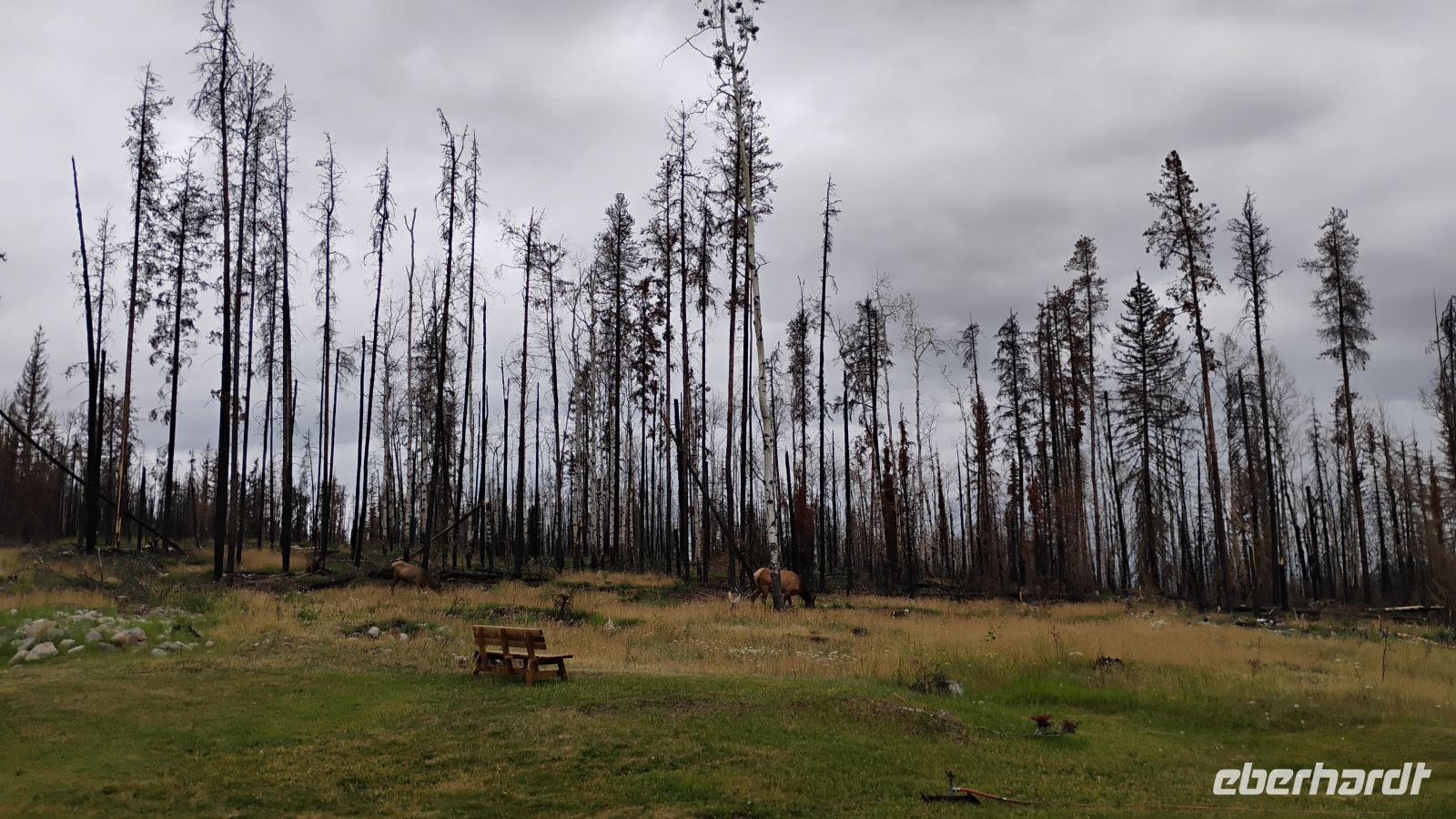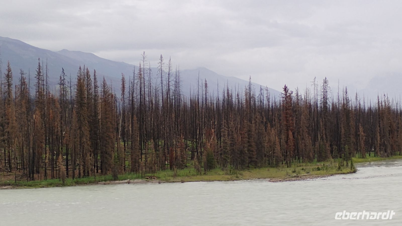 Auf dem Weg nach Jasper erleben wir noch einmal eine ganz andere Facette der Rockies: die Spuren eines gewaltigen Waldbrandes, der hier im letzten Jahr wütete, sind unübersehbar. Windgeschwindigkeiten von bis zu 220 km/h hatten das Feuer damals unkontrollierbar gemacht – und selbst jetzt liegt noch ein schwacher Brandgeruch in der Luft. Die Landschaft wirkt karg und verletzlich, und wer weiß wie lange es dauert, bis sich die Natur ihren Platz zurückerobert.