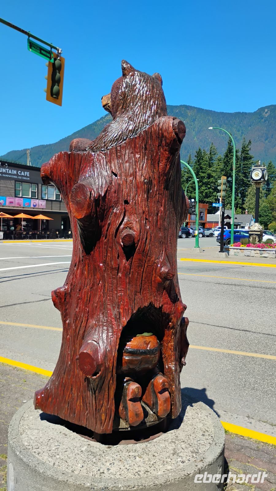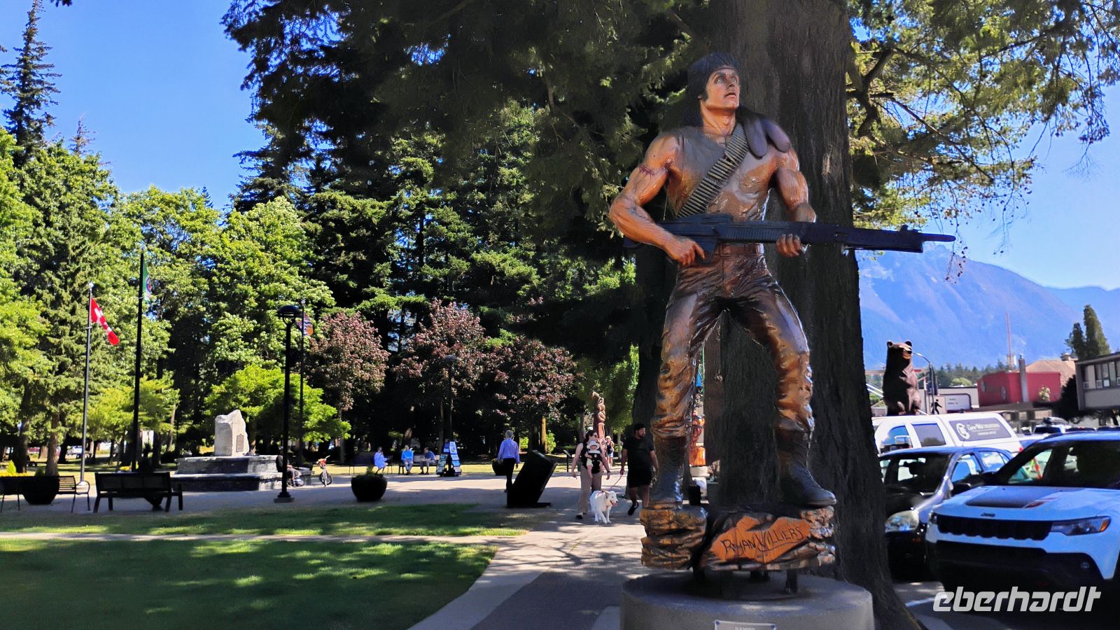 In Hope legen wir einen ausgedehnten Stopp ein. Der kleine Ort ist bekannt für seine über 80 Kettensägenskulpturen, die kunstvoll aus Baumstämmen geschnitzt wurden – Tiere, Fantasie- und historische Figuren. Eine davon zeigt Sylvester Stallone alias John Rambo, denn hier wurde der erste Film der Reihe First Blood gedreht.