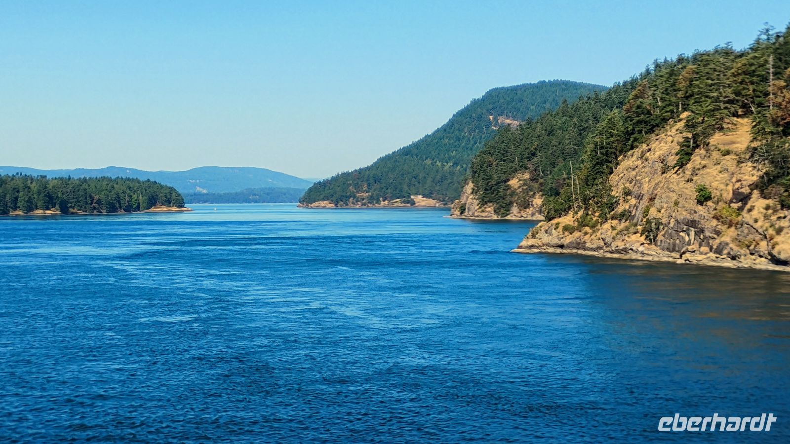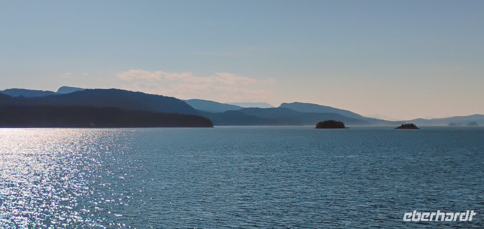 Früh am Morgen starten wir unseren Tagesausflug nach Vancouver Island. Der Bus bringt uns zur Fährstation südlich von Vancouver. Pünktlich um 9:00 Uhr legt die große Fähre ab – rund 1,5 Stunden dauert die Überfahrt durch die Strait of Georgia, die das Festland von British Columbia von Vancouver Island trennt. Die Route führt durch ein weit verzweigtes Inselnetz aus kleinen, teils unbewohnten und größeren, bewaldeten Inseln mit verstreuten Häusern. Die Sicht ist klar, das Wasser relativ ruhig – nur die erhofften Wale lassen sich heute nicht blicken.
