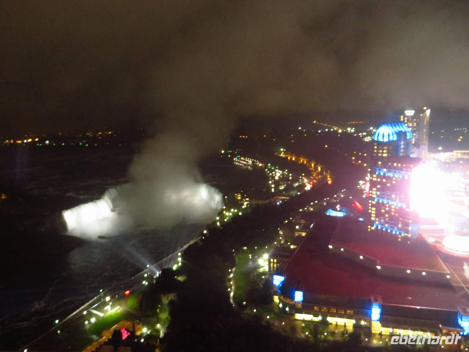 Wir hatten unsere Tische direkt am Fenster reserviert und so konnten wir genau beobachten, wie mit Einbruch der Dunkelheit, die Fälle angestrahlt wurden. Um diesen Blick aber fotografisch festzuhalten liefen wir noch eine Treppe weiter hoch, auf welcher eine 360 Grad-Ebene angebracht war. Unter uns schillerten die Wasserfälle in ihren schönsten Farben... für diese Augenweide nahmen wir auch den pfeifenden Wind in Kauf.. auch wenn wir dachten, dass wir gleich wegfliegen würden..