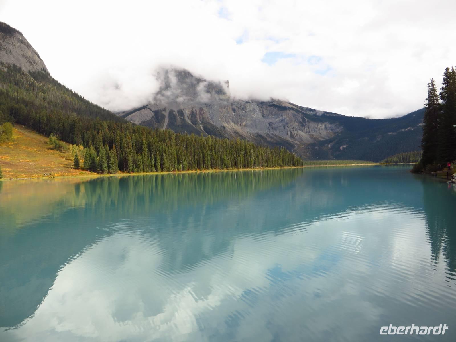Uns erwartete der Yoho Nationalpark mit dem atemberaubenden Emerald Lake. „Faszinierend" oder „wunderschön" sind bedeutungsvolle Wörter... aber sie spiegeln noch lange nicht DIESE malerische Landschaft wider.. Es war ein magischer Ort. Wenn man sich vor den See stellte, um ein Bild zu schießen, dachte man, das Foto wäre durch Millionen Filter und Bearbeitungsprogramme gegangen, so unwirklich wirkte es. Dass SO ein Naturschauspiel mit dem türkiesblauen See, den riesigen Bergen und der schimmernden Sonne im Hintergrund noch existiert, wird hier bestens bewiesen!