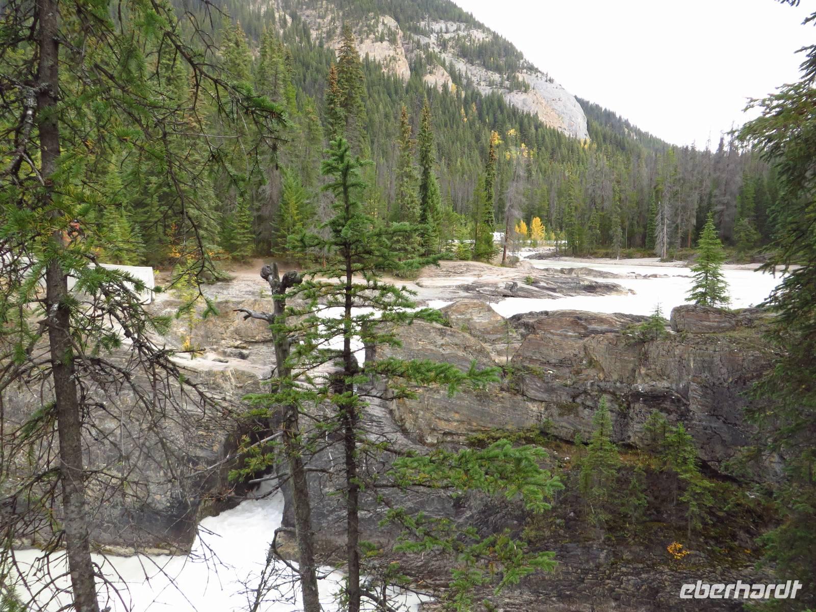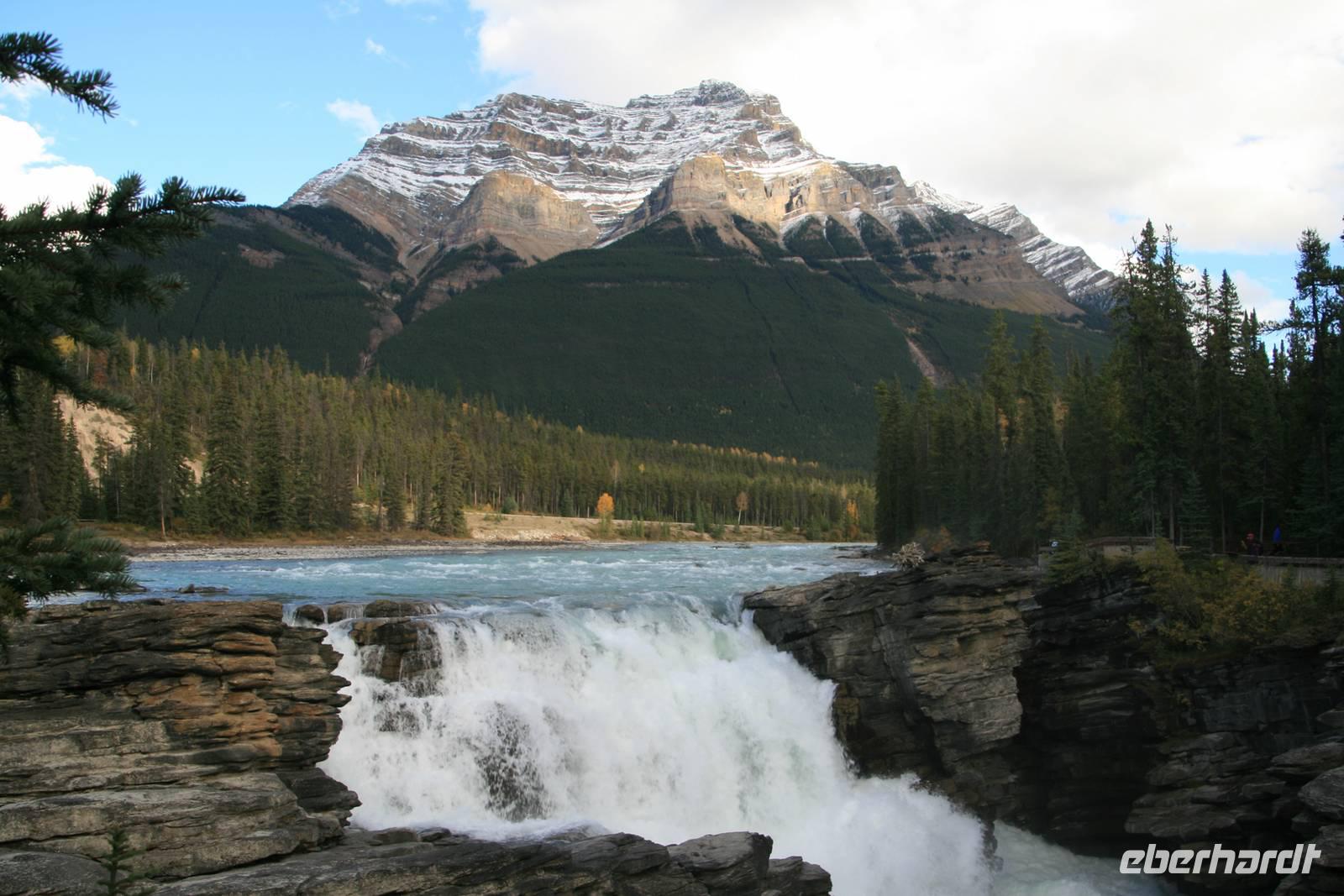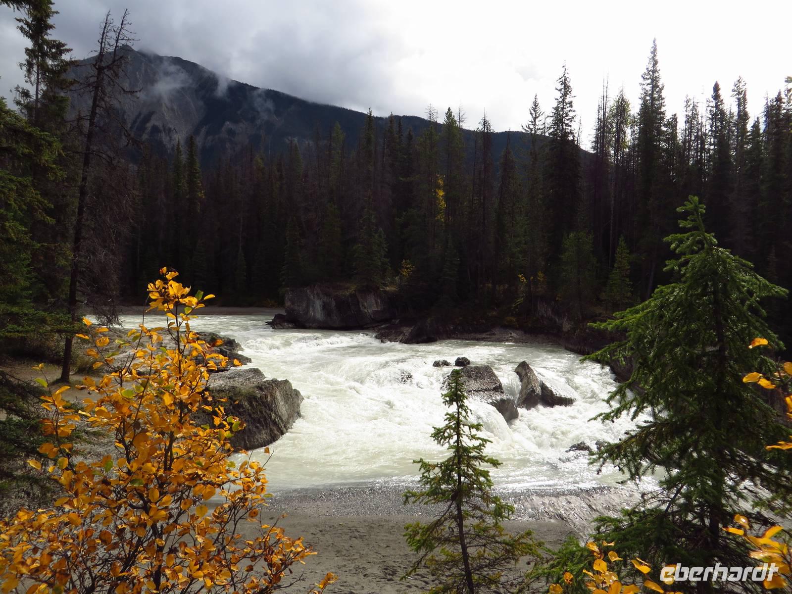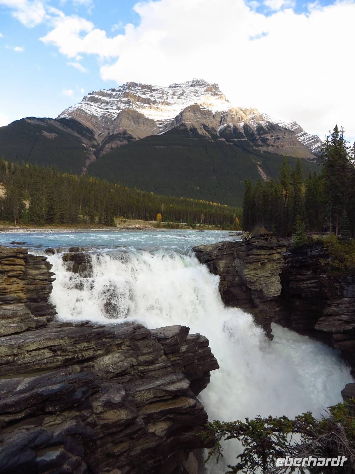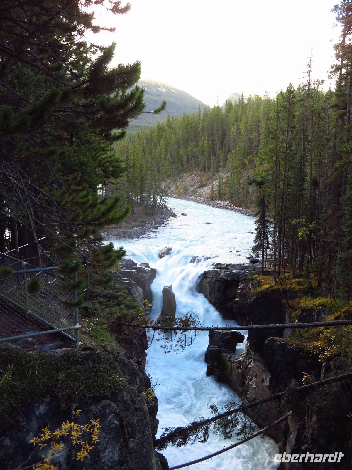 Wir fuhren zurück zu unserer Bungalowanlage und machten einen kleinen Spaziergang zu den 1km entfernten Sunwapta Falls, einem um eine kleine Insel sich schmiegenden Wasserfall.