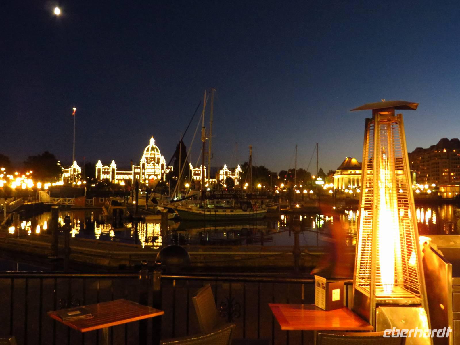Wir spazierten zu einem Hotel und fuhren mit dem Fahrtsuhl bis ganz nach oben, wo sich uns ein tolles 360 Grad Restaurant erbot, in welchem wir bei Guten Essen und der untergehenden Sonne einen tollen Blick auf Victoria hatten.