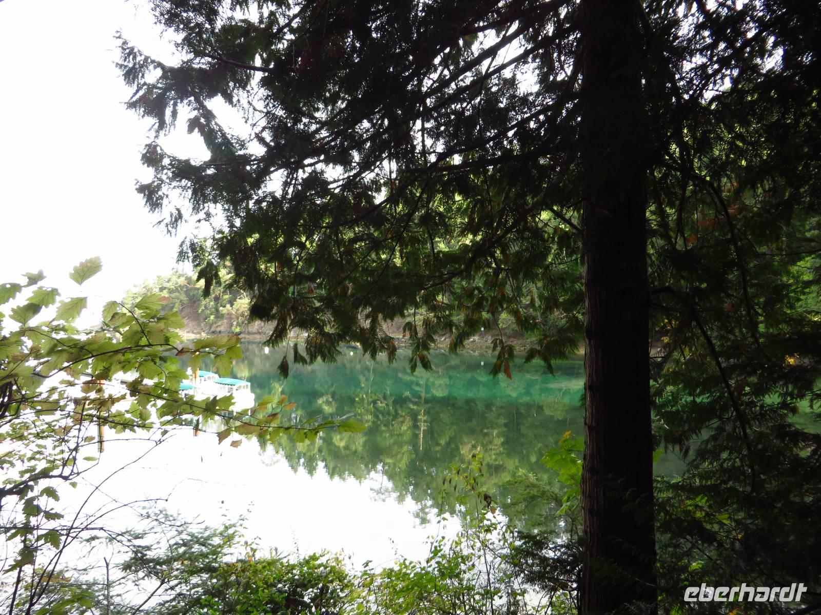 Hier waren die Höhenunterschiede unheimlich beeindruckend. Entlang unseres Weges befanden wir uns höhentechnisch gesehen ungefähr in der Mitte. Wenn wir nach unten schauten, blickten wir in eine metertiefe Schlucht, durch die das hellblaue Wasser floss und oben rauschten auf den Bergspitzen die Wälder.