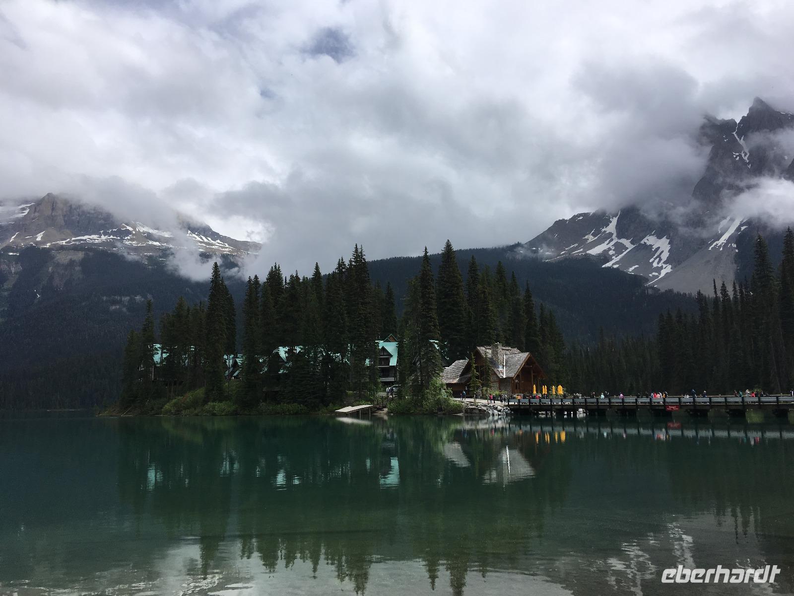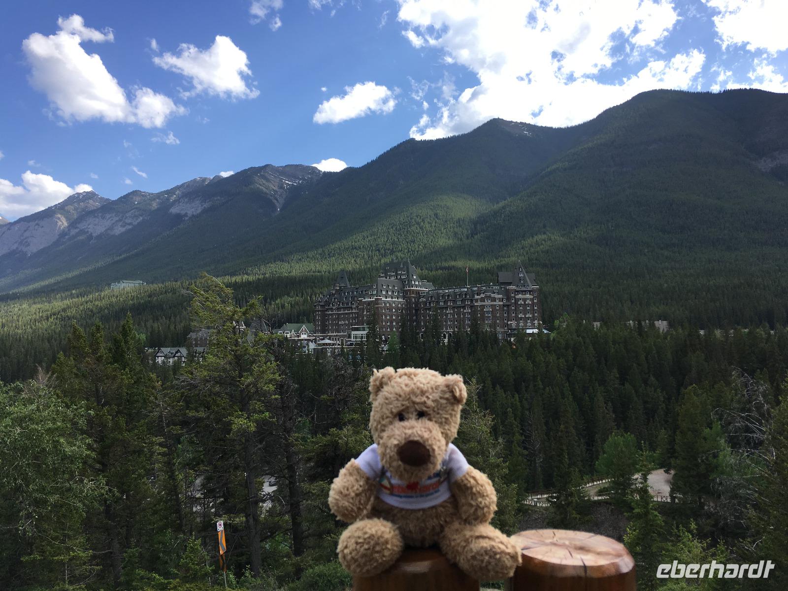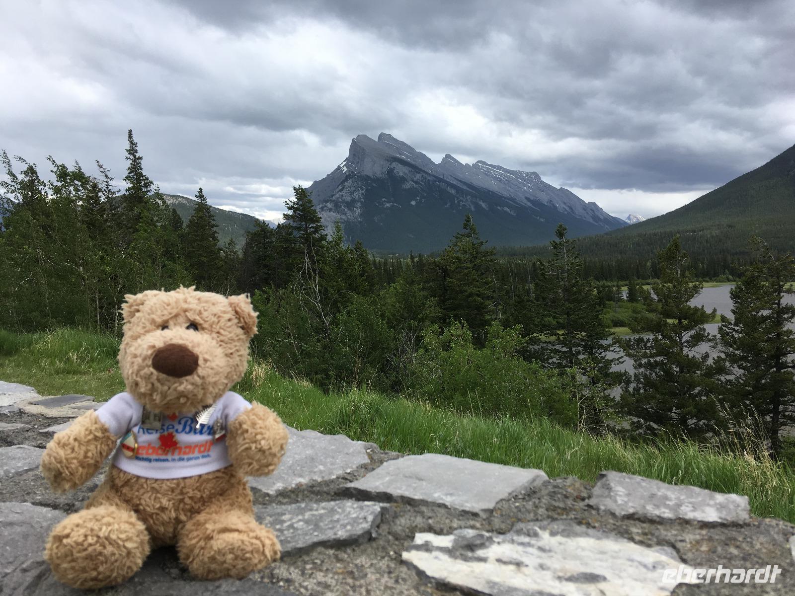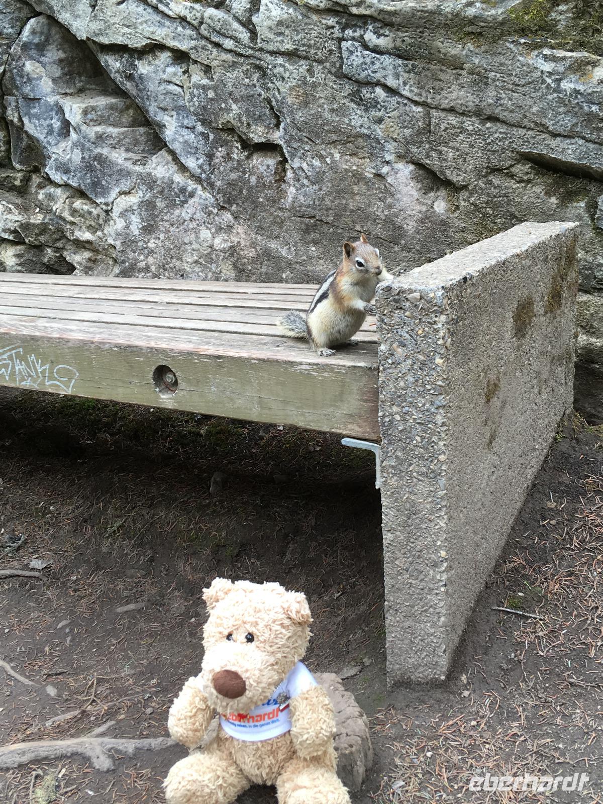 Heute erkunden wir zwei Nationalparks in den Rocky Mountains - den Banff-Nationalpark in in der Provinz Alberta und den Yoho-Nationalpark in der Provinz British Columbia. Der Moraine Lake in der Nachbarschaft des berühmten Lake Louise steht eigentlich nicht auf dem Programm, ist aber mindestens ebenso sehenswert. Leider regnet es heute Vormittag, sodass wir die schöne Färbung und die umliegenden Berggipfel nur erahnen können. Doch das Wetter verleiht der Umgebung auch etwas geheimnisvolles und man kann sich wirklich vorstellen, dass irgendwo dort oben ein Bär oder ein Indianer auf uns herabschaut. Im Lake Louise Village kaufen wir uns etwas zu essen für unser später geplantes Picknick, dann fahren wir nach British Columbia und stoppen an den Spiral Tunnels. Die beiden Kehrtunnel senkten das Maximalgefälle der Eisenbahnstrecke von 4,5 auf 2,2 % und galten bei ihrer Eröffnung 1909 als technische Meisterleistung. Der Emerald Lake im Yoho-Nationalpark liegt herrlich umrahmt von den Bergen und bietet mit der auf einer Insel gelegenen Lodge ein wunderschönes Fotomotiv. Hier am See machen wir auch unsere Mittagspause. Auf der Rückfahrt halten wir an der Natural Bridge, einer natürlichen Steinbrücke, und fahren dann wieder zurück nach Alberta zum Johnston Canyon. Das Wetter hat sich inzwischen deutlich gebessert, die Sonne scheint wieder, sodass einer schönen kleinen Wanderung nichts im Wege steht. Mein Eberhardt-Reisebär hat sogar eine Begegnung mit einem neugierigen Streifenhörnchen. Bei einem weiteren Fotostopp kurz vor Banff sehen wir dann sogar Murmeltiere! Den späten Nachmittag/Abend in Banff können wir heute für eigene Erkundungen nutzen.