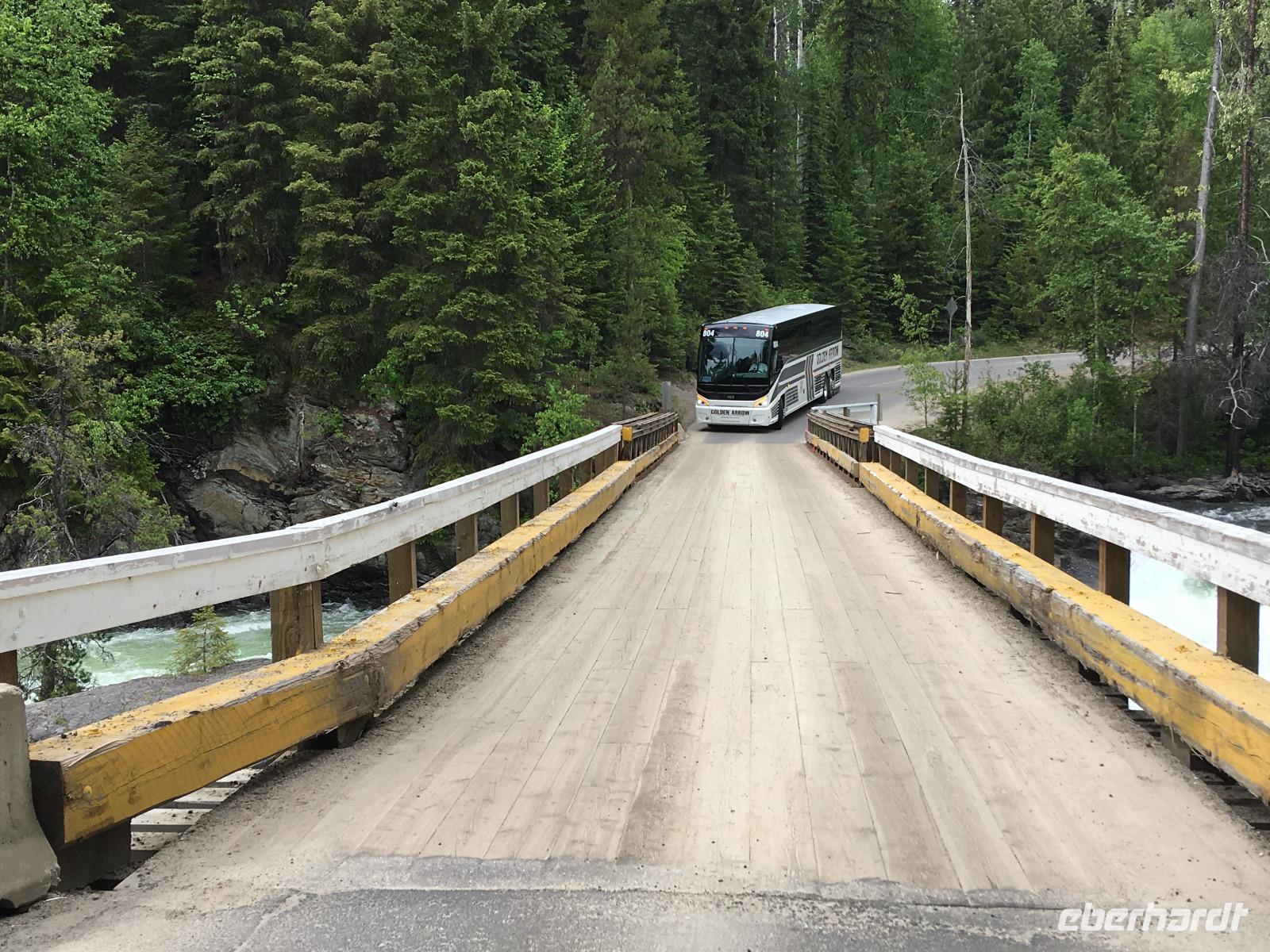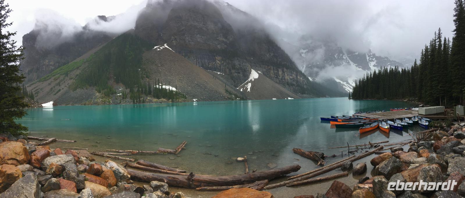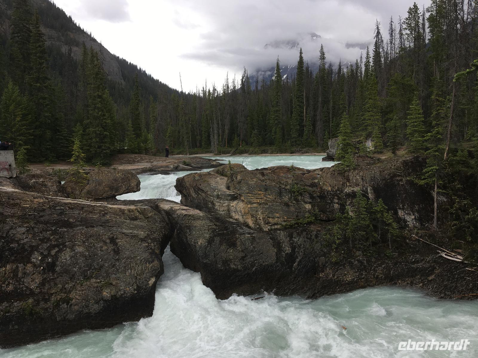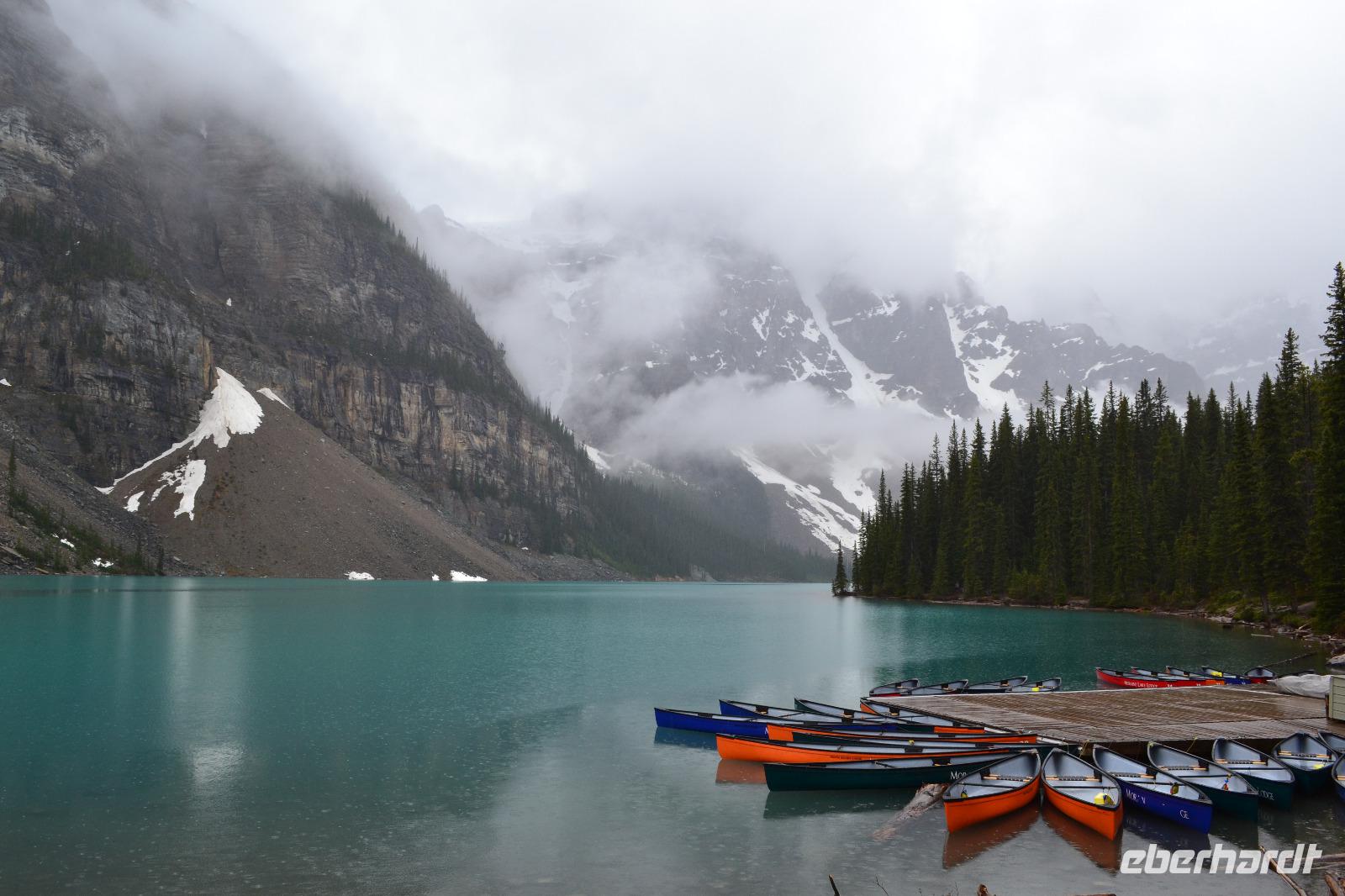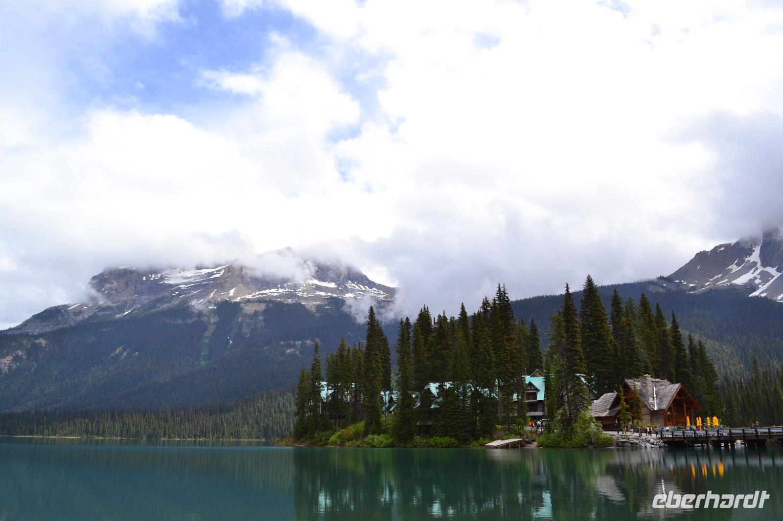 Heute erkunden wir zwei Nationalparks in den Rocky Mountains - den Banff-Nationalpark in in der Provinz Alberta und den Yoho-Nationalpark in der Provinz British Columbia. Der Moraine Lake in der Nachbarschaft des berühmten Lake Louise steht eigentlich nicht auf dem Programm, ist aber mindestens ebenso sehenswert. Leider regnet es heute Vormittag, sodass wir die schöne Färbung und die umliegenden Berggipfel nur erahnen können. Doch das Wetter verleiht der Umgebung auch etwas geheimnisvolles und man kann sich wirklich vorstellen, dass irgendwo dort oben ein Bär oder ein Indianer auf uns herabschaut. Im Lake Louise Village kaufen wir uns etwas zu essen für unser später geplantes Picknick, dann fahren wir nach British Columbia und stoppen an den Spiral Tunnels. Die beiden Kehrtunnel senkten das Maximalgefälle der Eisenbahnstrecke von 4,5 auf 2,2 % und galten bei ihrer Eröffnung 1909 als technische Meisterleistung. Der Emerald Lake im Yoho-Nationalpark liegt herrlich umrahmt von den Bergen und bietet mit der auf einer Insel gelegenen Lodge ein wunderschönes Fotomotiv. Hier am See machen wir auch unsere Mittagspause. Auf der Rückfahrt halten wir an der Natural Bridge, einer natürlichen Steinbrücke, und fahren dann wieder zurück nach Alberta zum Johnston Canyon. Das Wetter hat sich inzwischen deutlich gebessert, die Sonne scheint wieder, sodass einer schönen kleinen Wanderung nichts im Wege steht. Mein Eberhardt-Reisebär hat sogar eine Begegnung mit einem neugierigen Streifenhörnchen. Bei einem weiteren Fotostopp kurz vor Banff sehen wir dann sogar Murmeltiere! Den späten Nachmittag/Abend in Banff können wir heute für eigene Erkundungen nutzen.