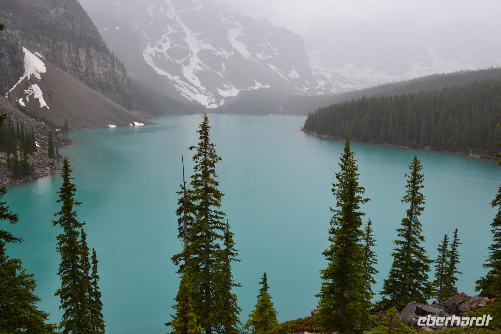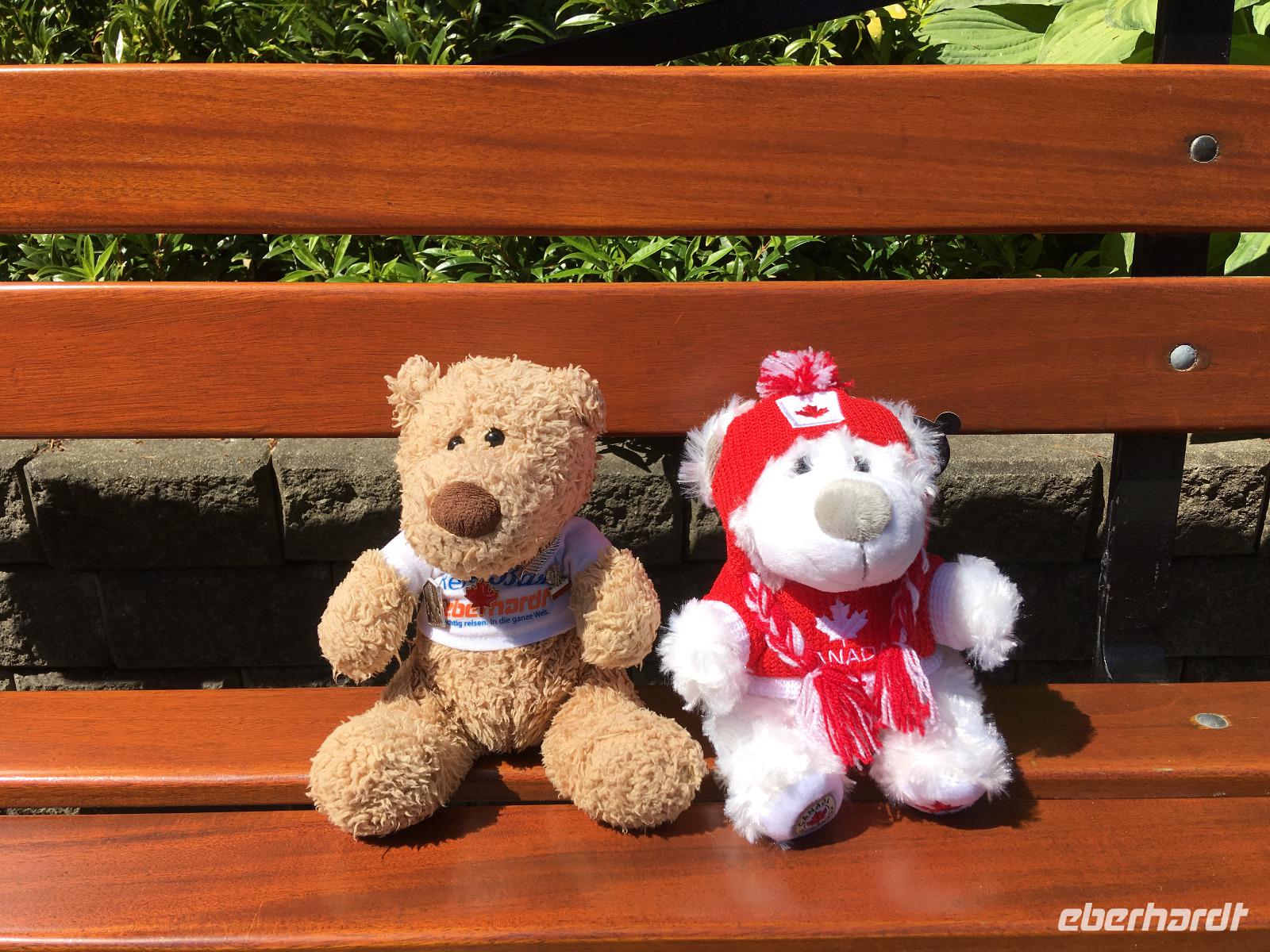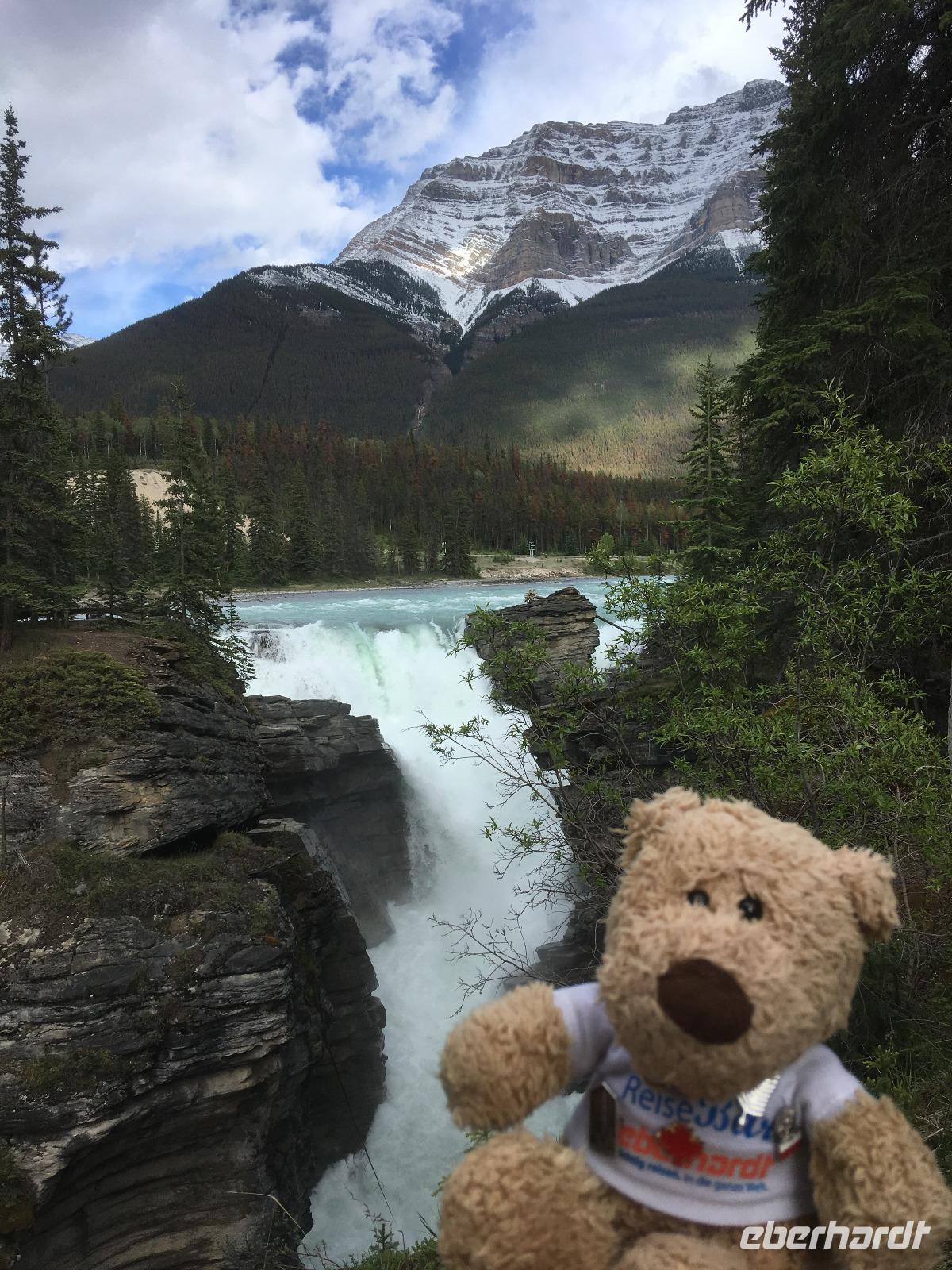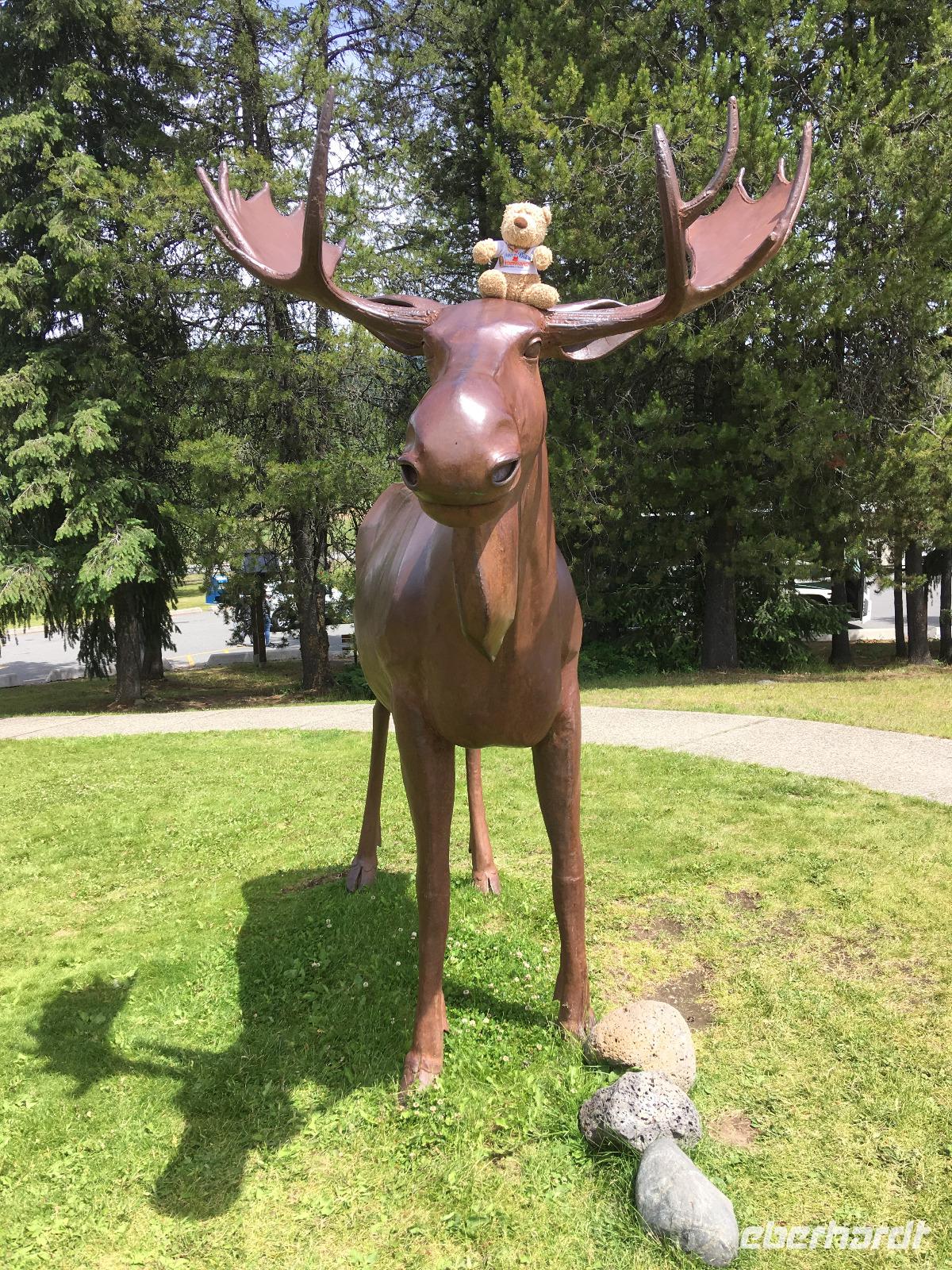 Heute erkunden wir zwei Nationalparks in den Rocky Mountains - den Banff-Nationalpark in in der Provinz Alberta und den Yoho-Nationalpark in der Provinz British Columbia. Der Moraine Lake in der Nachbarschaft des berühmten Lake Louise steht eigentlich nicht auf dem Programm, ist aber mindestens ebenso sehenswert. Leider regnet es heute Vormittag, sodass wir die schöne Färbung und die umliegenden Berggipfel nur erahnen können. Doch das Wetter verleiht der Umgebung auch etwas geheimnisvolles und man kann sich wirklich vorstellen, dass irgendwo dort oben ein Bär oder ein Indianer auf uns herabschaut. Im Lake Louise Village kaufen wir uns etwas zu essen für unser später geplantes Picknick, dann fahren wir nach British Columbia und stoppen an den Spiral Tunnels. Die beiden Kehrtunnel senkten das Maximalgefälle der Eisenbahnstrecke von 4,5 auf 2,2 % und galten bei ihrer Eröffnung 1909 als technische Meisterleistung. Der Emerald Lake im Yoho-Nationalpark liegt herrlich umrahmt von den Bergen und bietet mit der auf einer Insel gelegenen Lodge ein wunderschönes Fotomotiv. Hier am See machen wir auch unsere Mittagspause. Auf der Rückfahrt halten wir an der Natural Bridge, einer natürlichen Steinbrücke, und fahren dann wieder zurück nach Alberta zum Johnston Canyon. Das Wetter hat sich inzwischen deutlich gebessert, die Sonne scheint wieder, sodass einer schönen kleinen Wanderung nichts im Wege steht. Mein Eberhardt-Reisebär hat sogar eine Begegnung mit einem neugierigen Streifenhörnchen. Bei einem weiteren Fotostopp kurz vor Banff sehen wir dann sogar Murmeltiere! Den späten Nachmittag/Abend in Banff können wir heute für eigene Erkundungen nutzen.
