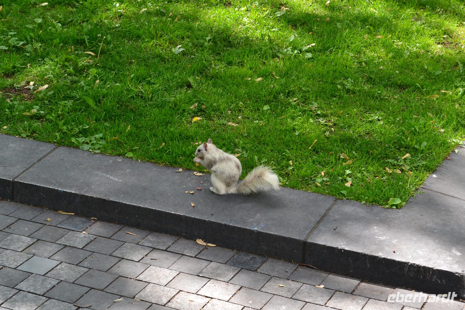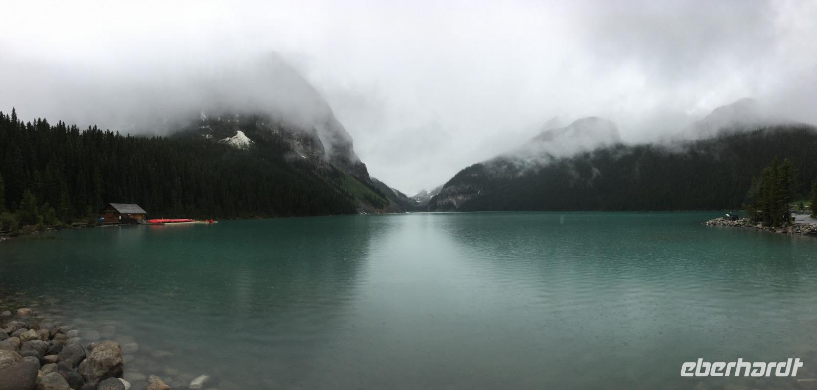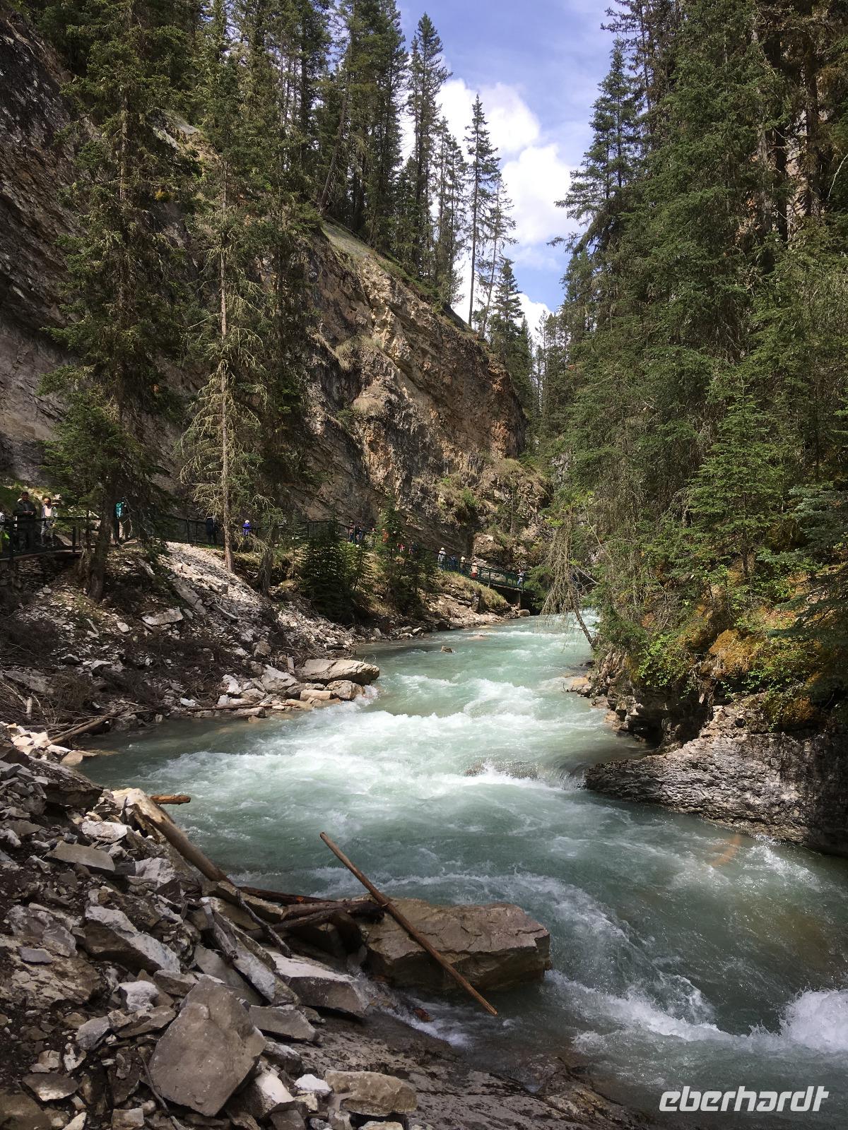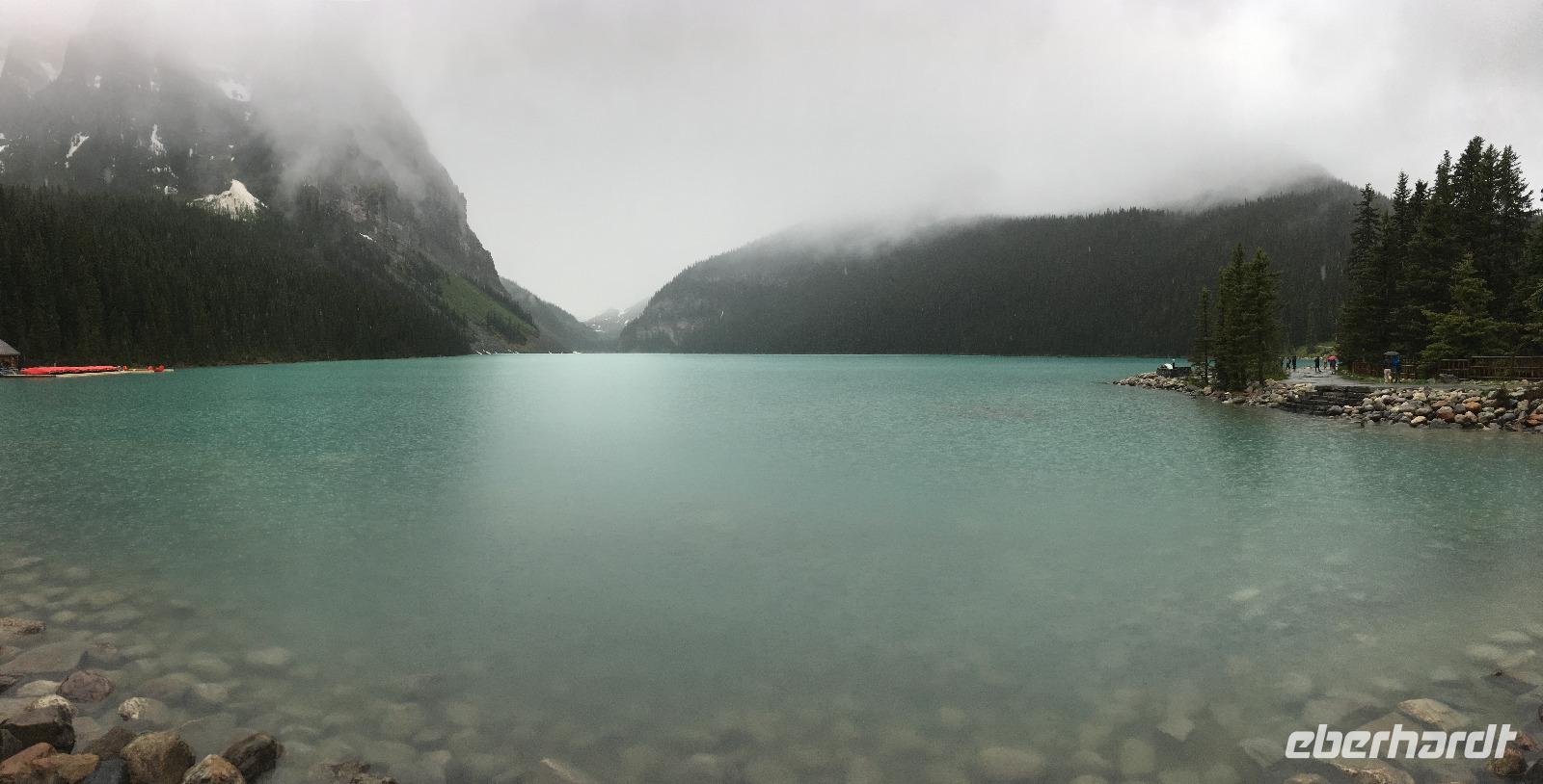 Heute erkunden wir zwei Nationalparks in den Rocky Mountains - den Banff-Nationalpark in in der Provinz Alberta und den Yoho-Nationalpark in der Provinz British Columbia. Der Moraine Lake in der Nachbarschaft des berühmten Lake Louise steht eigentlich nicht auf dem Programm, ist aber mindestens ebenso sehenswert. Leider regnet es heute Vormittag, sodass wir die schöne Färbung und die umliegenden Berggipfel nur erahnen können. Doch das Wetter verleiht der Umgebung auch etwas geheimnisvolles und man kann sich wirklich vorstellen, dass irgendwo dort oben ein Bär oder ein Indianer auf uns herabschaut. Im Lake Louise Village kaufen wir uns etwas zu essen für unser später geplantes Picknick, dann fahren wir nach British Columbia und stoppen an den Spiral Tunnels. Die beiden Kehrtunnel senkten das Maximalgefälle der Eisenbahnstrecke von 4,5 auf 2,2 % und galten bei ihrer Eröffnung 1909 als technische Meisterleistung. Der Emerald Lake im Yoho-Nationalpark liegt herrlich umrahmt von den Bergen und bietet mit der auf einer Insel gelegenen Lodge ein wunderschönes Fotomotiv. Hier am See machen wir auch unsere Mittagspause. Auf der Rückfahrt halten wir an der Natural Bridge, einer natürlichen Steinbrücke, und fahren dann wieder zurück nach Alberta zum Johnston Canyon. Das Wetter hat sich inzwischen deutlich gebessert, die Sonne scheint wieder, sodass einer schönen kleinen Wanderung nichts im Wege steht. Mein Eberhardt-Reisebär hat sogar eine Begegnung mit einem neugierigen Streifenhörnchen. Bei einem weiteren Fotostopp kurz vor Banff sehen wir dann sogar Murmeltiere! Den späten Nachmittag/Abend in Banff können wir heute für eigene Erkundungen nutzen.