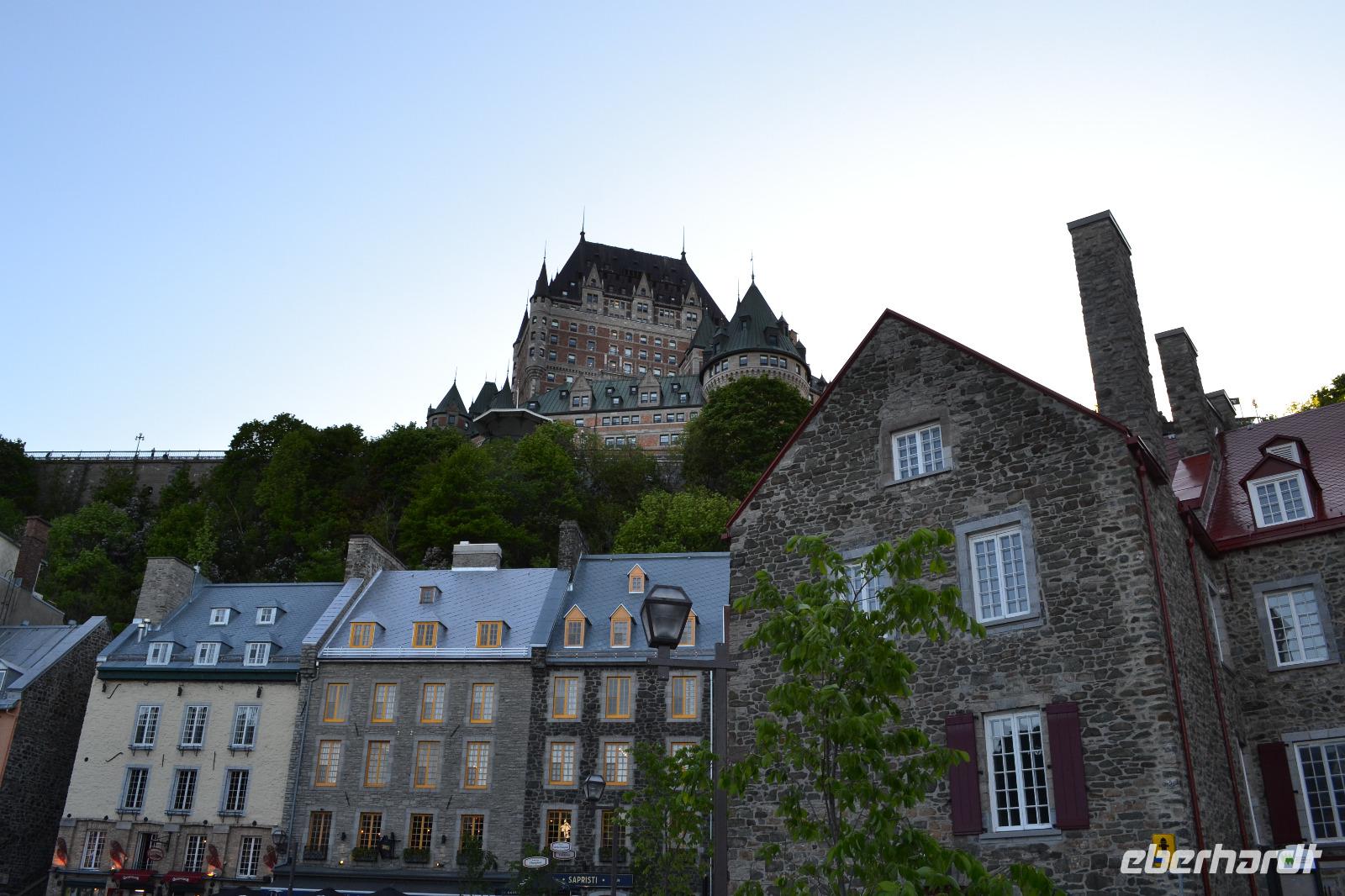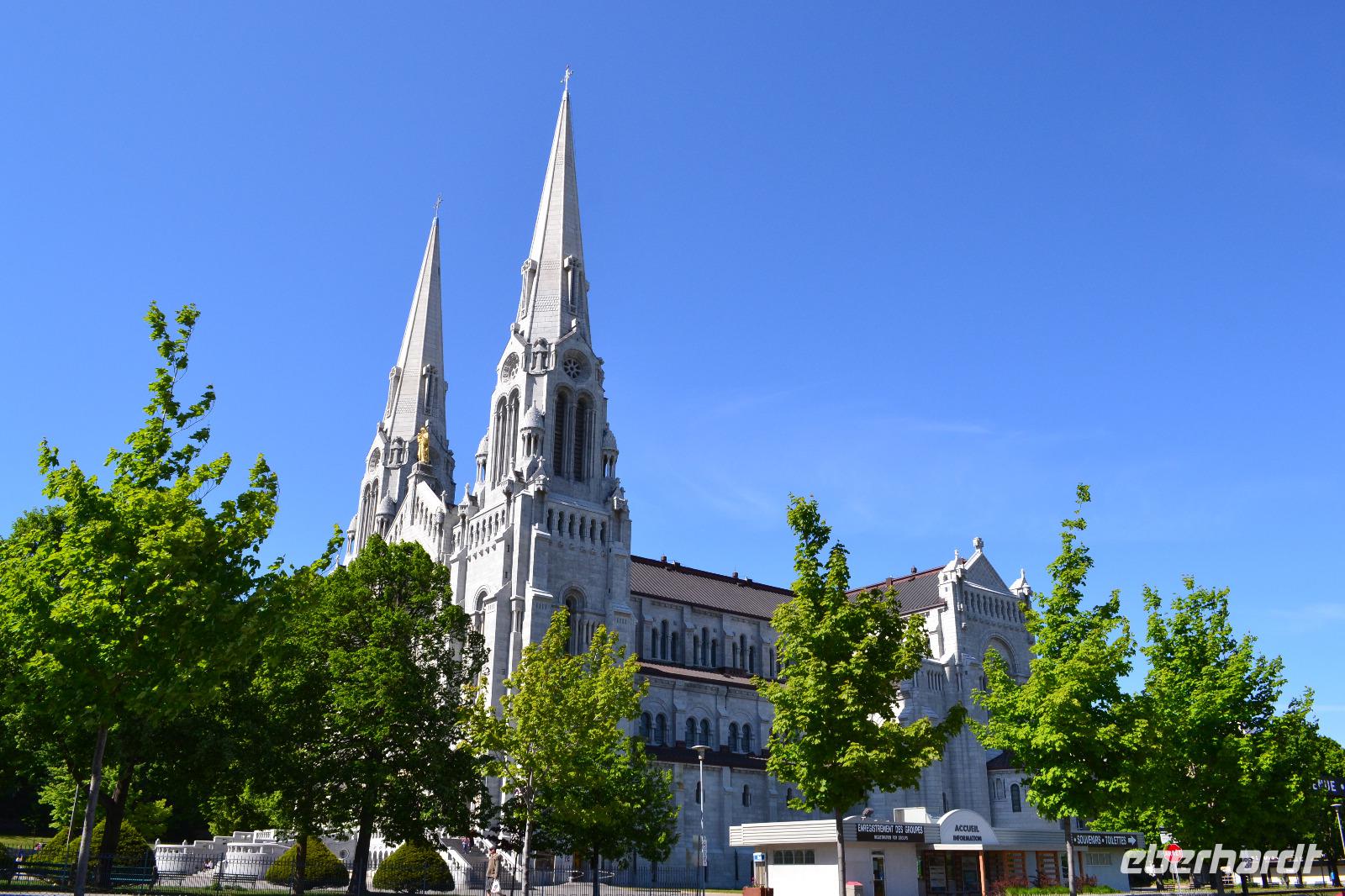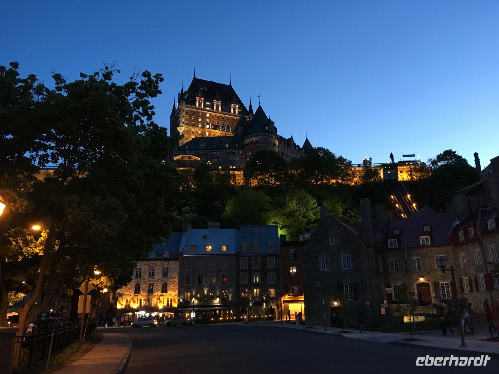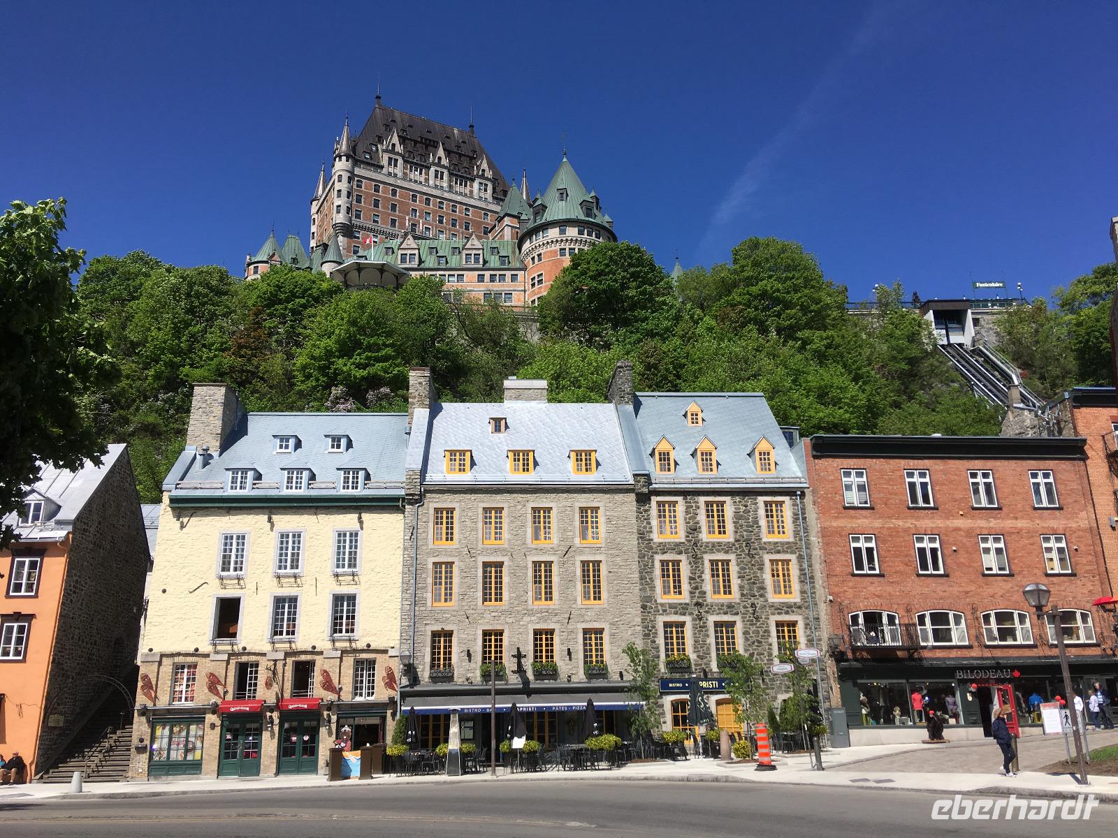 Am nächsten Morgen holt uns Celine wieder vom Hotel ab und wir setzen unsere Erkundungstour fort. Unser erstes Ziel ist die Kathedrale Notre Dame. Die römisch-katholische Basilika im neugotischen Stil wurde von einem protestantischen Architekten aus New York entworfen und ab 1824 erbaut. Kurz vor seinem Tod trat der Architekt zum katholischen Glauben über, damit er in der Krypta unter „seiner" Kirche begraben werden konnte. Auch unser nächster Halt ist an einer Kirche - an der anglikanischen Christ Church Cathedral, erbaut in den Jahren 1857 bis 1859. Wir gehen allerdings nicht hinein, sondern fahren mit der Rolltreppe unter die Kirche in die unterirdische Stadt. Zum Glück ist Celine dabei, denn hier in den Einkaufspassagen könnten wir uns wirklich verlaufen. Das Netzwerk von unterirdischen Passagen hilft den Einwohnern von Montréal im Winter, trotz vereister Straßen und sich stapelnder Schneemassen morgens zur Arbeit und abends wieder nach Hause zu gelangen. Wir wollen aber weder arbeiten noch shoppen, sondern uns die Sehenswürdigkeiten von Montréal anschauen, weshalb uns Celine noch bis zum Rathaus bringt, wo wir uns von ihr verabschieden. Die quirlige Altstadt zwischen Rathaus und ehemaligem Hafengelände können wir nun bei sehr schönem Wetter auf eigene Faust erkunden, bevor wir uns gegen Mittag wieder am Bus treffen. Bevor wir Montréal endgültig verlassen, habe ich meinen Gästen noch versprochen, dass wir auf den namensgebenden Hügel, Verzeihung: den königlichen Berg, hinauffahren. Dort befinden sich zwei sehr schöne Aussichtspunkte, die uns einen Blick Richtung Innenstadt und Hafen bzw. Richtung Olympiagelände eröffnen. Jetzt müssen wir aber wirklich aus der Stadt raus, denn bis Québec liegen einige Kilometer vorwärts, zumal ich gern die Panoramastrecke am Ufer des Sankt-Lorenz-Stroms nehmen möchte, der uns durch kleine Dörfchen mit hübschen Häuschen führt. An der Wallfahrtskirche Notre-Dame-du-Cap in Trois-Rivières legen wir einen Zwischenstopp ein. An diesem Ort sollen sich zwei Wunder ereignet haben - zuerst soll sich eine Brücke aus Eis über den Sankt-Lorenz-Strom geformt und später dann soll die Marienstatue in der alten Kirche (eine der ältesten Steinkirchen Nordamerikas) vor drei Zeugen ihre Augen geöffnet haben. Architektonisch interessant ist die moderne Basilika auf jeden Fall - es findet sogar gerade ein Gottesdienst statt - doch bzgl. der Wunder bin ich sehr skeptisch. Am Abend erreichen wir dann Québec City, und spätestens als wir vor dem Abendessen durch die gerade sehr ruhige untere Altstadt wandeln und über uns das von der Abendsonne angestrahlte Château Frontenac erblicken, ist es um uns geschehen.