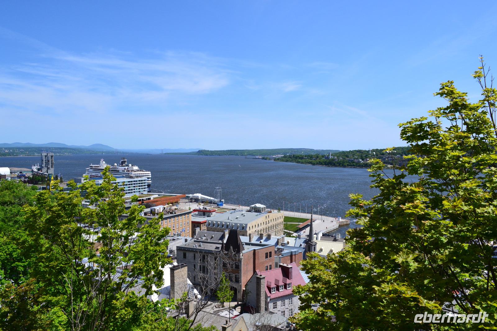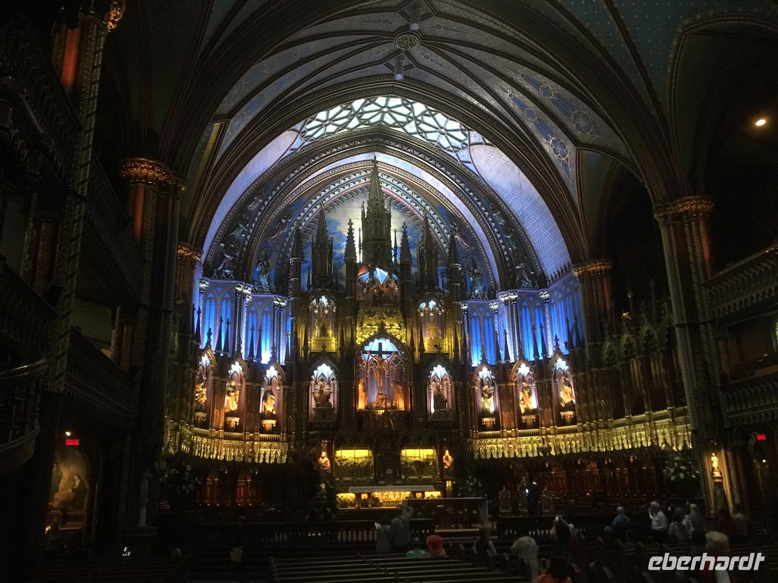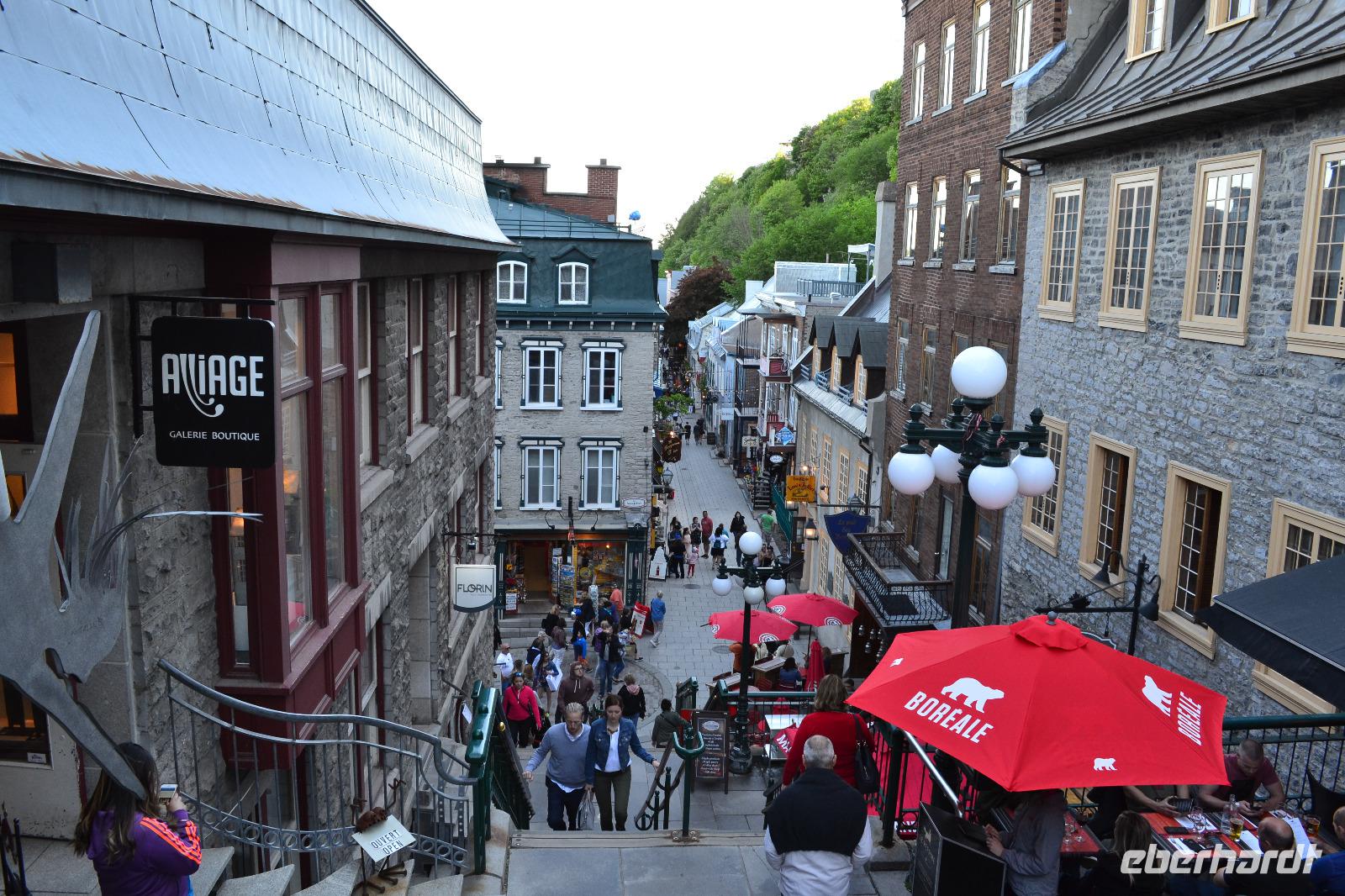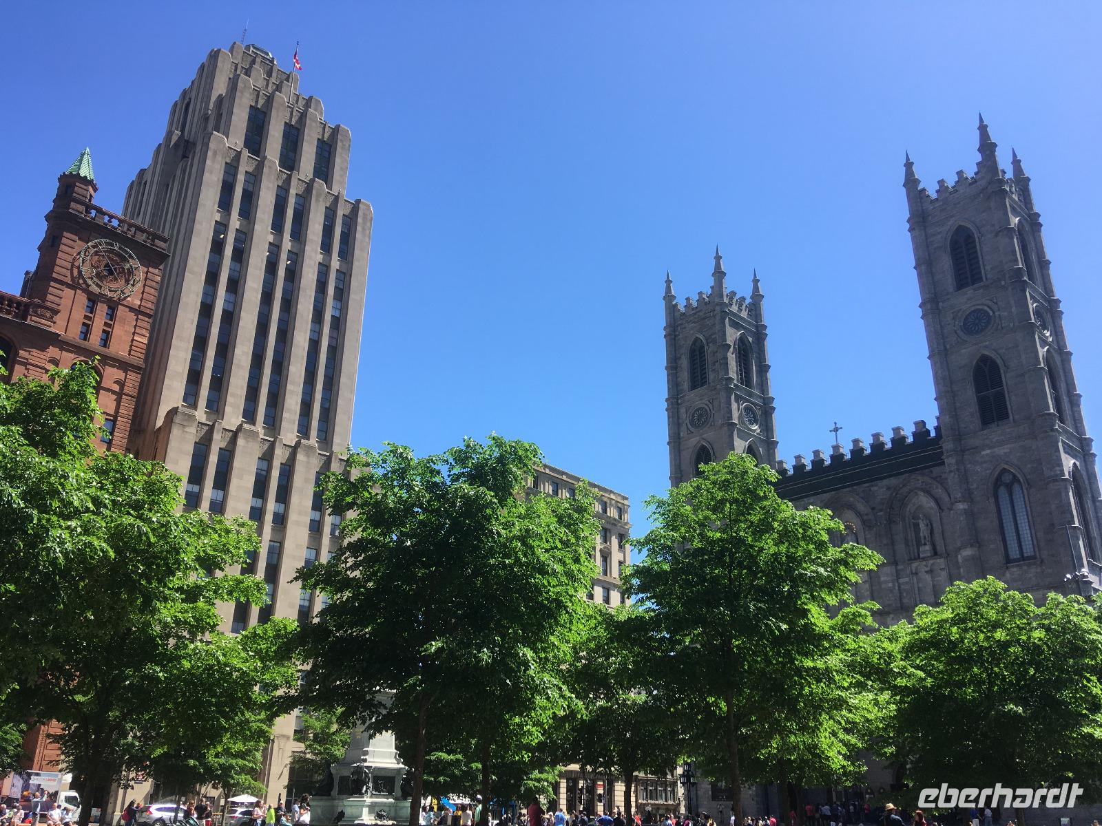 Am nächsten Morgen holt uns Celine wieder vom Hotel ab und wir setzen unsere Erkundungstour fort. Unser erstes Ziel ist die Kathedrale Notre Dame. Die römisch-katholische Basilika im neugotischen Stil wurde von einem protestantischen Architekten aus New York entworfen und ab 1824 erbaut. Kurz vor seinem Tod trat der Architekt zum katholischen Glauben über, damit er in der Krypta unter „seiner" Kirche begraben werden konnte. Auch unser nächster Halt ist an einer Kirche - an der anglikanischen Christ Church Cathedral, erbaut in den Jahren 1857 bis 1859. Wir gehen allerdings nicht hinein, sondern fahren mit der Rolltreppe unter die Kirche in die unterirdische Stadt. Zum Glück ist Celine dabei, denn hier in den Einkaufspassagen könnten wir uns wirklich verlaufen. Das Netzwerk von unterirdischen Passagen hilft den Einwohnern von Montréal im Winter, trotz vereister Straßen und sich stapelnder Schneemassen morgens zur Arbeit und abends wieder nach Hause zu gelangen. Wir wollen aber weder arbeiten noch shoppen, sondern uns die Sehenswürdigkeiten von Montréal anschauen, weshalb uns Celine noch bis zum Rathaus bringt, wo wir uns von ihr verabschieden. Die quirlige Altstadt zwischen Rathaus und ehemaligem Hafengelände können wir nun bei sehr schönem Wetter auf eigene Faust erkunden, bevor wir uns gegen Mittag wieder am Bus treffen. Bevor wir Montréal endgültig verlassen, habe ich meinen Gästen noch versprochen, dass wir auf den namensgebenden Hügel, Verzeihung: den königlichen Berg, hinauffahren. Dort befinden sich zwei sehr schöne Aussichtspunkte, die uns einen Blick Richtung Innenstadt und Hafen bzw. Richtung Olympiagelände eröffnen. Jetzt müssen wir aber wirklich aus der Stadt raus, denn bis Québec liegen einige Kilometer vorwärts, zumal ich gern die Panoramastrecke am Ufer des Sankt-Lorenz-Stroms nehmen möchte, der uns durch kleine Dörfchen mit hübschen Häuschen führt. An der Wallfahrtskirche Notre-Dame-du-Cap in Trois-Rivières legen wir einen Zwischenstopp ein. An diesem Ort sollen sich zwei Wunder ereignet haben - zuerst soll sich eine Brücke aus Eis über den Sankt-Lorenz-Strom geformt und später dann soll die Marienstatue in der alten Kirche (eine der ältesten Steinkirchen Nordamerikas) vor drei Zeugen ihre Augen geöffnet haben. Architektonisch interessant ist die moderne Basilika auf jeden Fall - es findet sogar gerade ein Gottesdienst statt - doch bzgl. der Wunder bin ich sehr skeptisch. Am Abend erreichen wir dann Québec City, und spätestens als wir vor dem Abendessen durch die gerade sehr ruhige untere Altstadt wandeln und über uns das von der Abendsonne angestrahlte Château Frontenac erblicken, ist es um uns geschehen.