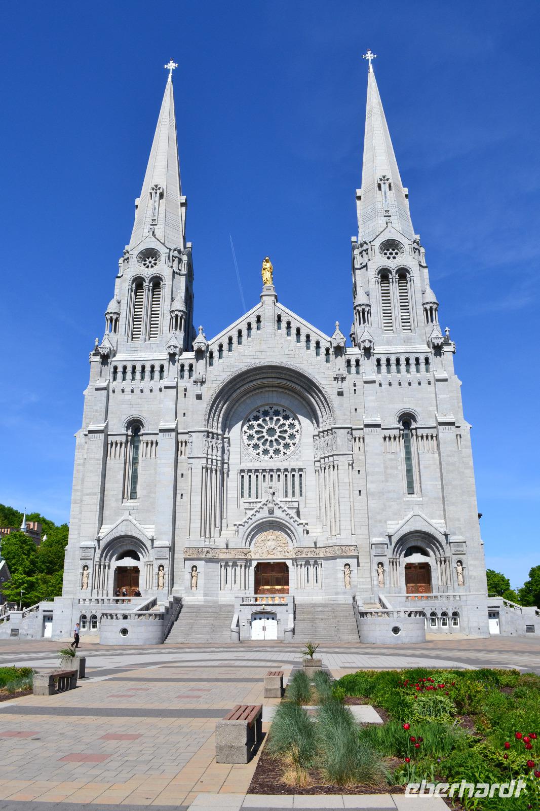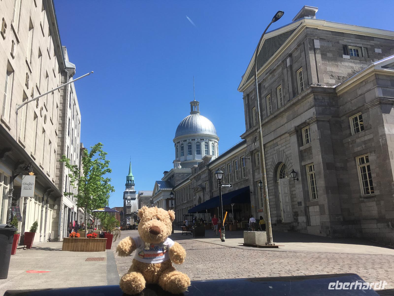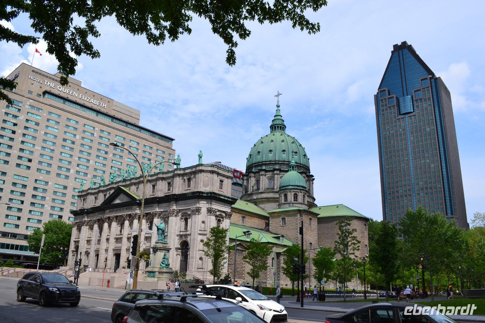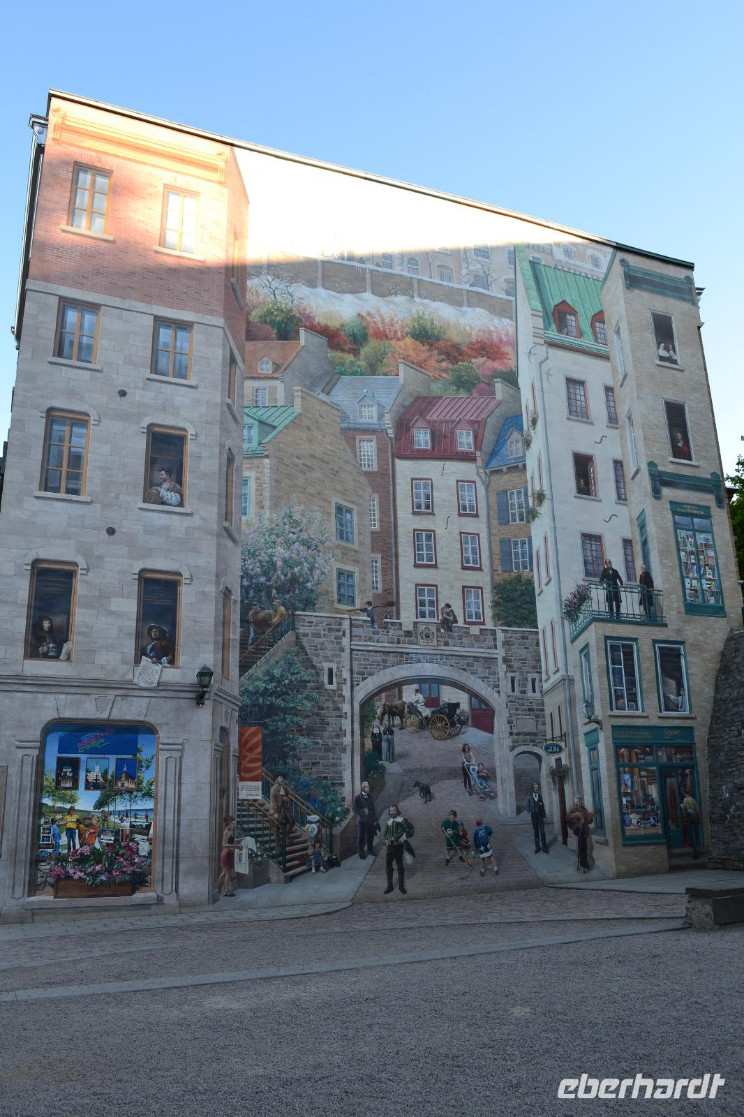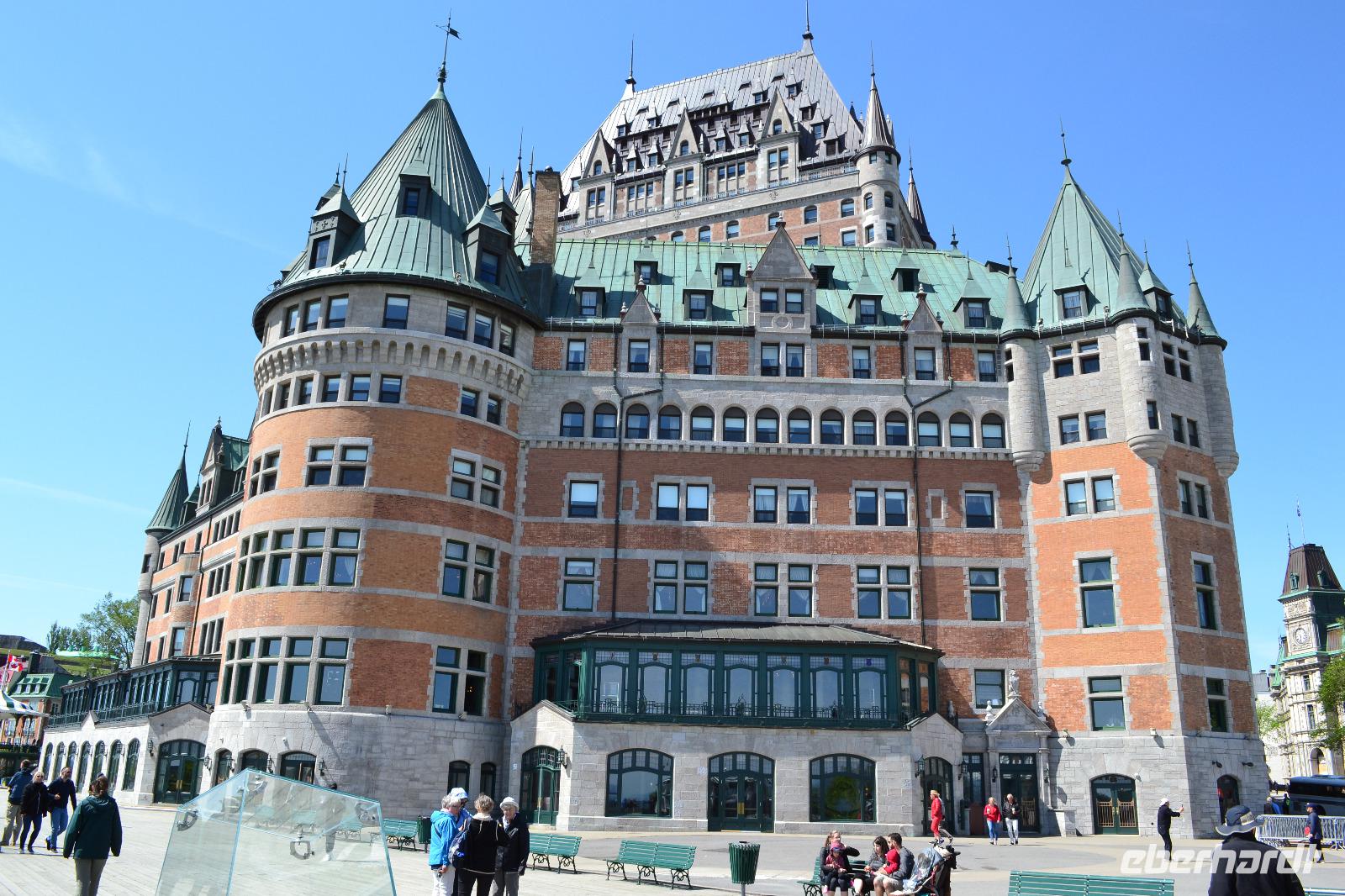 Am nächsten Morgen holt uns Celine wieder vom Hotel ab und wir setzen unsere Erkundungstour fort. Unser erstes Ziel ist die Kathedrale Notre Dame. Die römisch-katholische Basilika im neugotischen Stil wurde von einem protestantischen Architekten aus New York entworfen und ab 1824 erbaut. Kurz vor seinem Tod trat der Architekt zum katholischen Glauben über, damit er in der Krypta unter „seiner" Kirche begraben werden konnte. Auch unser nächster Halt ist an einer Kirche - an der anglikanischen Christ Church Cathedral, erbaut in den Jahren 1857 bis 1859. Wir gehen allerdings nicht hinein, sondern fahren mit der Rolltreppe unter die Kirche in die unterirdische Stadt. Zum Glück ist Celine dabei, denn hier in den Einkaufspassagen könnten wir uns wirklich verlaufen. Das Netzwerk von unterirdischen Passagen hilft den Einwohnern von Montréal im Winter, trotz vereister Straßen und sich stapelnder Schneemassen morgens zur Arbeit und abends wieder nach Hause zu gelangen. Wir wollen aber weder arbeiten noch shoppen, sondern uns die Sehenswürdigkeiten von Montréal anschauen, weshalb uns Celine noch bis zum Rathaus bringt, wo wir uns von ihr verabschieden. Die quirlige Altstadt zwischen Rathaus und ehemaligem Hafengelände können wir nun bei sehr schönem Wetter auf eigene Faust erkunden, bevor wir uns gegen Mittag wieder am Bus treffen. Bevor wir Montréal endgültig verlassen, habe ich meinen Gästen noch versprochen, dass wir auf den namensgebenden Hügel, Verzeihung: den königlichen Berg, hinauffahren. Dort befinden sich zwei sehr schöne Aussichtspunkte, die uns einen Blick Richtung Innenstadt und Hafen bzw. Richtung Olympiagelände eröffnen. Jetzt müssen wir aber wirklich aus der Stadt raus, denn bis Québec liegen einige Kilometer vorwärts, zumal ich gern die Panoramastrecke am Ufer des Sankt-Lorenz-Stroms nehmen möchte, der uns durch kleine Dörfchen mit hübschen Häuschen führt. An der Wallfahrtskirche Notre-Dame-du-Cap in Trois-Rivières legen wir einen Zwischenstopp ein. An diesem Ort sollen sich zwei Wunder ereignet haben - zuerst soll sich eine Brücke aus Eis über den Sankt-Lorenz-Strom geformt und später dann soll die Marienstatue in der alten Kirche (eine der ältesten Steinkirchen Nordamerikas) vor drei Zeugen ihre Augen geöffnet haben. Architektonisch interessant ist die moderne Basilika auf jeden Fall - es findet sogar gerade ein Gottesdienst statt - doch bzgl. der Wunder bin ich sehr skeptisch. Am Abend erreichen wir dann Québec City, und spätestens als wir vor dem Abendessen durch die gerade sehr ruhige untere Altstadt wandeln und über uns das von der Abendsonne angestrahlte Château Frontenac erblicken, ist es um uns geschehen.