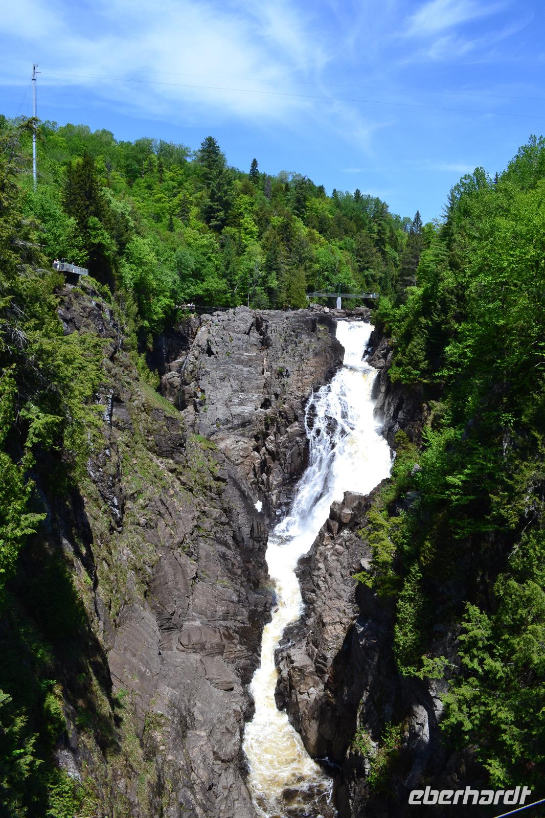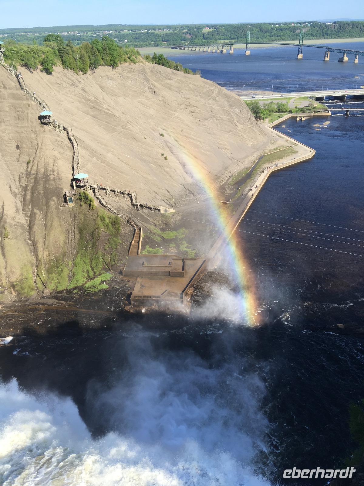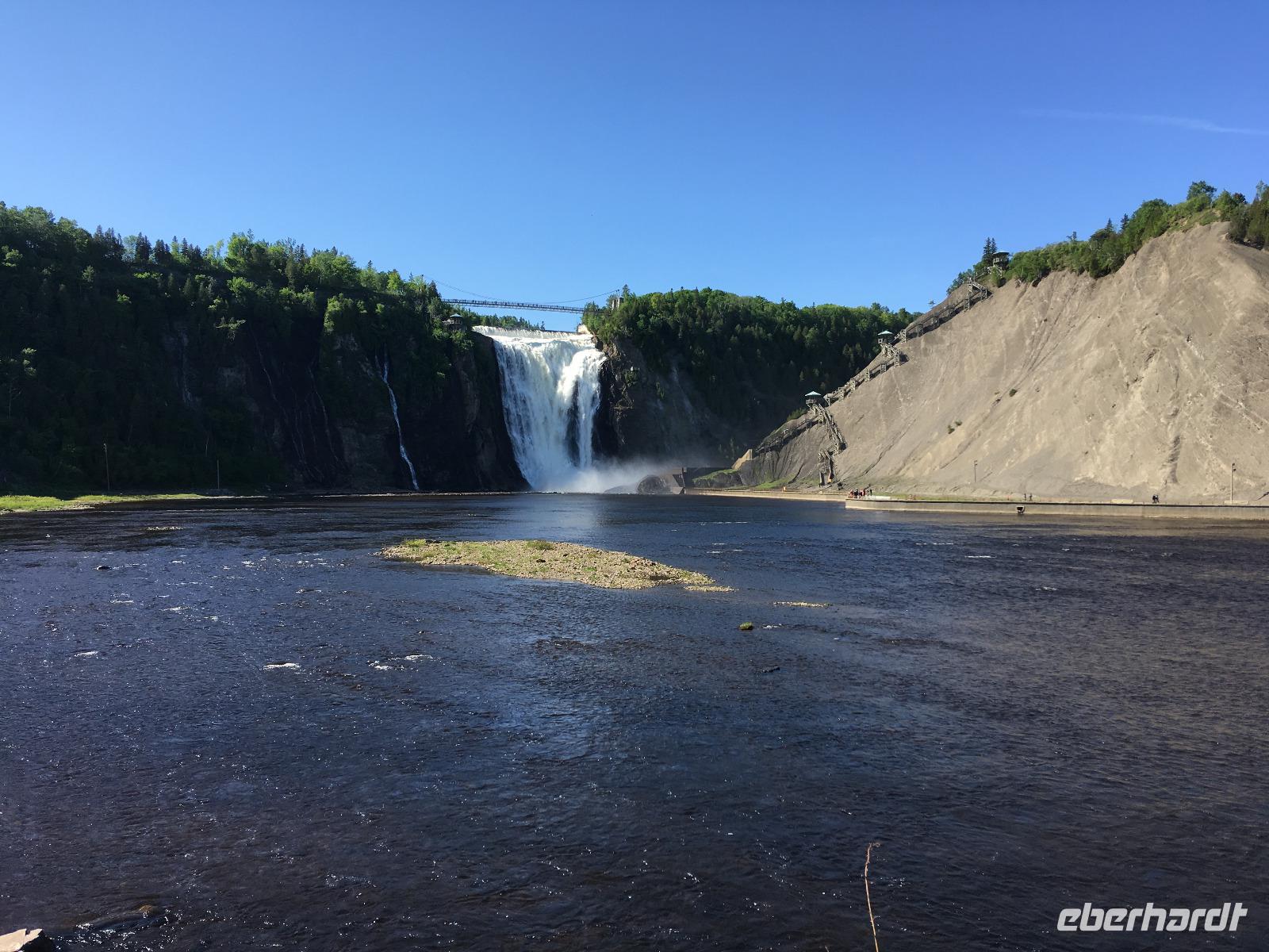 Am nächsten Morgen erkunden wir die Hauptstadt der gleichnamigen Provinz dann zusammen mit unserer Stadtführerin Silke. Gemeinsam besichtigen wir zunächst die obere Altstadt mit den Plains of Abraham, auf dem die schicksalhafte Schlacht zwischen Engländern und Franzosen stattfand, dem Parlamentsgebäude und dem Château und dann zu Fuß die untere Altstadt. In den pittoresken Gassen fühlen wir uns schnell in das mittelalterliche Europa zurückversetzt. Bis zum Mittag haben meine Gäste noch einmal etwas Freizeit, aber jetzt herrscht schon etwas mehr Gewimmel in den Gassen, als am gestrigen Abend. Den Nachmittag verbringen wir dann östlich der Stadt am Sankt-Lorenz-Strom. Unser erstes Ziel ist dabei der Canyon Sainte-Anne. Wir spazieren gemütlich über drei Brücken entlang hinunter in die Schlucht und wieder hinauf und bewundern dabei den herrlichen Wasserfall inmitten dieser unbeschreiblich schönen Natur. Zweiter Zwischenstopp ist das Sanctuaire de Sainte-Anne-de-Beaupré, die wichtigste Wallfahrtskirche Nordamerikas. Die 91 m hohe und 105 m lange katholische Basilika im neugotischen Stil wurde 1926 fertiggestellt. Von den zahlreichen Wunderheilungen, die sich hier ereignet haben sollen, zeugen die vielen Geh- und Krückstöcke im Eingangsbereich des Hauptschiffs. Habe ich eigentlich schon erwähnt, dass wir auch heute wieder tolles Wetter haben? Ideale Voraussetzungen also für die Besichtigung des Montmorency-Wasserfalls. Mit 84 m ist er sogar 30 m höher als die Niagarafälle! Wir halten zuerst am Besucherzentrum unterhalb des Wasserfalls für einen Fotostopp, bevor wir dann hinauffahren und den Wasserfall und seine unmittelbare Umgebung zu Fuß erkunden. Anschließend fahren wir gleich weiter zum Restaurant „Erabliere Du Lac-Beauport" etwas außerhalb, wo unser Abendessen auf uns wartet. Zunächst wird uns hier die Herstellung des berühmten Ahornsirups erklärt, die die europäischen Siedler von den First Nations erlernt haben. Ein mühevoller Prozess! Heute geht natürlich dank der Industrialisierung alles viel einfacher. Dann werden wir bei Live-Musik mit traditionellen Québecer Speisen bewirtet. Doch so viel, wie auf dem Tisch steht (und es wird immer nachgefüllt) können wir gar nicht essen! Gemeinsam mit einer französischen Reisegruppe werden wir zum Mitsingen und -tanzen aufgefordert und tragen so trotz Sprachbarriere unseren Teil zur Völkerverständigung bei. Ich tanze sogar diesmal auch mit, was ich mich vorher noch nie getraut habe! Bevor wir in unser Hotel zurückkehren, können wir noch von uns selbst hergestelltes Ahorn-Toffee probieren.