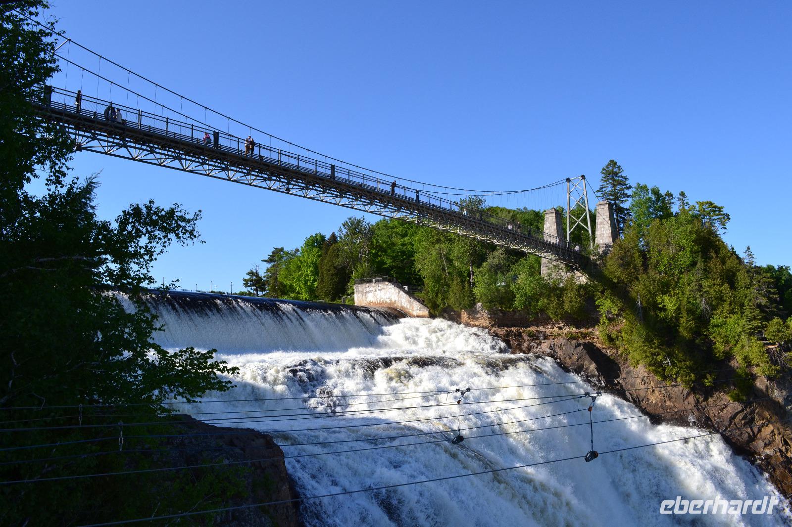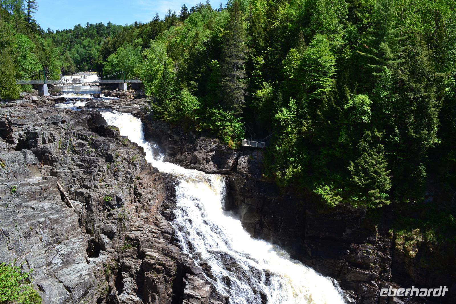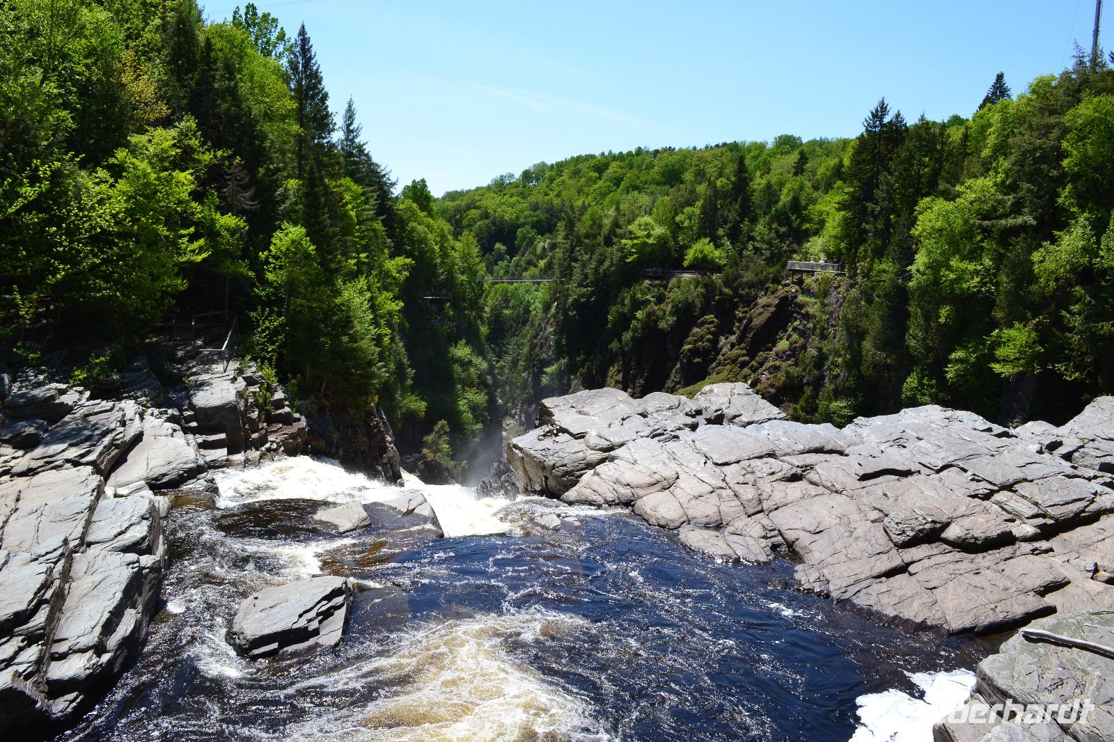 Am nächsten Morgen erkunden wir die Hauptstadt der gleichnamigen Provinz dann zusammen mit unserer Stadtführerin Silke. Gemeinsam besichtigen wir zunächst die obere Altstadt mit den Plains of Abraham, auf dem die schicksalhafte Schlacht zwischen Engländern und Franzosen stattfand, dem Parlamentsgebäude und dem Château und dann zu Fuß die untere Altstadt. In den pittoresken Gassen fühlen wir uns schnell in das mittelalterliche Europa zurückversetzt. Bis zum Mittag haben meine Gäste noch einmal etwas Freizeit, aber jetzt herrscht schon etwas mehr Gewimmel in den Gassen, als am gestrigen Abend. Den Nachmittag verbringen wir dann östlich der Stadt am Sankt-Lorenz-Strom. Unser erstes Ziel ist dabei der Canyon Sainte-Anne. Wir spazieren gemütlich über drei Brücken entlang hinunter in die Schlucht und wieder hinauf und bewundern dabei den herrlichen Wasserfall inmitten dieser unbeschreiblich schönen Natur. Zweiter Zwischenstopp ist das Sanctuaire de Sainte-Anne-de-Beaupré, die wichtigste Wallfahrtskirche Nordamerikas. Die 91 m hohe und 105 m lange katholische Basilika im neugotischen Stil wurde 1926 fertiggestellt. Von den zahlreichen Wunderheilungen, die sich hier ereignet haben sollen, zeugen die vielen Geh- und Krückstöcke im Eingangsbereich des Hauptschiffs. Habe ich eigentlich schon erwähnt, dass wir auch heute wieder tolles Wetter haben? Ideale Voraussetzungen also für die Besichtigung des Montmorency-Wasserfalls. Mit 84 m ist er sogar 30 m höher als die Niagarafälle! Wir halten zuerst am Besucherzentrum unterhalb des Wasserfalls für einen Fotostopp, bevor wir dann hinauffahren und den Wasserfall und seine unmittelbare Umgebung zu Fuß erkunden. Anschließend fahren wir gleich weiter zum Restaurant „Erabliere Du Lac-Beauport" etwas außerhalb, wo unser Abendessen auf uns wartet. Zunächst wird uns hier die Herstellung des berühmten Ahornsirups erklärt, die die europäischen Siedler von den First Nations erlernt haben. Ein mühevoller Prozess! Heute geht natürlich dank der Industrialisierung alles viel einfacher. Dann werden wir bei Live-Musik mit traditionellen Québecer Speisen bewirtet. Doch so viel, wie auf dem Tisch steht (und es wird immer nachgefüllt) können wir gar nicht essen! Gemeinsam mit einer französischen Reisegruppe werden wir zum Mitsingen und -tanzen aufgefordert und tragen so trotz Sprachbarriere unseren Teil zur Völkerverständigung bei. Ich tanze sogar diesmal auch mit, was ich mich vorher noch nie getraut habe! Bevor wir in unser Hotel zurückkehren, können wir noch von uns selbst hergestelltes Ahorn-Toffee probieren.