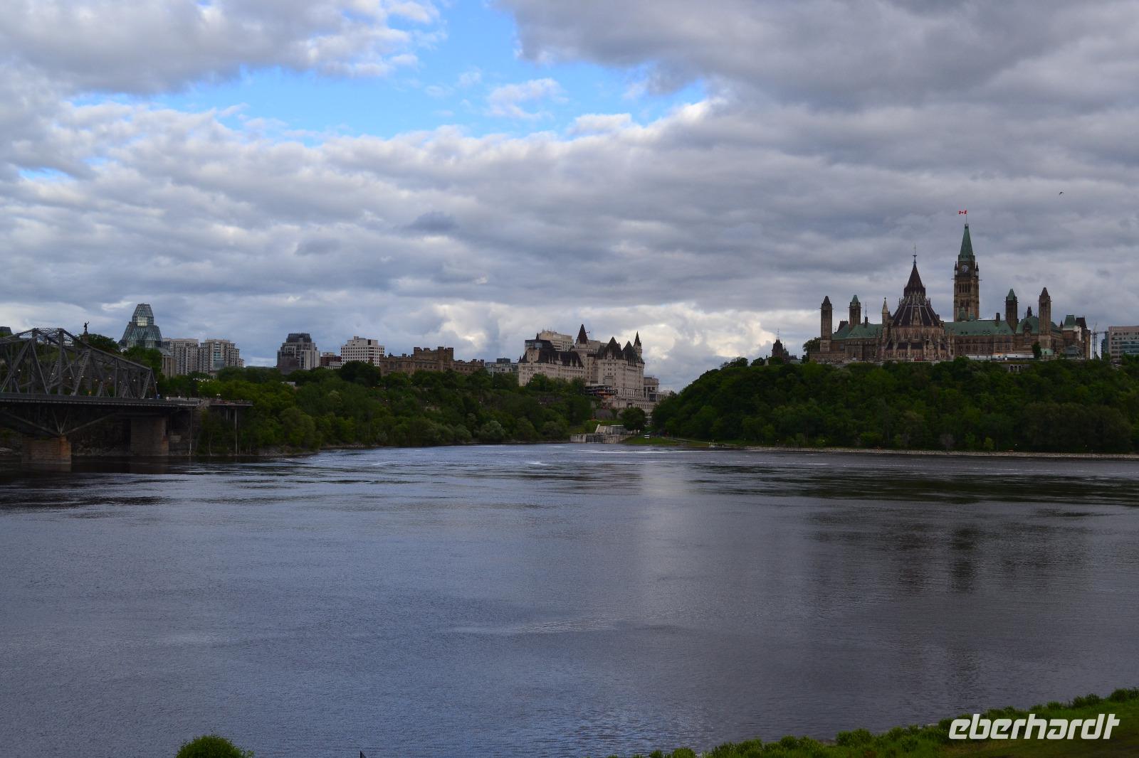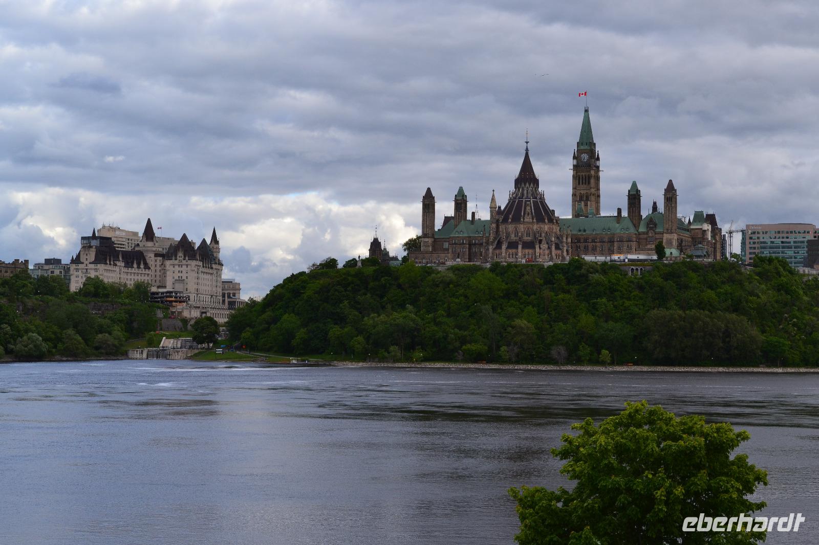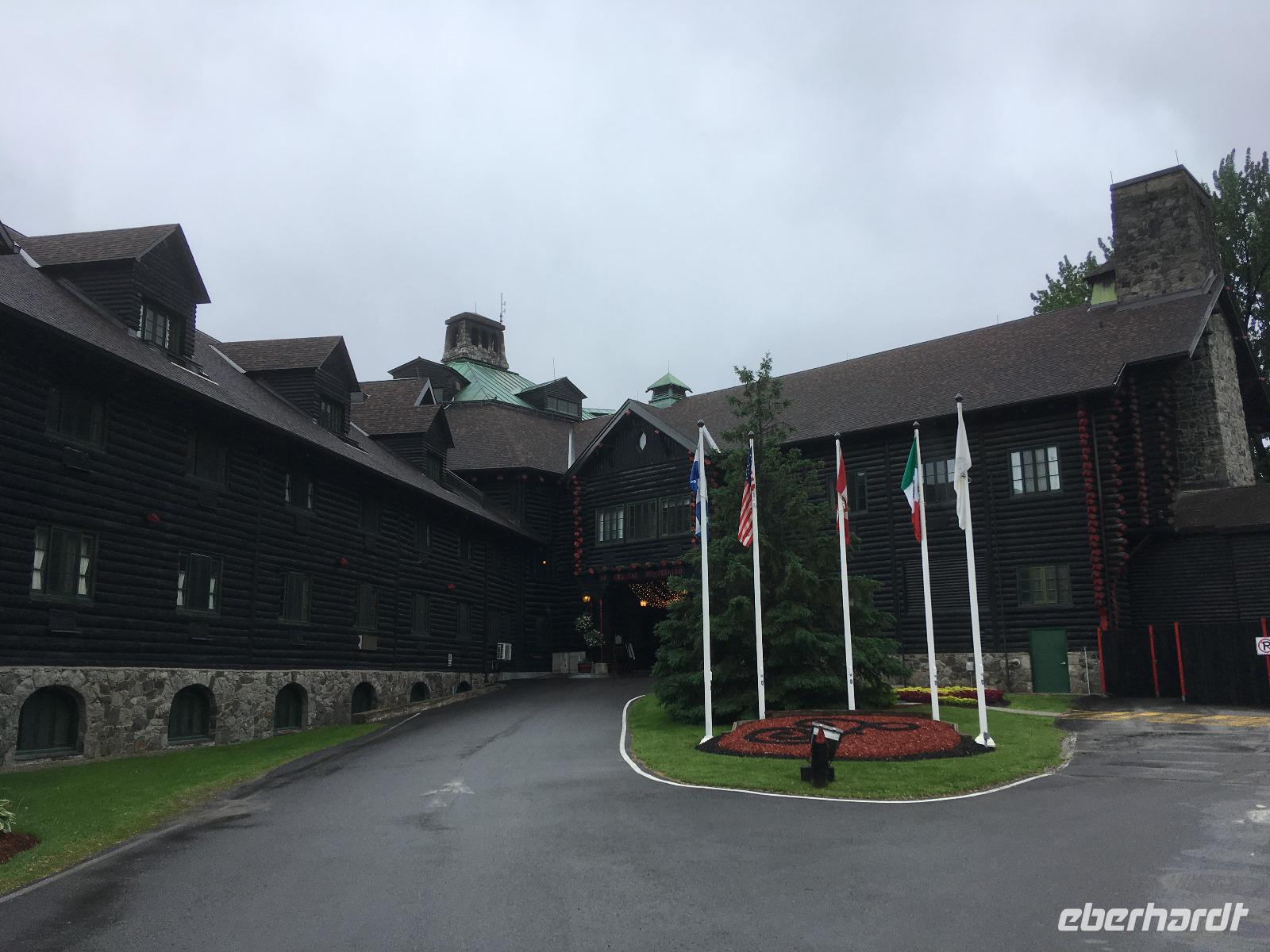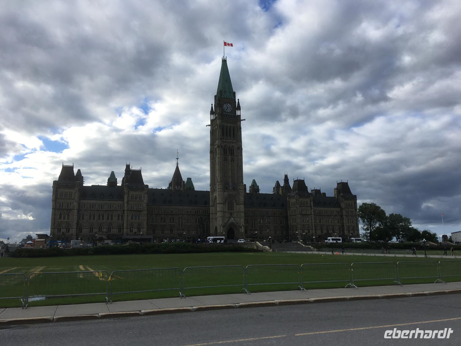 Bis in die kanadische Hauptstadt Ottawa sind es mehr als 400 Kilometer, weshalb wir heute schon um 8:00 Uhr starten. Immerhin erwartet uns nach dem größten Teil der Strecke zur Belohnung ein Mittagessen vom Buffet im Château Montebello. Nicht nur die Außenfassade des 1930 im kanadischen Blockhüttenstil in Rekordzeit erbauten Hotels ist sehr sehenswert, auch der riesige Empfangsraum mit seinem Kamin beeindruckt uns. Nach dem Mittagessen fahren wir dann zum Parc Omega, einem privat betriebenen Wildpark, und steigen in einen umgebauten Schulbus um. Hier können wir die Fenster öffnen, die Tiere mit Karotten füttern und ungehindert Fotos knipsen. Im Park gibt es Hirsche, Elche, Bisons, Wildschweine, Kojoten, Rentiere, Moschusochsen, Polarfüchse, Polarwölfe und ganz zum Schluss auch Bären zu sehen. Mein Highlight bei diesem Besuch sind jedoch die schwarzen Wölfe mit ihren Jungtieren. Leider lässt uns ausgerechnet jetzt zum ersten Mal auf dieser Reise das Wetter im Stich. Wir sehen natürlich viele Tiere, aber auch sie suchen vor dem Regen Schutz und kommen uns daher nicht so nahe wie wir das gerne hätten. Dennoch wollen wir es ihnen nicht verübeln. Auf dem Weg nach Ottawa bessert sich das Wetter wieder und wir können am späten Nachmittag wie geplant mit unserer Stadtführerin Stephanie die kanadische Hauptstadt erkunden. Sie fährt mit uns zunächst zur hiesigen Kathedrale Notre-Dame, die ebenfalls sehr hübsch ist, wenn auch natürlich nicht so beeindruckend wie ihre Namensvetterin in Montréal. Dann erkunden wir ein bisschen das Botschaftsviertel, in dem auch die Generalgouverneurin, die Vertreterin der Königin, und auch der Premierminister ihren Wohnsitz haben. Am Ottawa River machen wir einen Fotostopp, ebenso am Canadian Museum of History in Gatineau, auf der anderen Seite des Ottawa River (und damit in der Provinz Quebec). Letzter Stopp unserer Tour ist natürlich das beeindruckende Parlamentsgebäude selbst mit seinem 92 m hohen Friedensturm, errichtet im neogotischen Stil nach einem verheerenden Brand, der das vorherige Gebäude zerstörte und den nur die Bibliothek überstand. Vor dem Parlament sehen wir auch ein paar „Mounties" - allerdings nur in ihrer „normalen" Polizeiuniform, denn die berühmte rote Paradeuniform tragen sie nur zu speziellen Anlässen. Als wir im Hotel ankommen, liegt wieder ein Tag voller neuer Eindrücke und schöner Erinnerungen hinter uns.