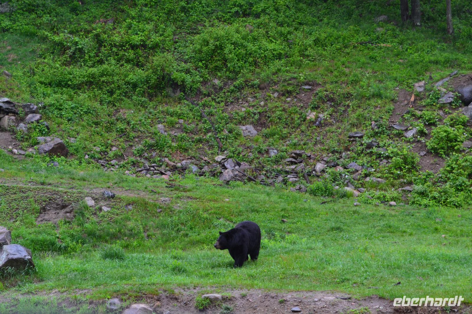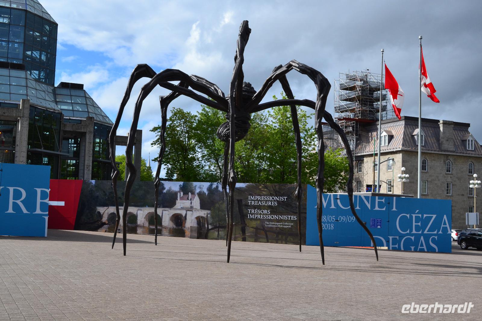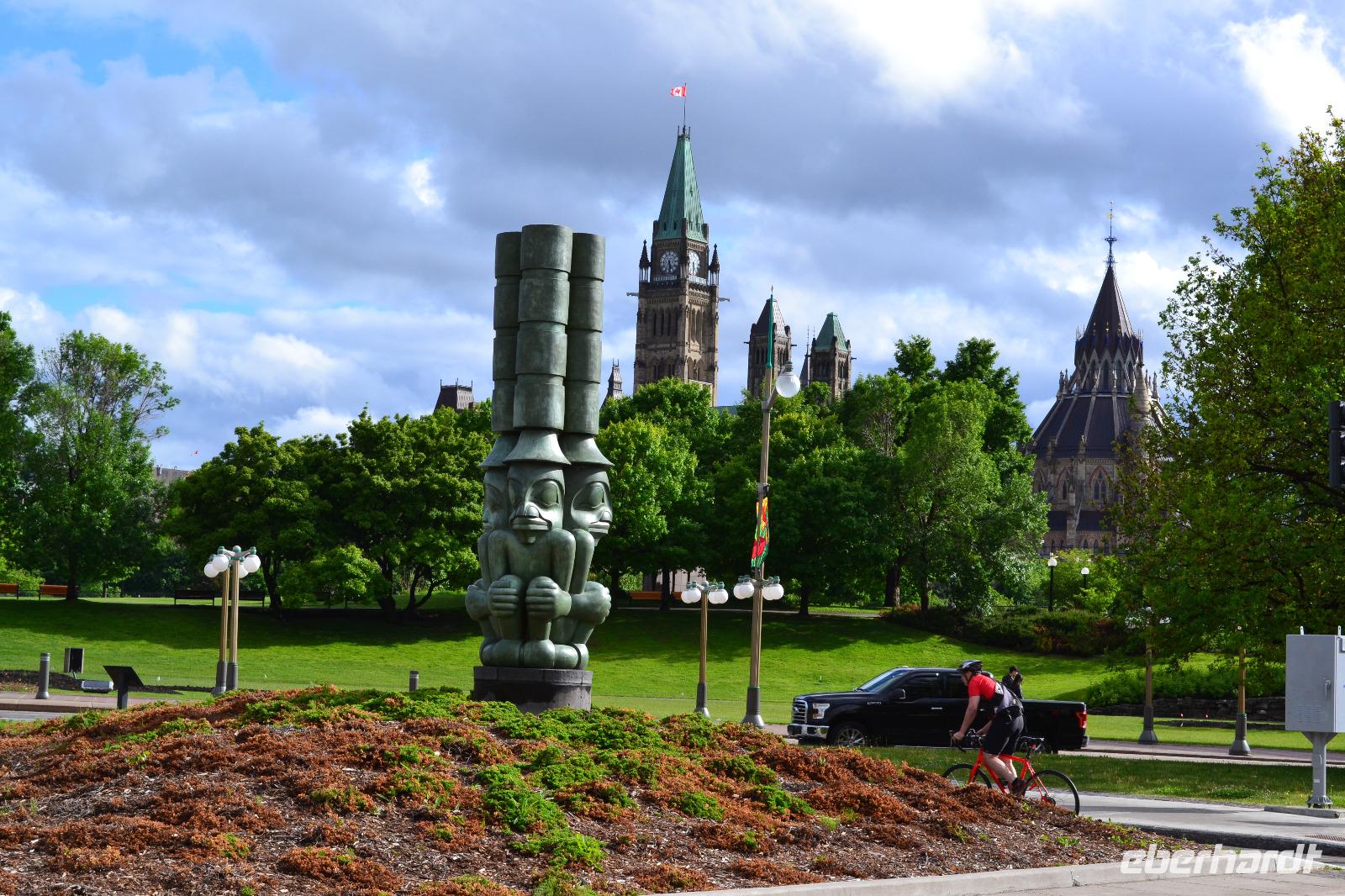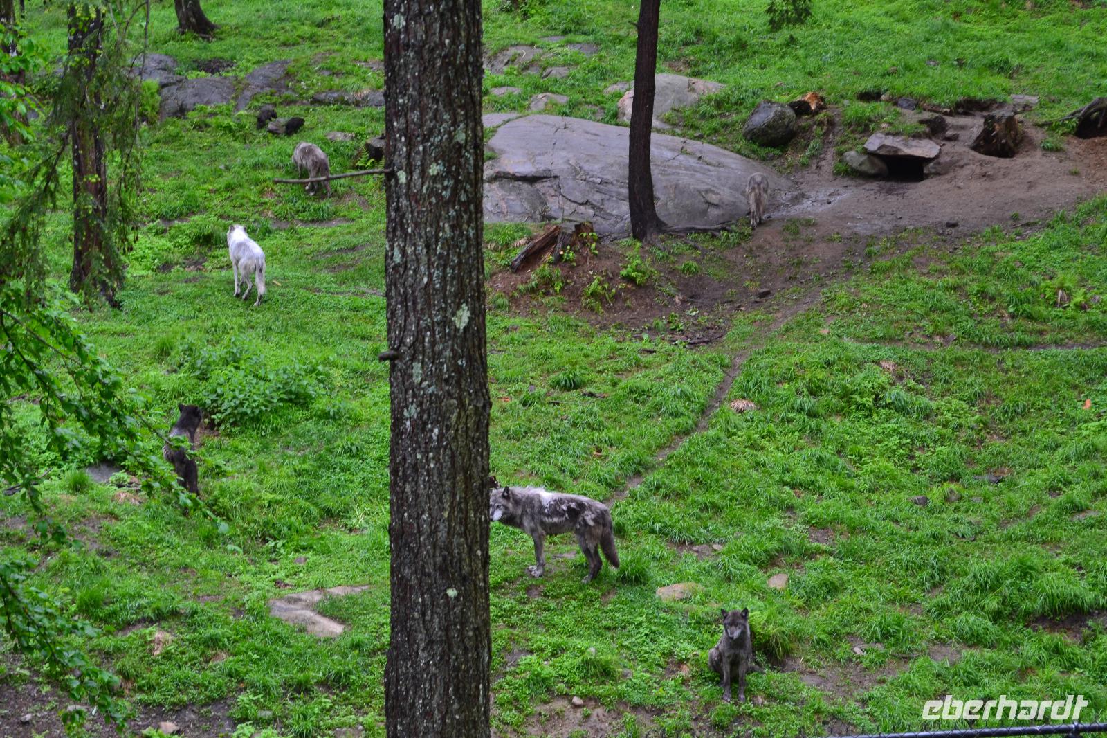 Bis in die kanadische Hauptstadt Ottawa sind es mehr als 400 Kilometer, weshalb wir heute schon um 8:00 Uhr starten. Immerhin erwartet uns nach dem größten Teil der Strecke zur Belohnung ein Mittagessen vom Buffet im Château Montebello. Nicht nur die Außenfassade des 1930 im kanadischen Blockhüttenstil in Rekordzeit erbauten Hotels ist sehr sehenswert, auch der riesige Empfangsraum mit seinem Kamin beeindruckt uns. Nach dem Mittagessen fahren wir dann zum Parc Omega, einem privat betriebenen Wildpark, und steigen in einen umgebauten Schulbus um. Hier können wir die Fenster öffnen, die Tiere mit Karotten füttern und ungehindert Fotos knipsen. Im Park gibt es Hirsche, Elche, Bisons, Wildschweine, Kojoten, Rentiere, Moschusochsen, Polarfüchse, Polarwölfe und ganz zum Schluss auch Bären zu sehen. Mein Highlight bei diesem Besuch sind jedoch die schwarzen Wölfe mit ihren Jungtieren. Leider lässt uns ausgerechnet jetzt zum ersten Mal auf dieser Reise das Wetter im Stich. Wir sehen natürlich viele Tiere, aber auch sie suchen vor dem Regen Schutz und kommen uns daher nicht so nahe wie wir das gerne hätten. Dennoch wollen wir es ihnen nicht verübeln. Auf dem Weg nach Ottawa bessert sich das Wetter wieder und wir können am späten Nachmittag wie geplant mit unserer Stadtführerin Stephanie die kanadische Hauptstadt erkunden. Sie fährt mit uns zunächst zur hiesigen Kathedrale Notre-Dame, die ebenfalls sehr hübsch ist, wenn auch natürlich nicht so beeindruckend wie ihre Namensvetterin in Montréal. Dann erkunden wir ein bisschen das Botschaftsviertel, in dem auch die Generalgouverneurin, die Vertreterin der Königin, und auch der Premierminister ihren Wohnsitz haben. Am Ottawa River machen wir einen Fotostopp, ebenso am Canadian Museum of History in Gatineau, auf der anderen Seite des Ottawa River (und damit in der Provinz Quebec). Letzter Stopp unserer Tour ist natürlich das beeindruckende Parlamentsgebäude selbst mit seinem 92 m hohen Friedensturm, errichtet im neogotischen Stil nach einem verheerenden Brand, der das vorherige Gebäude zerstörte und den nur die Bibliothek überstand. Vor dem Parlament sehen wir auch ein paar „Mounties" - allerdings nur in ihrer „normalen" Polizeiuniform, denn die berühmte rote Paradeuniform tragen sie nur zu speziellen Anlässen. Als wir im Hotel ankommen, liegt wieder ein Tag voller neuer Eindrücke und schöner Erinnerungen hinter uns.