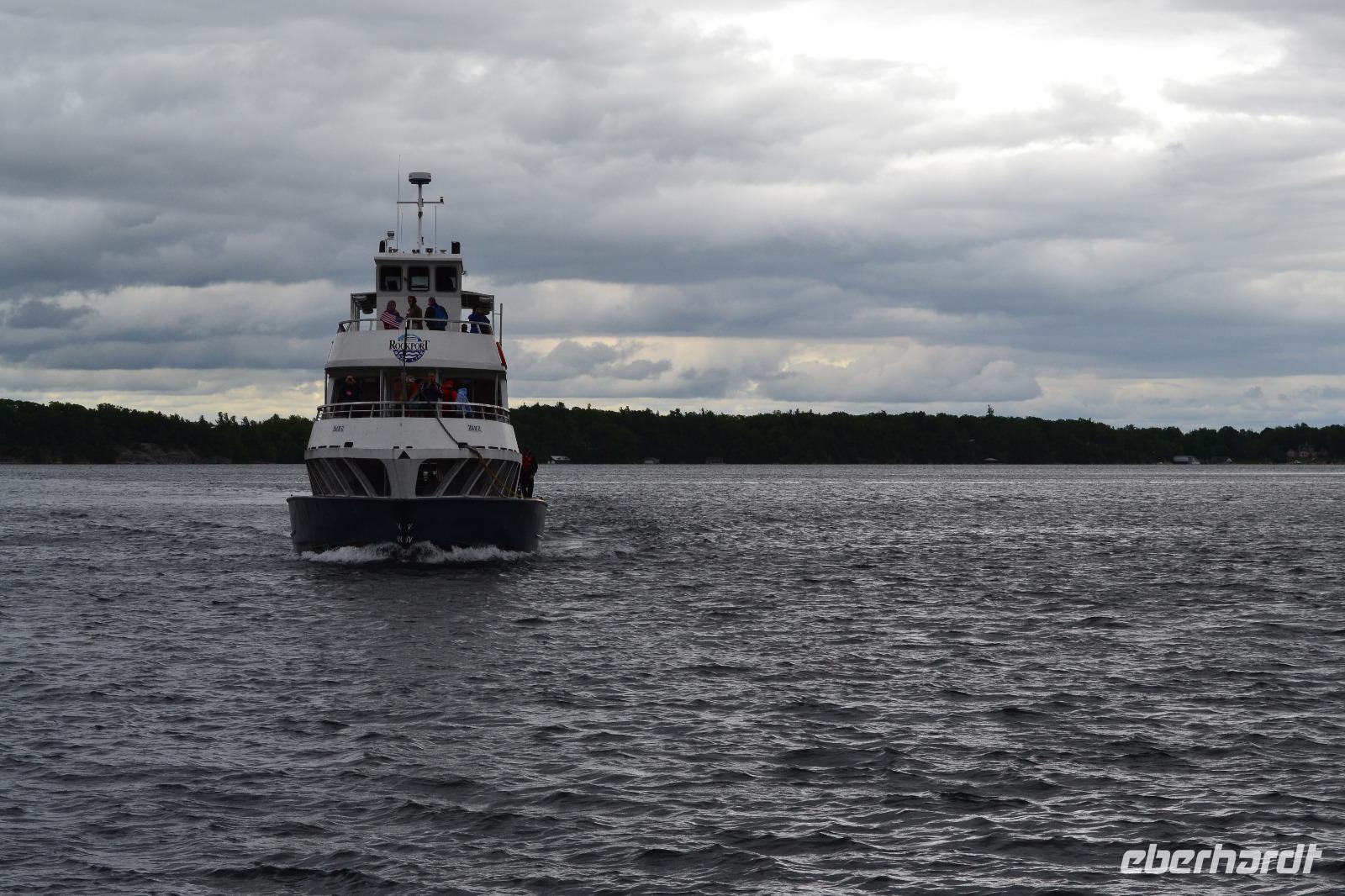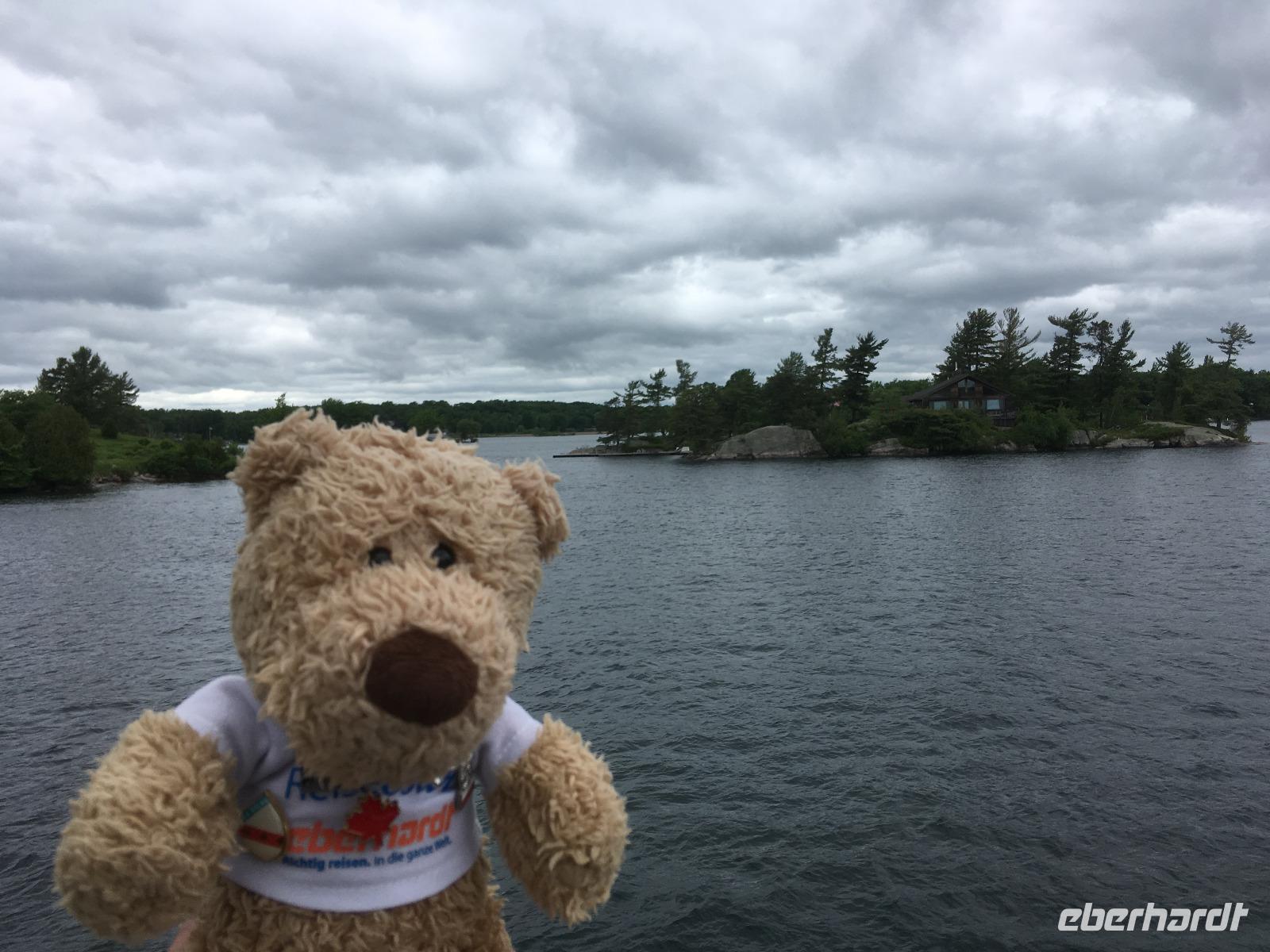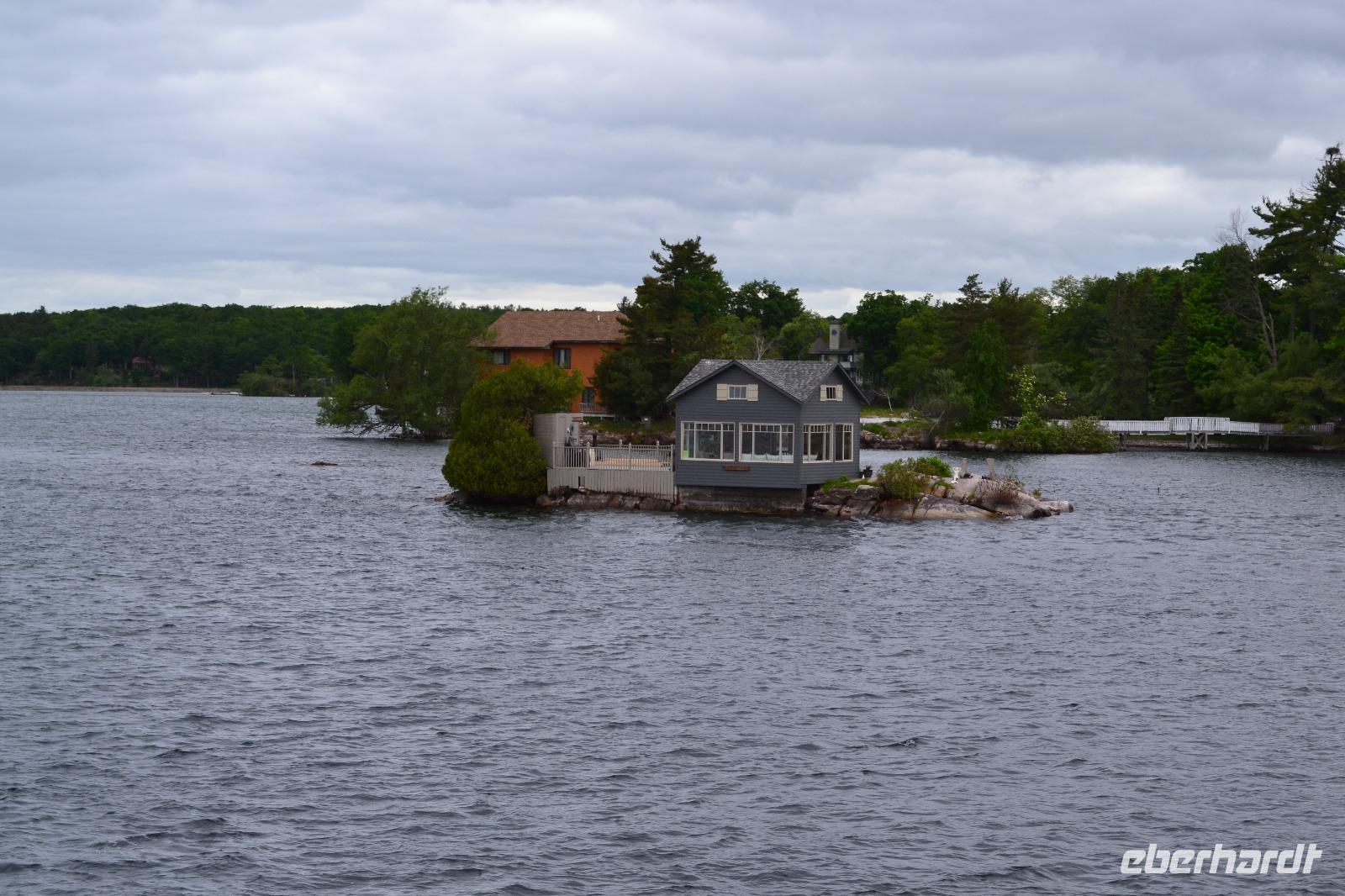 Das Canadian Museum of History geht in seinen Anfängen zurück bis vor die Gründung des Dominion of Canada 1867. Seit 1989 befindet es sich am jetzigen Standort in Gatineau am Ottawa-Fluss. Schon das Museumsgebäude selbst ist sehr beeindruckend, denn der Architekt Douglas Cardinal griff in seinem Entwurf viele Elemente indigener Kulturen auf. Auf mehreren Etagen wird sehr anschaulich die Geschichte der First Nations und die Geschichte der Kolonisierung Kanadas erzählt, zuerst unter französischer, dann unter britischer Herrschaft. Im Foyer treffen wir unsere Stadtführerin Stephanie wieder, die schon mit der nächsten Reisegruppe unterwegs ist. Wir könnten bestimmt einen ganzen Tag im Museum verbringen und hätten immer noch nicht alles gesehen. Doch wir möchten heute auch noch eine Bootsfahrt zu den 1.000 Inseln unternehmen. Deshalb fahren wir wieder nach Süden an den Sankt-Lorenz-Strom. Nach einem gemeinsamen Mittagessen in Rockport geht es auch schon auf das Schiff. Bei unserer Fahrt überqueren wir auch die kanadisch-amerikanische Grenze, die hier mitten durch den Sankt-Lorenz-Strom verläuft. Insgesamt gibt es hier übrigens nicht nur 1.000, sondern 1.864 Inseln! Allerdings bilden nur 21 davon den Thousand-Islands-Nationalpark, den kleinsten Nationalpark Kanadas. Für die Superreichen sind die vielen Inseln offenbar ein beliebter Rückzugsort, denn sie sind gesprenkelt mit kleinen und großen Häusern und Villen. Mit dem Boldt Castle gibt es sogar ein standesgemäßes Schloss zu besichtigen. Mir ist jedoch vor allem die Schwiegermutter-Insel im Gedächtnis geblieben - sie ist so klein, dass gerade mal eine kleine Hütte und ein Baum darauf passen.