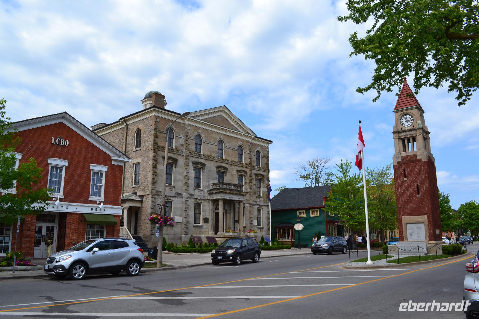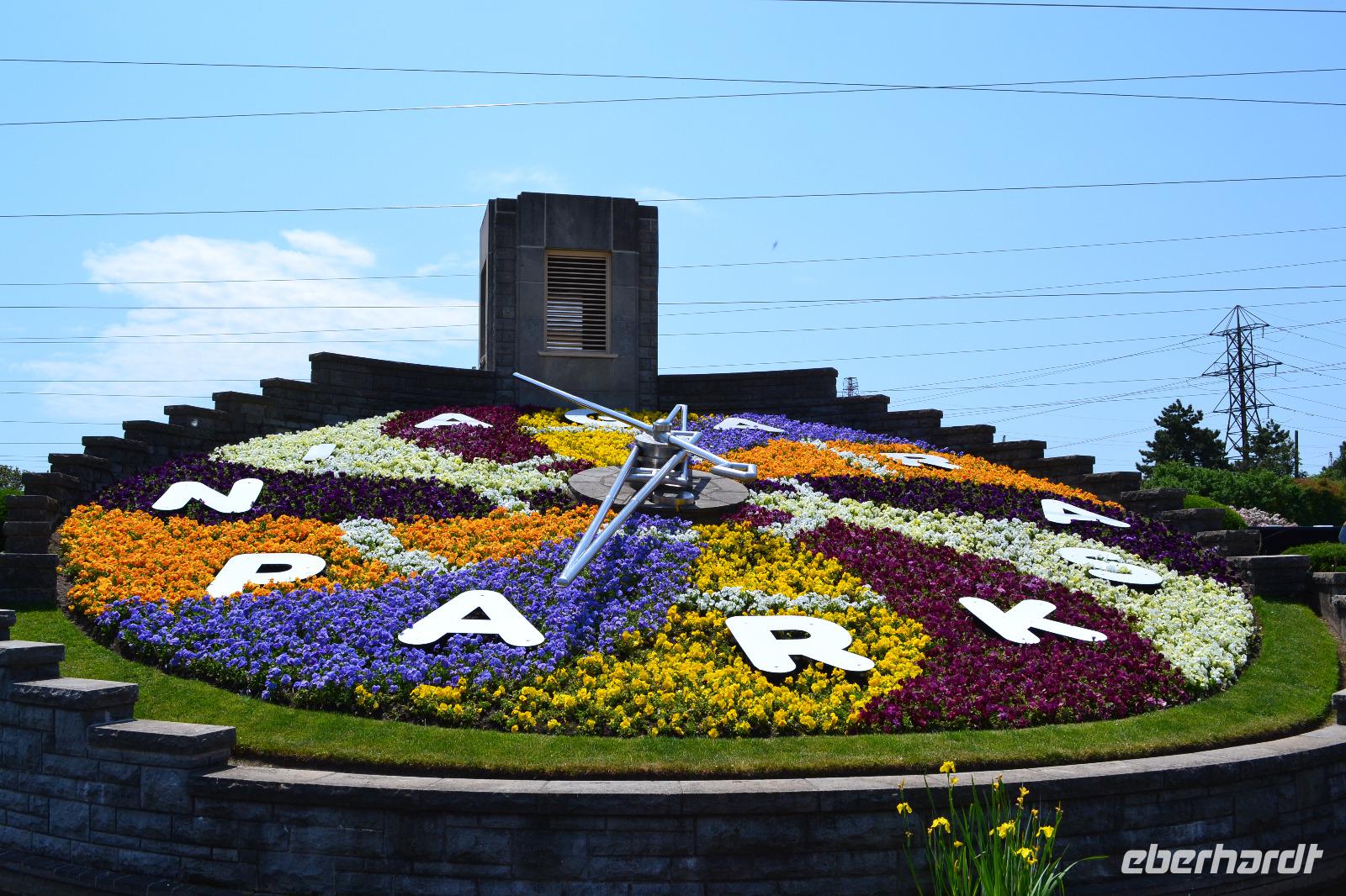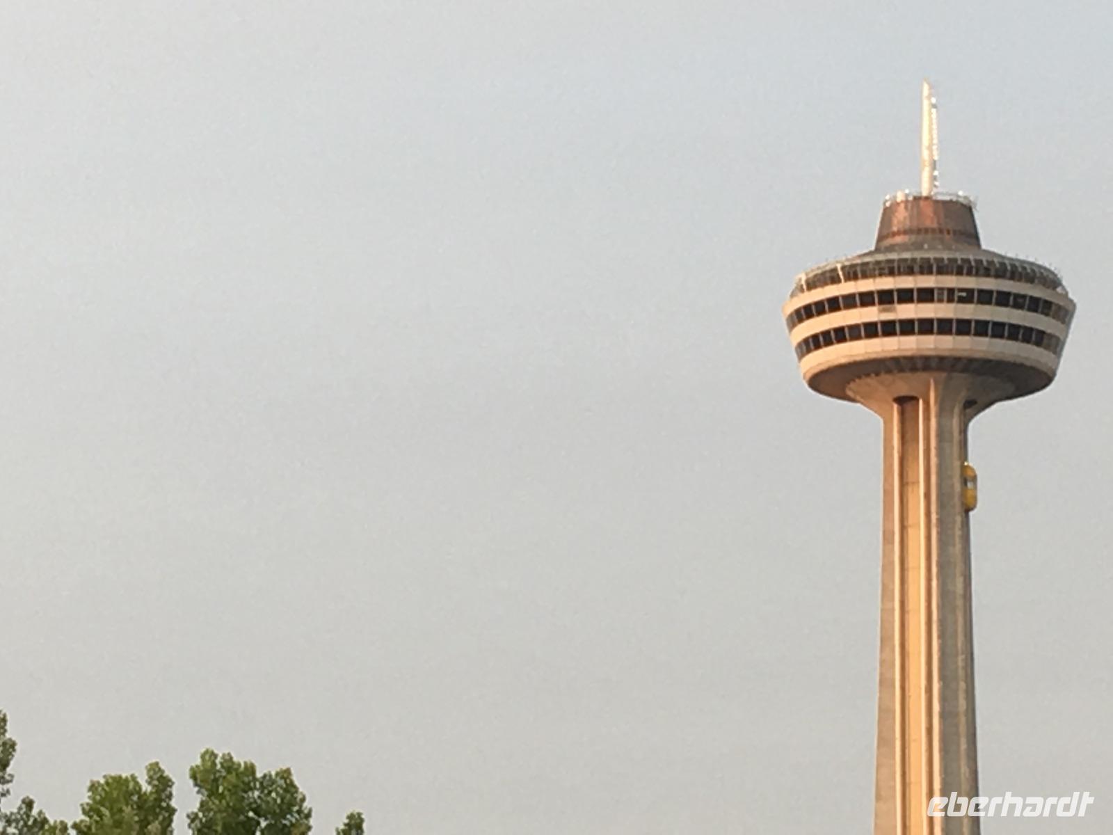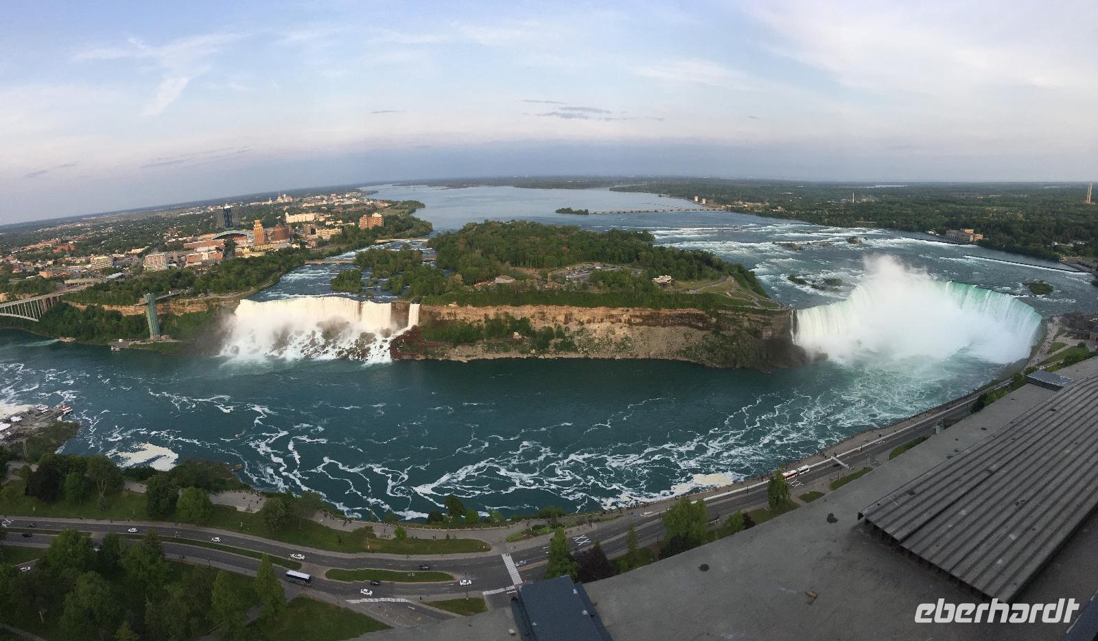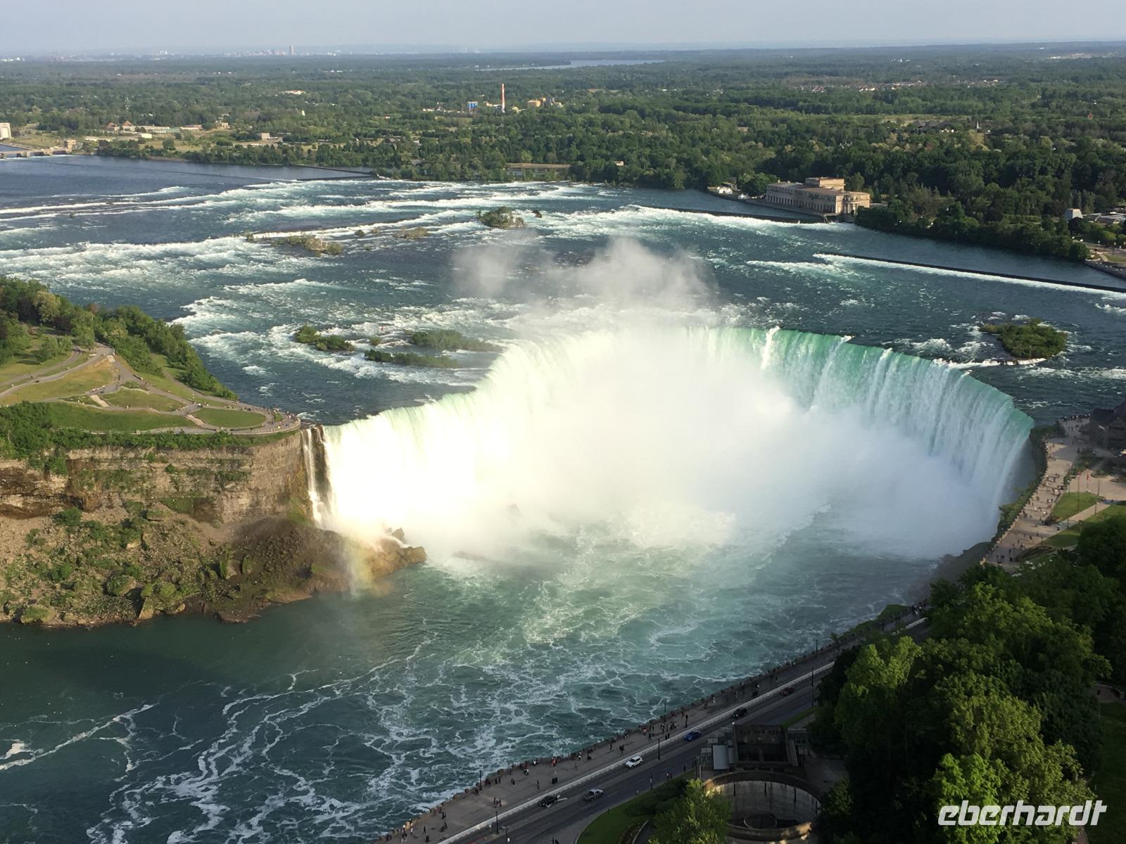 Nach zwei Nächten in Toronto heißt es schon wieder Abschied nehmen - ach, es gäbe noch so viel zu sehen und zu zeigen! Aber ich gebe natürlich gern zu, dass die Region um die Niagara-Fälle wirklich sehr schön und auf jeden Fall einen Ausflug wert ist, besonders heute, denn die Sonne ist wieder zurück und bleibt uns auch den ganzen Tag erhalten. Das kleine Örtchen Niagara-on-the-Lake ist heute vor allem ein Ausflugsort für Touristen und Zentrum des Weinanbaus, war aber kurzzeitig in der Vergangenheit Hauptstadt der britischen Provinz Upper Canada. Der Ort erinnert mit seiner Architektur und den Pferdekutschen ein bisschen an ein Freilichtmuseum und lädt zum Flanieren ein. Auch soll man in Niagara-on-the-Lake das beste Eis in Kanada bekommen - da muss natürlich ein Test erfolgen, schließlich muss ich als Reiseleiter meine Gäste immer gut beraten können. Nach Fotostopps an der Blumenuhr und am „Whirlpool" erreichen wir schließlich unser heutiges Ziel: die Niagara Falls in der gleichnamigen Stadt an der kanadisch-amerikanischen Grenze. Wir schnappen uns auch gleich ein rotes Regencape und gehen an Bord eines Ausflugsbootes, dass uns ganz dicht an die Wasserfälle heranbringt, was aber auch bedeutet, dass wir ganz viel Wasser abbekommen (es sei denn, man versteckt sich ganz still und heimlich hinter einer Glasscheibe). Der Niagara River stürzt sich jedenfalls an dieser Stelle verteilt auf drei Wasserfälle 57 m in die Tiefe: die American Falls, die Bridal Veil Falls (beide auf amerikanischer Seite) und die Horseshoe Falls, durch den die Grenze verläuft. Allerdings dienen die Wasserfälle auch der Stromerzeugung, weshalb der Wasserdurchfluss heutzutage reguliert wird. Dies hat auch den positiven Effekt, dass die Erosion, durch die die markante Hufeisenform ja erst entstanden ist, deutlich abgeschwächt wird, weshalb sich die Wasserfälle nicht mehr so schnell flussaufwärts „fressen". Vom Skylon Tower haben wir am Abend nicht nur eine tolle Aussicht auf die Wasserfälle, sondern bekommen auch ein schmackhaftes Abendessen vom Buffet.