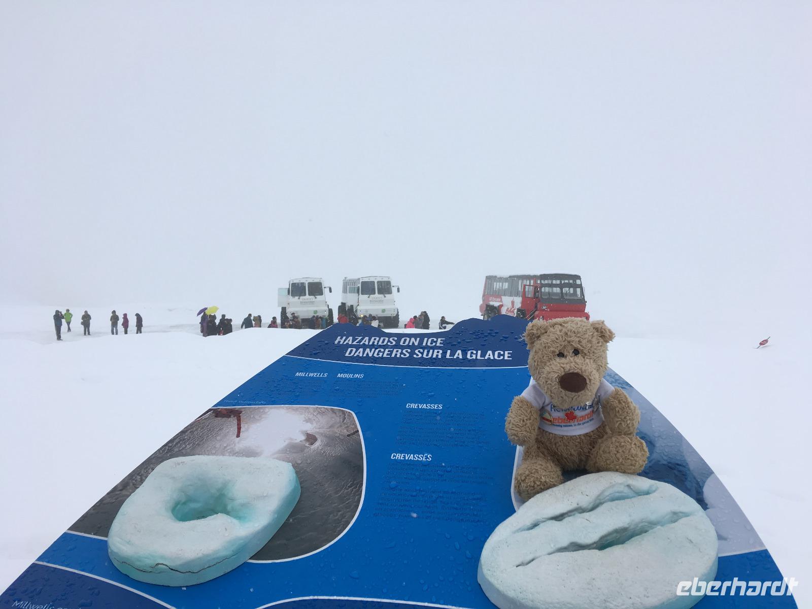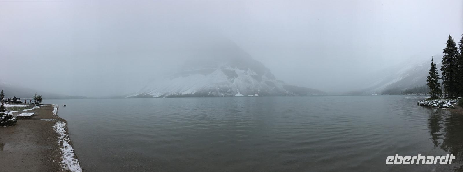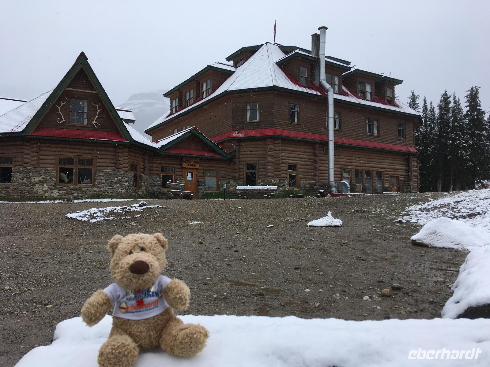 Als wir am Morgen Banff verlassen, ahnen wir noch nicht, dass wettertechnisch einer der verrücktesten Tage vor uns liegt. Ähnlich wie am Moraine Lake tags zuvor verstecken sich die Berge um den Lake Louise heute wieder hinter Regenwolken. Benannt ist das wohl berühmteste Ausflugsziel in den kanadischen Rocky Mountains nach einer Tochter der Königin Victoria. Auch hier gibt es ein großes Schlosshotel, und als wir kurz durch die unteren Hallen wandeln, könnten wir schon ein bisschen neidisch werden auf die Schönen und Reichen. Gern möchte ich einmal eine Reise quer durch Kanada leiten, in der meine Gruppe ausschließlich in den Fairmont-Hotels übernachtet. Andererseits: ob ich dann auch so nette und pflegeleichte Gäste hätte? Jetzt wartet aber erstmal der 230 Kilometer lange Icefields Parkway auf uns, der als eine der schönsten Panoramastraßen der Welt gilt. Womit wir aber alle nicht gerechnet haben: mit Schneefall Mitte Juni! Wir haben doch keinen Winterurlaub gebucht? Und in Calgary waren es noch 30 Grad! Das glaubt uns doch zuhause niemand! Da stehen wir nun also zuerst am Bow Lake und dann am Peyto Lake und können einen Schneemann bauen. Doch es soll noch verrückter kommen. Alle Gäste haben die Fahrt mit dem Schneebus auf den Athabasca-Gletscher gebucht, die am Nachmittag, nach der Mittagspause im kleinen Örtchen Sasketchewan River Crossing, ansteht. Die Tour findet auch statt, denn den Bus mit seinen mannshohen Reifen hält so schnell nichts auf. Doch oben angekommen sehen wir - nichts. Und mit „nichts" meine ich: es gibt keine Grenze zwischen Himmel und Gletscher bzw. Schnee, alles ist weiß, man muss die Augen zusammenkneifen, um nicht geblendet zu werden; würden nicht ein paar Mitarbeiter mit roten Jacken herumstehen, könnten wir leicht die Orientierung verlieren. Obwohl wir uns das so sicher nicht vorgestellt haben - eine einmalige Erfahrung ist es dennoch, die uns die Ohnmacht des einzelnen Menschen angesichts der Macht der Natur vor Augen führt. So fahren wir also etwas nachdenklich weiter Richtung Norden durch den Jasper-Nationalpark, den wir inzwischen erreicht haben, bis zur Sunwapta Falls Lodge, wo wir sehr herzlich mit einem Glas Sekt empfangen werden und auch ein sehr gutes Abendessen erhalten. Außerdem werden wir noch darauf hingewiesen, vorsichtig zu sein, denn es wurde erst gestern ein Bär an einem der Bungalows gesehen!