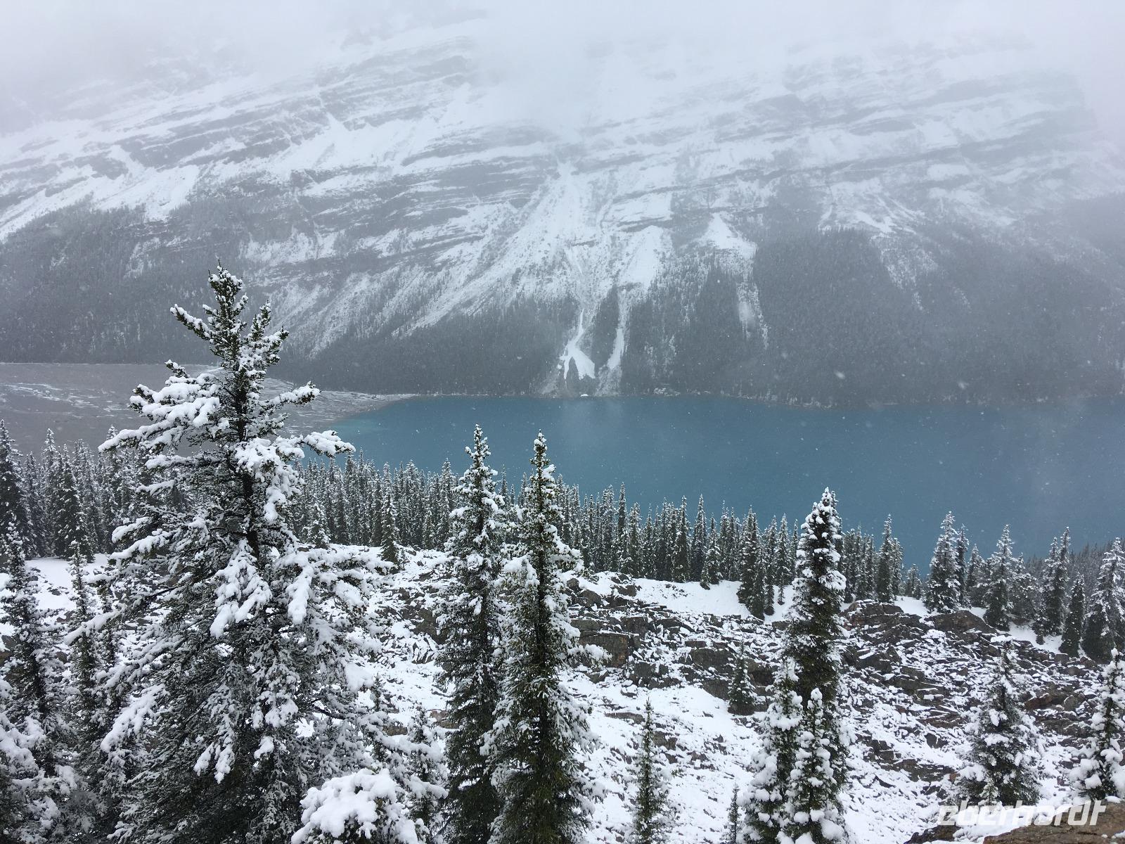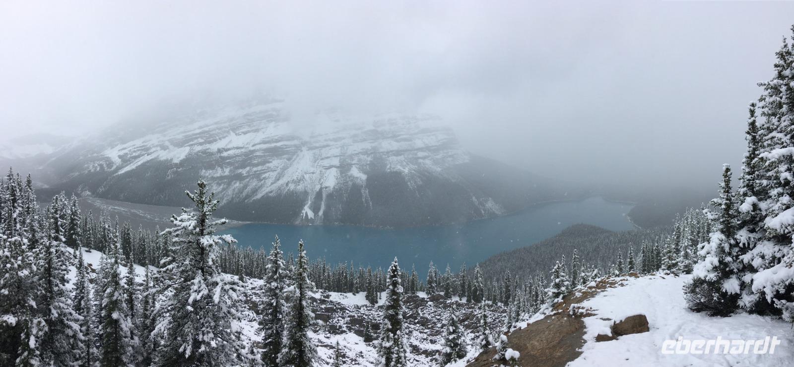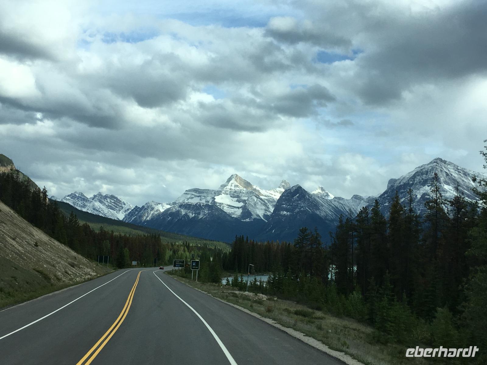 Als wir am Morgen Banff verlassen, ahnen wir noch nicht, dass wettertechnisch einer der verrücktesten Tage vor uns liegt. Ähnlich wie am Moraine Lake tags zuvor verstecken sich die Berge um den Lake Louise heute wieder hinter Regenwolken. Benannt ist das wohl berühmteste Ausflugsziel in den kanadischen Rocky Mountains nach einer Tochter der Königin Victoria. Auch hier gibt es ein großes Schlosshotel, und als wir kurz durch die unteren Hallen wandeln, könnten wir schon ein bisschen neidisch werden auf die Schönen und Reichen. Gern möchte ich einmal eine Reise quer durch Kanada leiten, in der meine Gruppe ausschließlich in den Fairmont-Hotels übernachtet. Andererseits: ob ich dann auch so nette und pflegeleichte Gäste hätte? Jetzt wartet aber erstmal der 230 Kilometer lange Icefields Parkway auf uns, der als eine der schönsten Panoramastraßen der Welt gilt. Womit wir aber alle nicht gerechnet haben: mit Schneefall Mitte Juni! Wir haben doch keinen Winterurlaub gebucht? Und in Calgary waren es noch 30 Grad! Das glaubt uns doch zuhause niemand! Da stehen wir nun also zuerst am Bow Lake und dann am Peyto Lake und können einen Schneemann bauen. Doch es soll noch verrückter kommen. Alle Gäste haben die Fahrt mit dem Schneebus auf den Athabasca-Gletscher gebucht, die am Nachmittag, nach der Mittagspause im kleinen Örtchen Sasketchewan River Crossing, ansteht. Die Tour findet auch statt, denn den Bus mit seinen mannshohen Reifen hält so schnell nichts auf. Doch oben angekommen sehen wir - nichts. Und mit „nichts" meine ich: es gibt keine Grenze zwischen Himmel und Gletscher bzw. Schnee, alles ist weiß, man muss die Augen zusammenkneifen, um nicht geblendet zu werden; würden nicht ein paar Mitarbeiter mit roten Jacken herumstehen, könnten wir leicht die Orientierung verlieren. Obwohl wir uns das so sicher nicht vorgestellt haben - eine einmalige Erfahrung ist es dennoch, die uns die Ohnmacht des einzelnen Menschen angesichts der Macht der Natur vor Augen führt. So fahren wir also etwas nachdenklich weiter Richtung Norden durch den Jasper-Nationalpark, den wir inzwischen erreicht haben, bis zur Sunwapta Falls Lodge, wo wir sehr herzlich mit einem Glas Sekt empfangen werden und auch ein sehr gutes Abendessen erhalten. Außerdem werden wir noch darauf hingewiesen, vorsichtig zu sein, denn es wurde erst gestern ein Bär an einem der Bungalows gesehen!