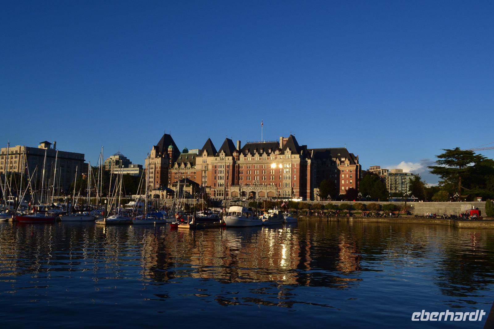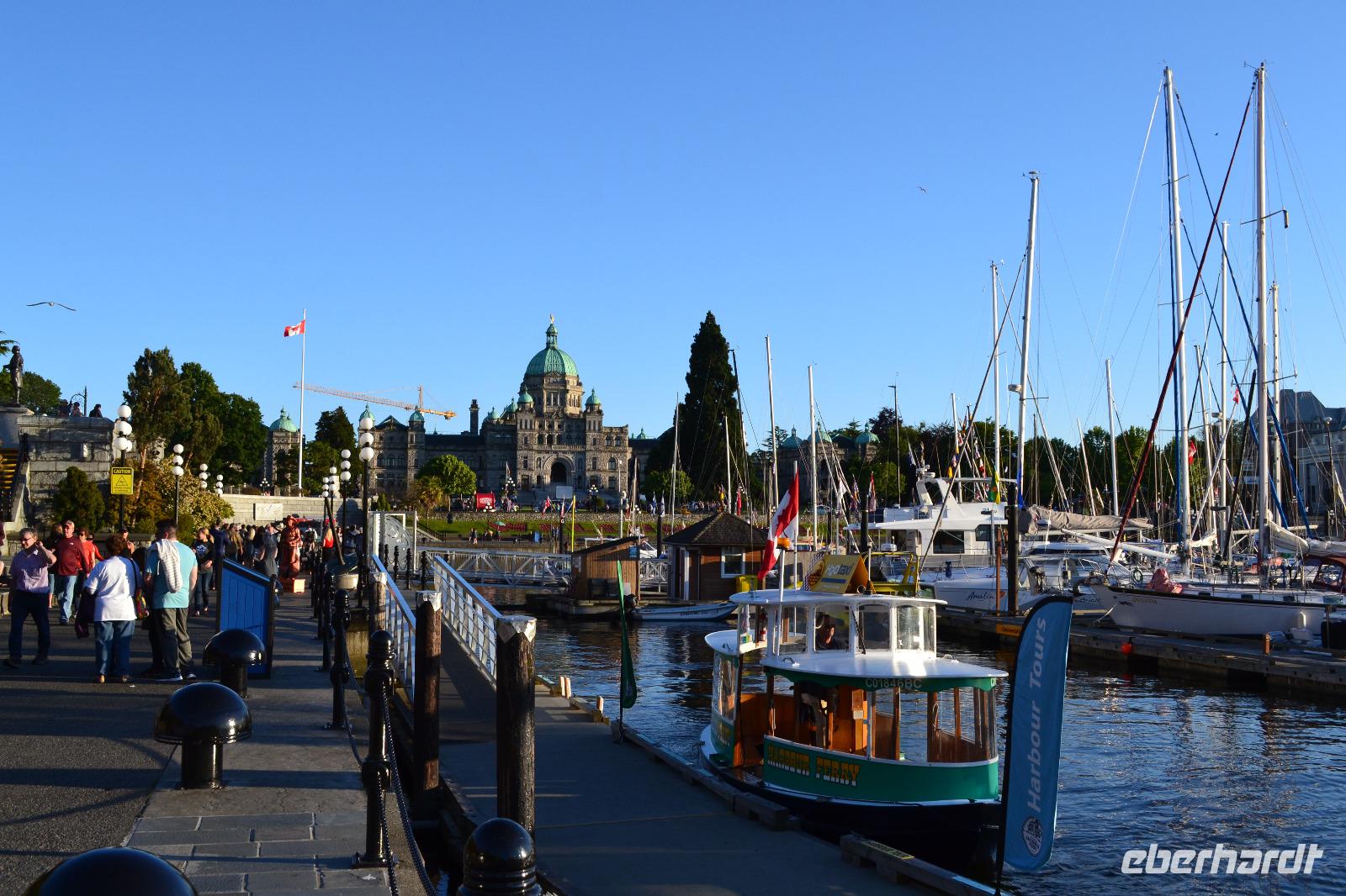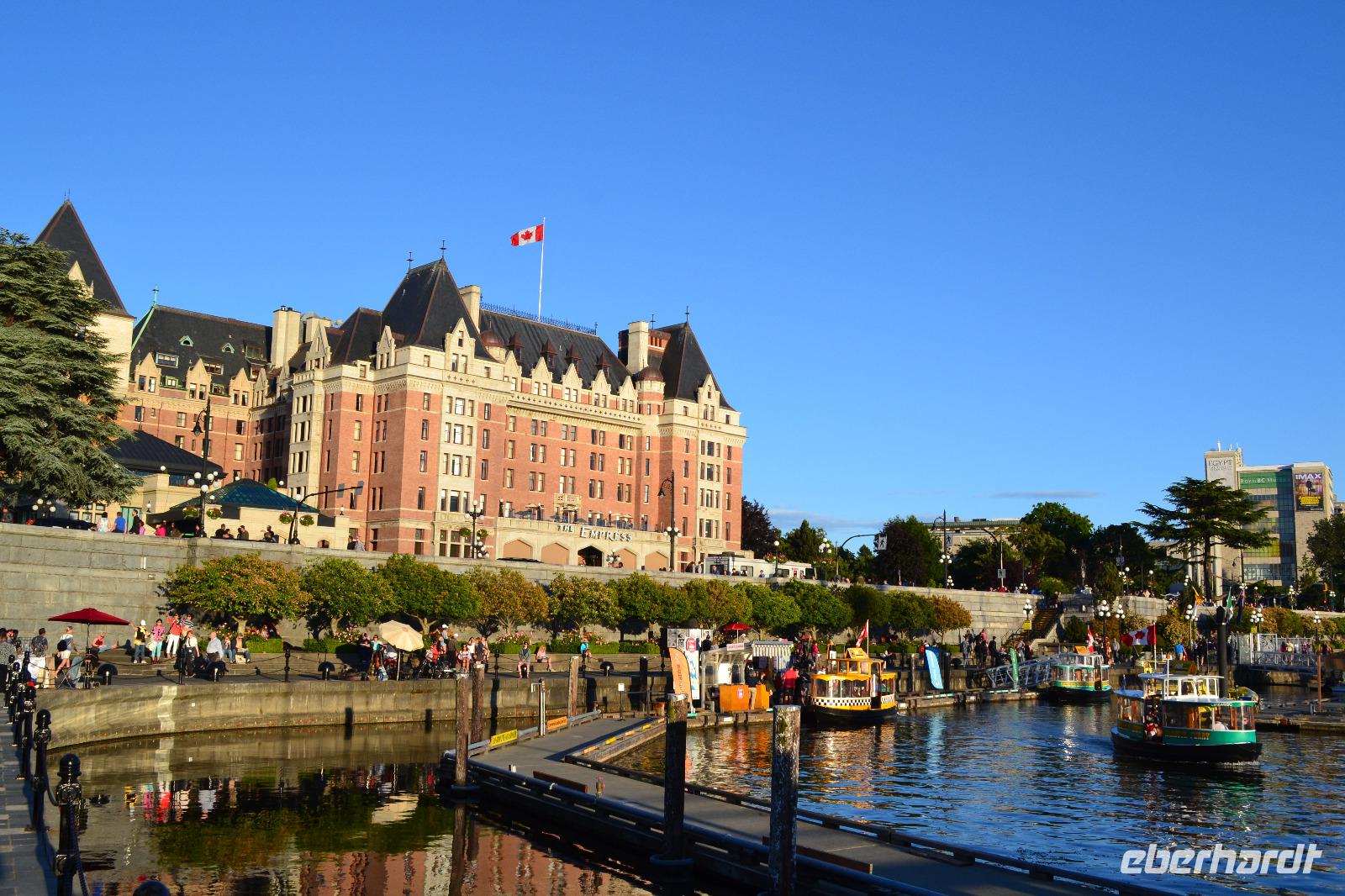 Leider müssen wir mein kleines Paradies hier an der Westküste von Vancouver Island heute wieder verlassen. Ein kleines Häuschen mit Blick auf das Meer... ein schöner Traum. Es geht also wieder bis nach Coombs, wo wir wieder unsere Mittagspause einlegen, und dann weiter auf dem Transcanada Highway Richtung Süden. In Chemainus, an der Ostküste, machen wir einen weiteren Halt. Der Ort lebt traditionell von der Holzindustrie. Als sich diese gerade in einer Krise befand, versuchte die Gemeindeverwaltung, auch das touristische Potenzial zu erschließen, und ließ 39 Wandmalereien in Auftrag geben, die aus der Geschichte des Ortes erzählen. Am späten Nachmittag erreichen wir Victoria, die Hauptstadt der Provinz British Columbia. Mit ungefähr 90.000 Einwohnern (370.000 in der Metropolregion) handelt es sich um eine verhältnismäßig kleine Stadt. Die meisten Sehenswürdigkeiten befinden sich am Inner Harbour. Mit Abstand die wichtigste Attraktion ist natürlich das Parlamentsgebäude aus dem Jahr 1898, gefolgt vom Fairmont Hotel. Bekannt ist Victoria auch für die vielen winzigen Fähren, die als Wassertaxis Personen über die Bucht befördern. Unser Hotel in Victoria liegt nicht weit vom Hafen entfernt und wartet mit riesigen Zimmern auf. Auf dem Weg zum Abendessen stolpern wir in eine Schulabschlussfeier hinein und bewundern die sehr schönen Ballkleider. Das Essen selbst findet im Panoramarestaurant Vista 18 statt, von wo aus wir einen tollen Blick über den Hafen und die Innenstadt haben.
