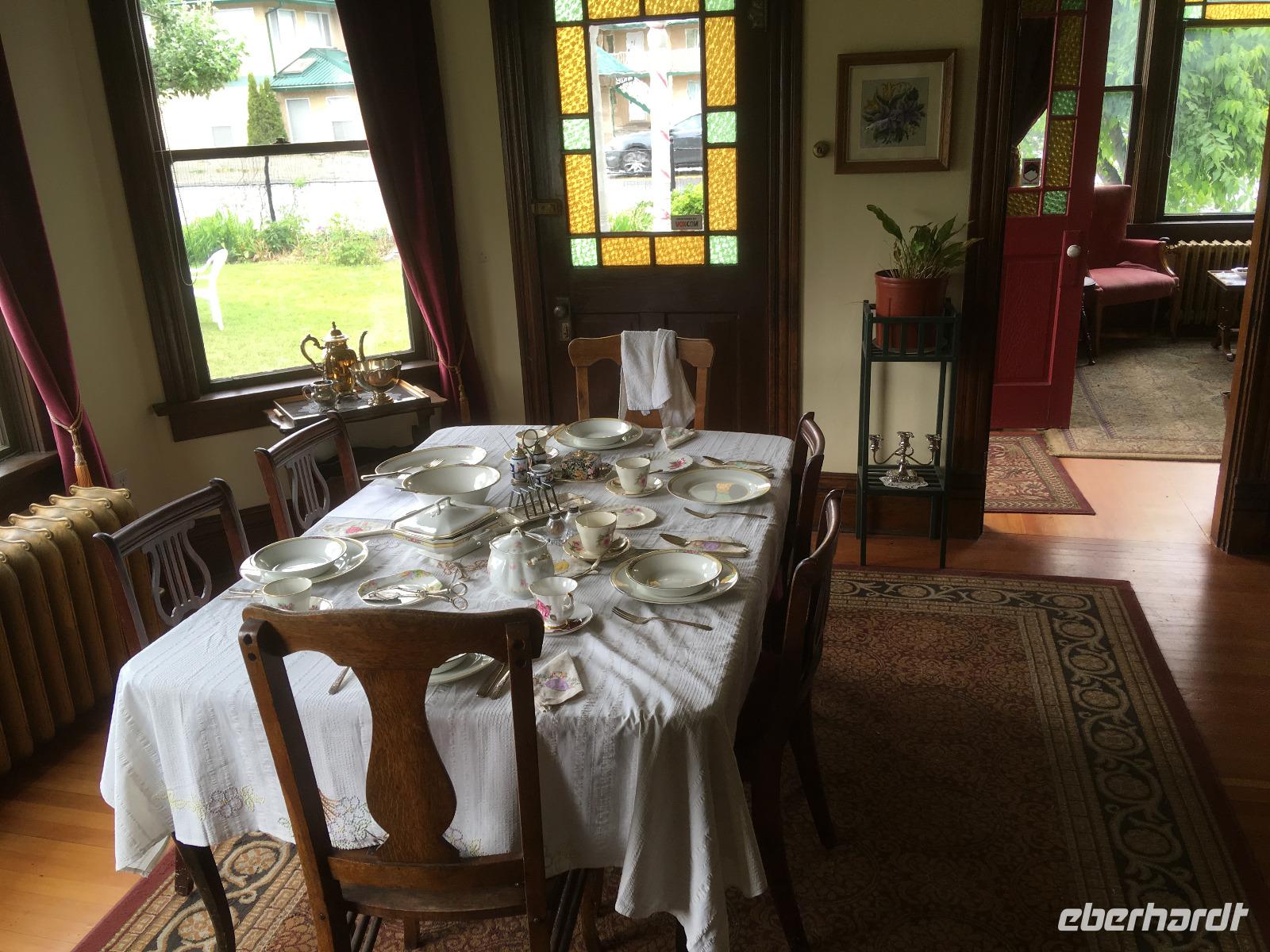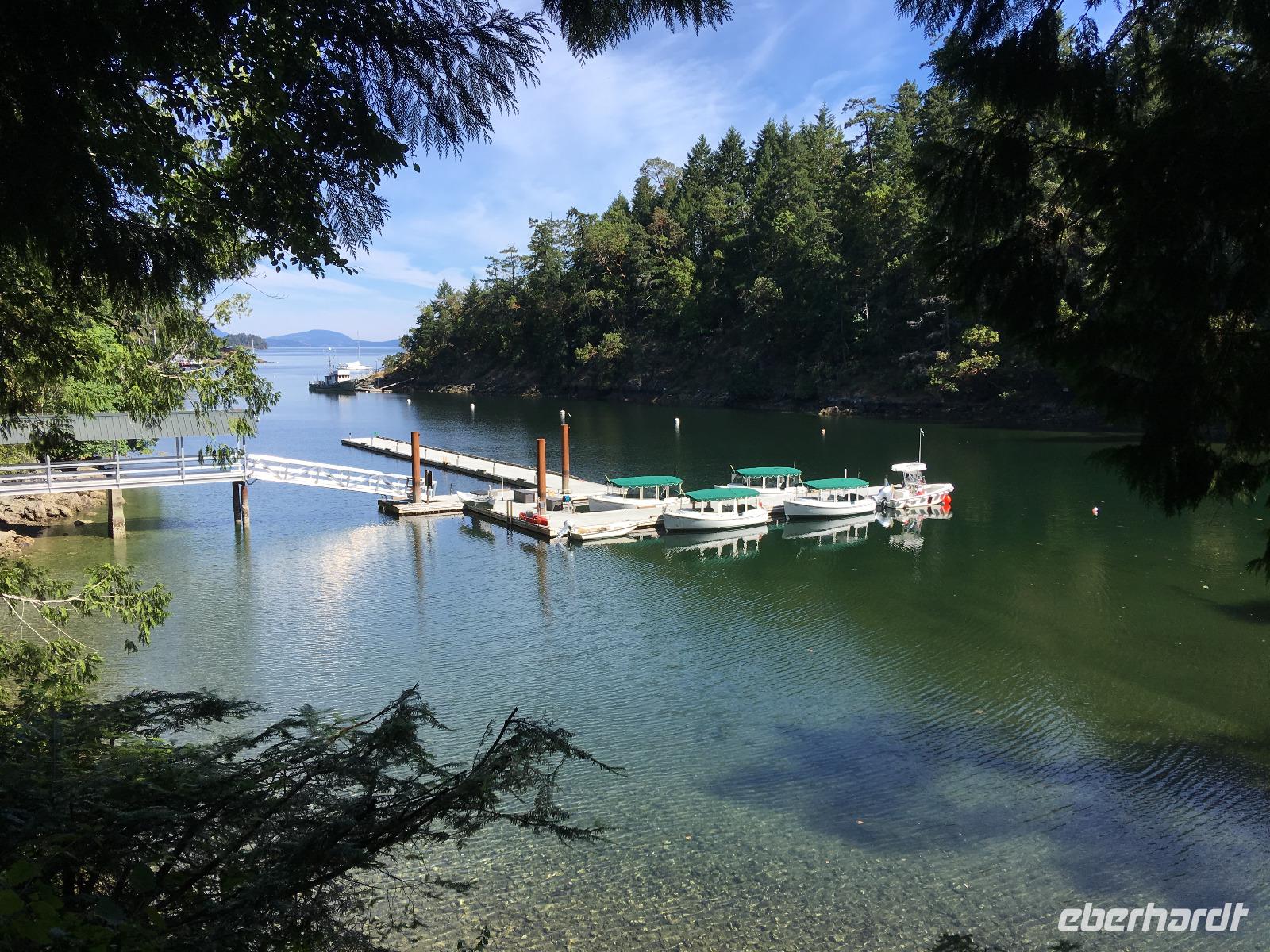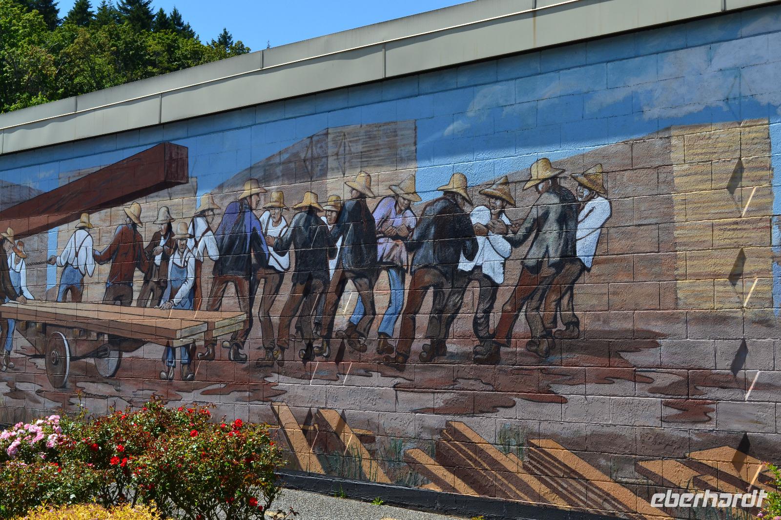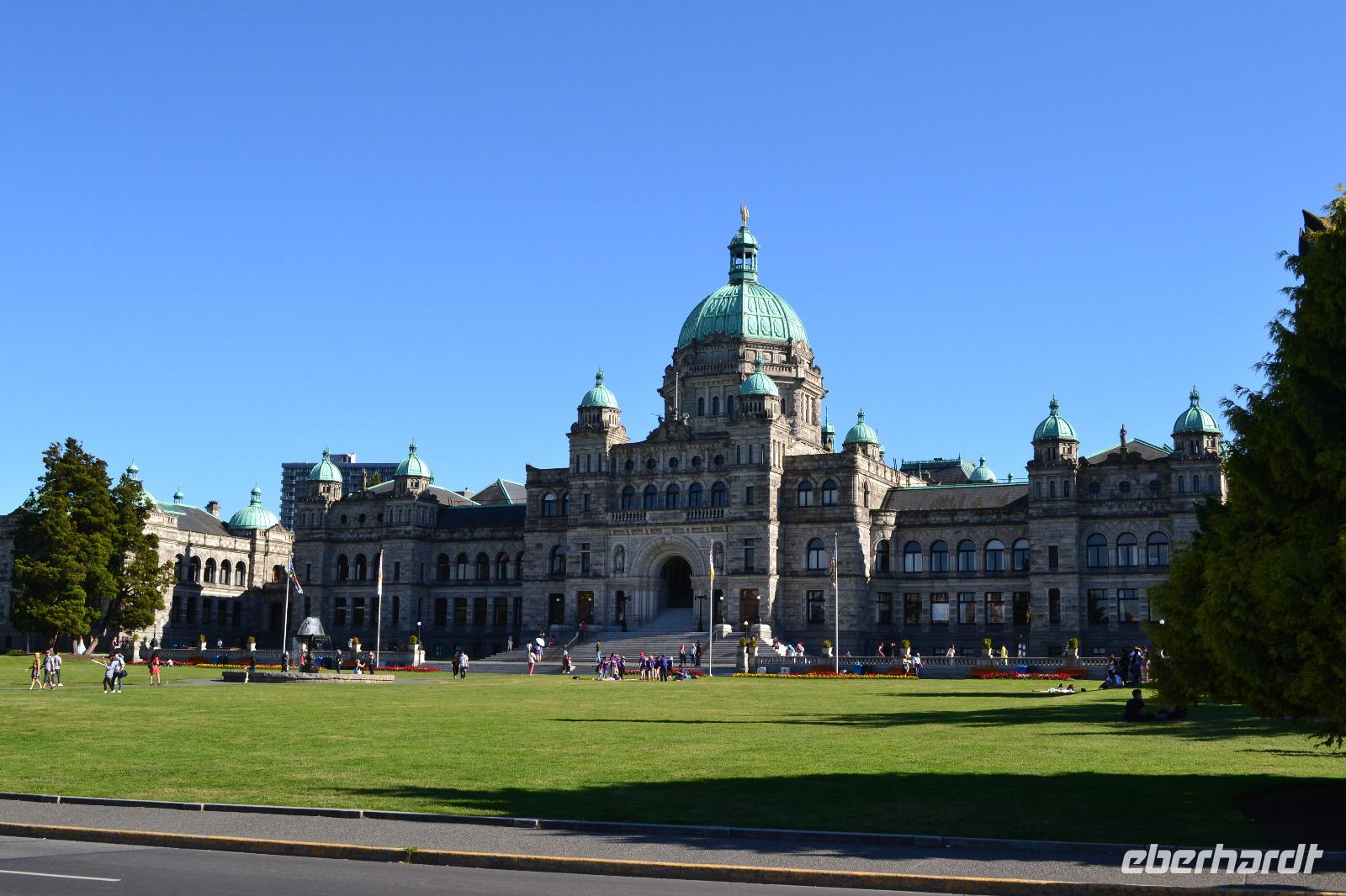Leider müssen wir mein kleines Paradies hier an der Westküste von Vancouver Island heute wieder verlassen. Ein kleines Häuschen mit Blick auf das Meer... ein schöner Traum. Es geht also wieder bis nach Coombs, wo wir wieder unsere Mittagspause einlegen, und dann weiter auf dem Transcanada Highway Richtung Süden. In Chemainus, an der Ostküste, machen wir einen weiteren Halt. Der Ort lebt traditionell von der Holzindustrie. Als sich diese gerade in einer Krise befand, versuchte die Gemeindeverwaltung, auch das touristische Potenzial zu erschließen, und ließ 39 Wandmalereien in Auftrag geben, die aus der Geschichte des Ortes erzählen. Am späten Nachmittag erreichen wir Victoria, die Hauptstadt der Provinz British Columbia. Mit ungefähr 90.000 Einwohnern (370.000 in der Metropolregion) handelt es sich um eine verhältnismäßig kleine Stadt. Die meisten Sehenswürdigkeiten befinden sich am Inner Harbour. Mit Abstand die wichtigste Attraktion ist natürlich das Parlamentsgebäude aus dem Jahr 1898, gefolgt vom Fairmont Hotel. Bekannt ist Victoria auch für die vielen winzigen Fähren, die als Wassertaxis Personen über die Bucht befördern. Unser Hotel in Victoria liegt nicht weit vom Hafen entfernt und wartet mit riesigen Zimmern auf. Auf dem Weg zum Abendessen stolpern wir in eine Schulabschlussfeier hinein und bewundern die sehr schönen Ballkleider. Das Essen selbst findet im Panoramarestaurant Vista 18 statt, von wo aus wir einen tollen Blick über den Hafen und die Innenstadt haben.