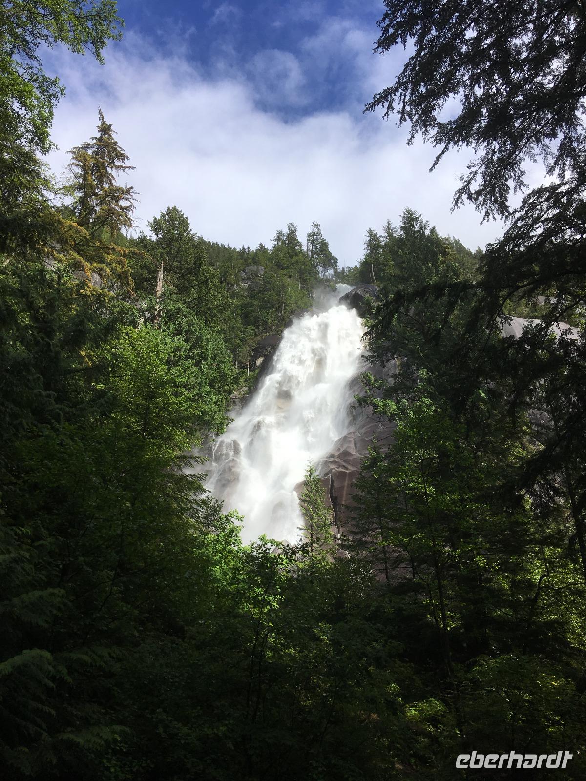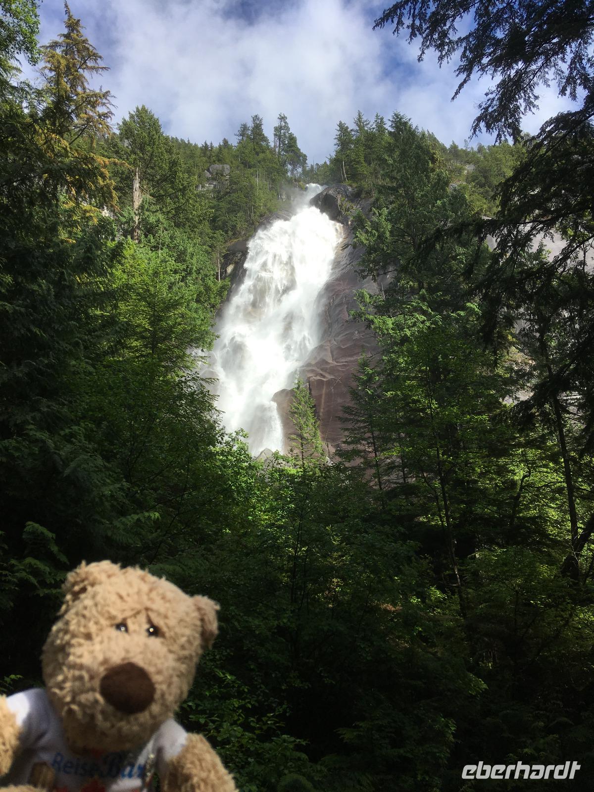 Leider können wir heute nicht zur Hat Creek Ranch fahren, da die einzige Zufahrtsstraße aufgrund eines Erdrutsches für Busse und LKWs gesperrt ist. Gleichzeitig bedeutet dies für uns, dass wir einen gewaltigen Umweg vor uns haben, um zu unserem nächsten Hotel in Whistler zu kommen. Zu allem Überfluss sagt der Wetterbericht für heute viel Regen voraus. Damit wir unterwegs nicht verhungern, erhalten wir jeder vom Hotel ein riesengroßes Lunchpaket mit auf den Weg. Bei einem Zwischenstopp in Merritt entdecken wir ein kleines Museum, in dem das Leben der Kanadier um das Jahr 1900 konserviert ist. Wir finden hier auch für uns noch bekannte Objekte, z. B. eine Springer-Schreibmaschine, die uns an das Leben unserer Eltern oder Großeltern erinnern. Ein bisschen weiter im Örtchen Hope (Hoffnung) machen wir dann unser Picknick. Obwohl es unterwegs immer mal sonnige Abschnitte gab, holt uns hier leider der Regen wieder ein. Trotzdem geben wir die Hoffnung auf besseres Wetter nicht auf. Und tatsächlich: nachdem wir die nördlichen Außenbezirke Vancouvers hinter uns gelassen und die Westküste erreicht haben, hört der Regen endgültig auf - die Sonne bleibt uns dann auch für den Rest der Reise erhalten. Gestern haben wir zwar schon drei Wasserfälle gesehen, trotzdem sind wir von unserem Halt an den Shannon Falls sehr angetan. Es sieht doch irgendwie jeder Wasserfall anders und einmalig aus. Als kleinen Vorgeschmack auf Vancouver Island gebe ich jedem einen Nanaimo Bar aus. Am Abend erreichen wir dann Whistler, ungefähr 115 km nordöstlich von Vancouver. Hier wurden während der Olympischen Winterspiele 2010 die alpinen Skiwettbewerbe ausgetragen. Auch sonst ist Whistler ein ausgesprochener Touristen- und Wintersportort - mit gerade einmal rund 10.000 Einwohnern. Die kleine Fußgängerzone wollen die meisten auf eigene Faust erkunden, und so richtig großen Hunger hat auch niemand; fast alle haben noch etwas übrig von ihrem Lunchpaket.