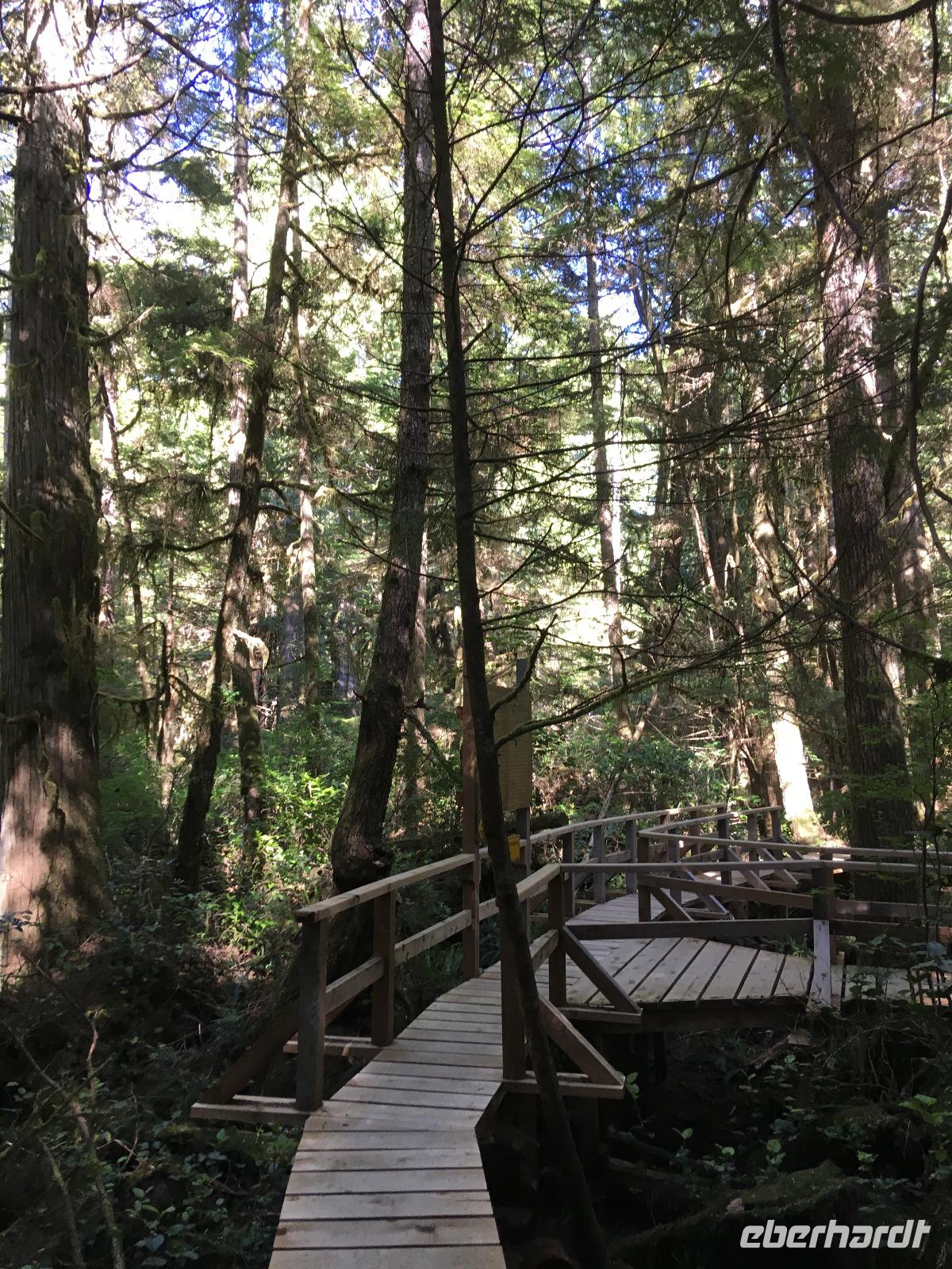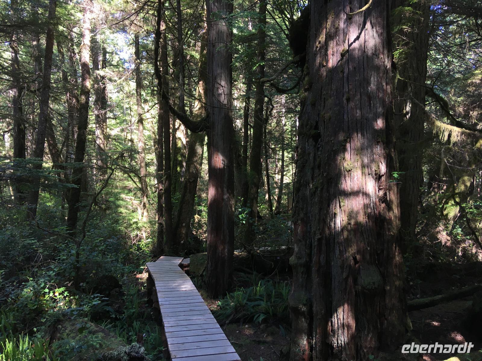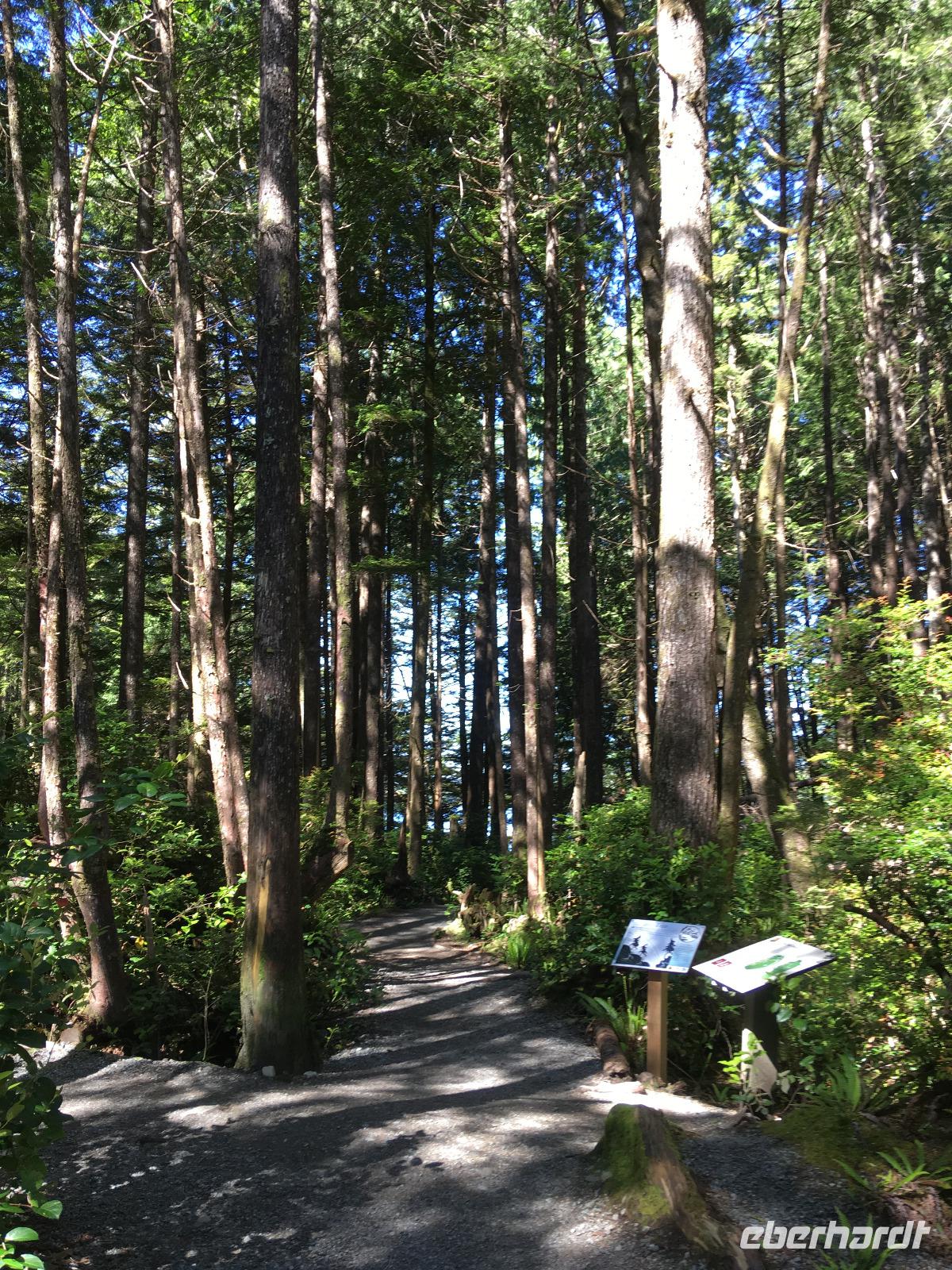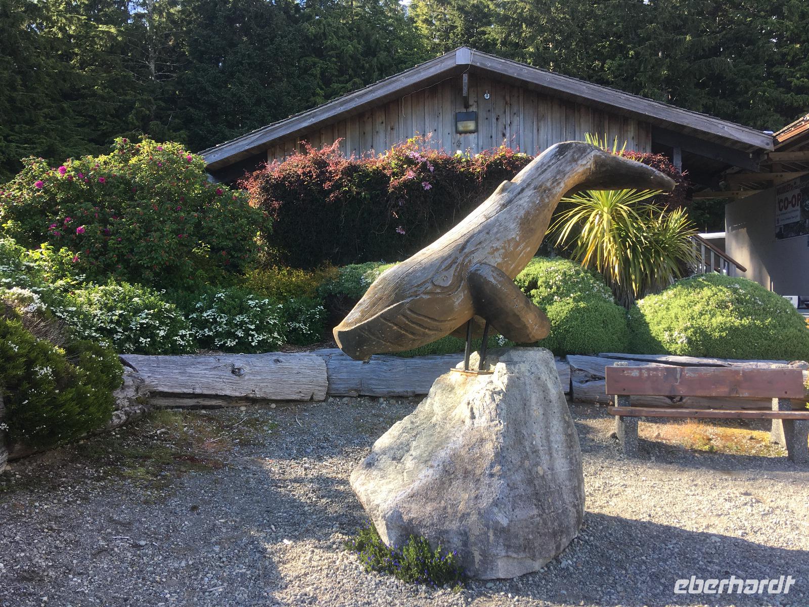 Es geht also heute auf dem Sea-to-Sky-Highway wieder ein Stück zurück Richtung Vancouver. An der Horseshoe Bay befindet sich der Hafen für die Fähren nach Nanaimo auf Vancouver Island. Die Überfahrt ist sehr ruhig und schön; wir halten oben an Deck Ausschau nach Delfinen und Walen. Hinter uns verblassen die Berge des Küstengebirges am Horizont, vor uns tauchen irgendwann die Wälder Vancouver Islands auf. Über 450 km ist die Insel lang und bis zu 100 km breit. In Nanaimo angekommen, machen wir uns auch gleich Richtung Westen auf, denn wir müssen die Insel noch komplett durchqueren. In Coombs machen wir Mittagspause an einem etwas merkwürdigen Ort mit vielen Statuen und einem Markt mit Ziegen auf dem Dach. Doch es gibt für jeden etwas zu essen und sogar leckeres Eis. Dann haben wir es nicht mehr weit bis zum MacMillan Provincial Park, auch unter dem Namen Cathedral Grove bekannt. Mehrere kurze Wanderwege führen hier durch einen Hain mit uralten Douglasien. Über 800 Jahre sollen einige der Baumriesen hier sein, der höchste von ihnen fast 90 m hoch. Wenn diese Bäume sprechen könnten... An verschiedenen Seen führt uns die Fahrt dann vorbei, darunter am Kennedy Lake, dem größten See der Insel. Die Straße wird zunehmend schlechter, besonders der letzte Abschnitt vor der Westküste hat es in sich, aber unser Busfahrer meistert ihn mit Bravour. Dafür hat er sich am Besucherzentrum des Pacific Rim National Parks auch eine Pause verdient. Nun ist es nicht mehr weit bis zu unserem Hotel in Tofino. Das Abendessen, das dort auf uns wartet, ist auch wirklich köstlich; gern möchten wir den Koch für die restlichen Tage mitnehmen. Reichhaltig ist es auch, weshalb ich einen Verdauungsspaziergang zum Chesterman Beach unweit des Hotels vorschlage, dem sich auch fast alle anschließen. So bekommen wir dann nach den langen Busfahrten der letzten Tage auch wieder etwas Bewegung.