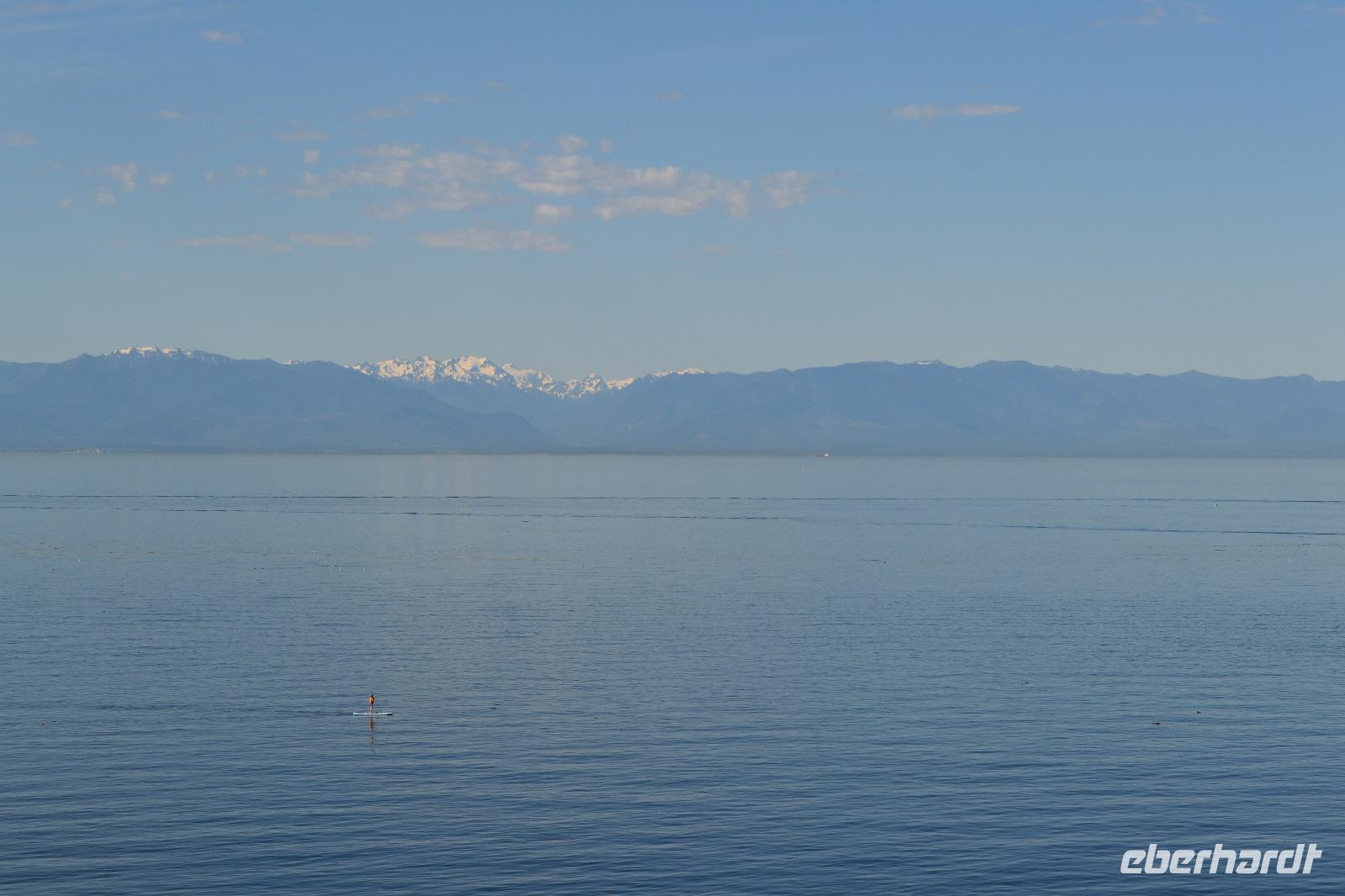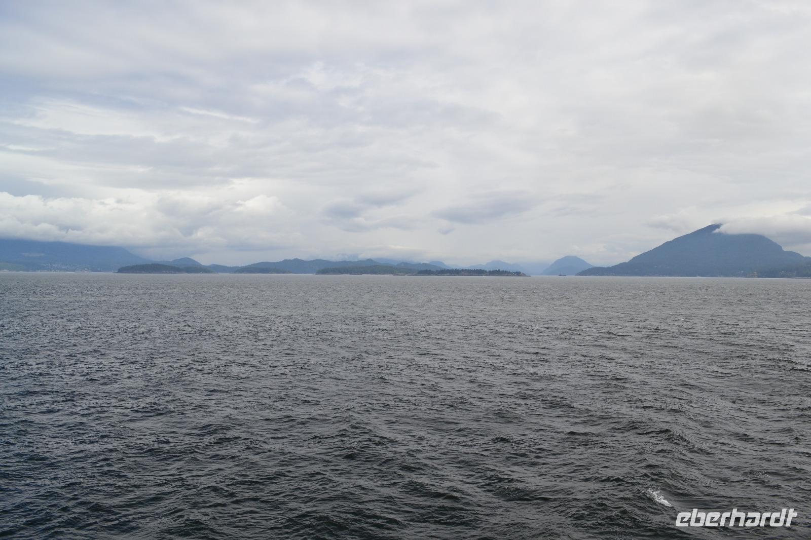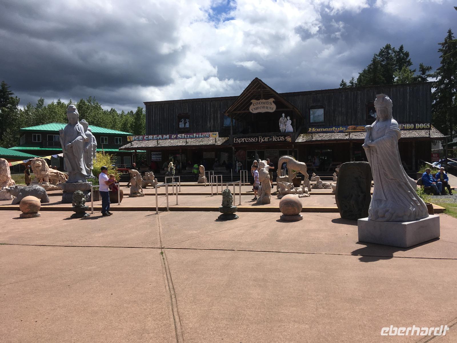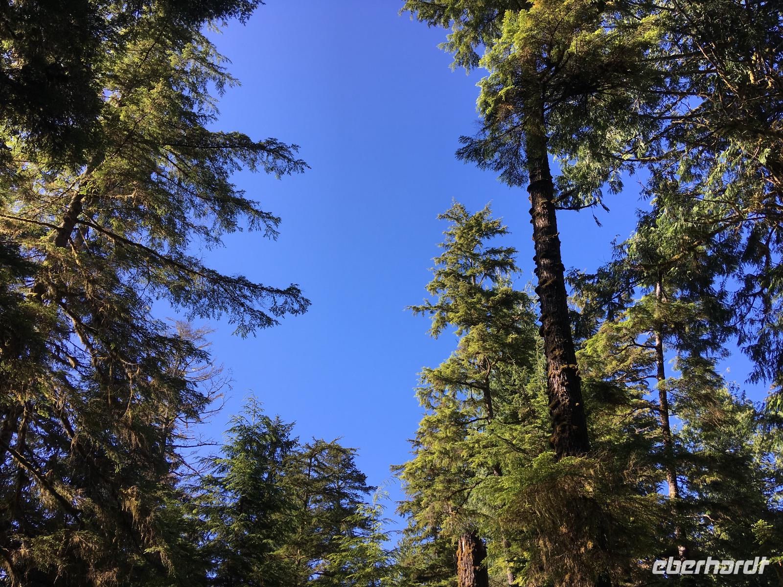 Es geht also heute auf dem Sea-to-Sky-Highway wieder ein Stück zurück Richtung Vancouver. An der Horseshoe Bay befindet sich der Hafen für die Fähren nach Nanaimo auf Vancouver Island. Die Überfahrt ist sehr ruhig und schön; wir halten oben an Deck Ausschau nach Delfinen und Walen. Hinter uns verblassen die Berge des Küstengebirges am Horizont, vor uns tauchen irgendwann die Wälder Vancouver Islands auf. Über 450 km ist die Insel lang und bis zu 100 km breit. In Nanaimo angekommen, machen wir uns auch gleich Richtung Westen auf, denn wir müssen die Insel noch komplett durchqueren. In Coombs machen wir Mittagspause an einem etwas merkwürdigen Ort mit vielen Statuen und einem Markt mit Ziegen auf dem Dach. Doch es gibt für jeden etwas zu essen und sogar leckeres Eis. Dann haben wir es nicht mehr weit bis zum MacMillan Provincial Park, auch unter dem Namen Cathedral Grove bekannt. Mehrere kurze Wanderwege führen hier durch einen Hain mit uralten Douglasien. Über 800 Jahre sollen einige der Baumriesen hier sein, der höchste von ihnen fast 90 m hoch. Wenn diese Bäume sprechen könnten... An verschiedenen Seen führt uns die Fahrt dann vorbei, darunter am Kennedy Lake, dem größten See der Insel. Die Straße wird zunehmend schlechter, besonders der letzte Abschnitt vor der Westküste hat es in sich, aber unser Busfahrer meistert ihn mit Bravour. Dafür hat er sich am Besucherzentrum des Pacific Rim National Parks auch eine Pause verdient. Nun ist es nicht mehr weit bis zu unserem Hotel in Tofino. Das Abendessen, das dort auf uns wartet, ist auch wirklich köstlich; gern möchten wir den Koch für die restlichen Tage mitnehmen. Reichhaltig ist es auch, weshalb ich einen Verdauungsspaziergang zum Chesterman Beach unweit des Hotels vorschlage, dem sich auch fast alle anschließen. So bekommen wir dann nach den langen Busfahrten der letzten Tage auch wieder etwas Bewegung.