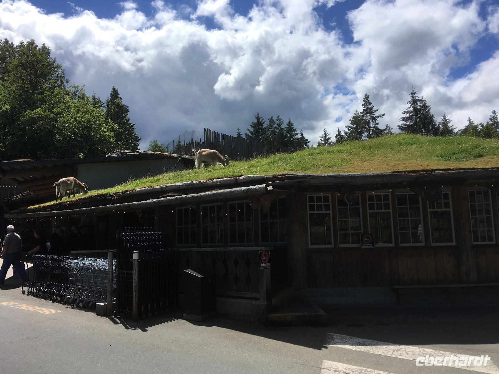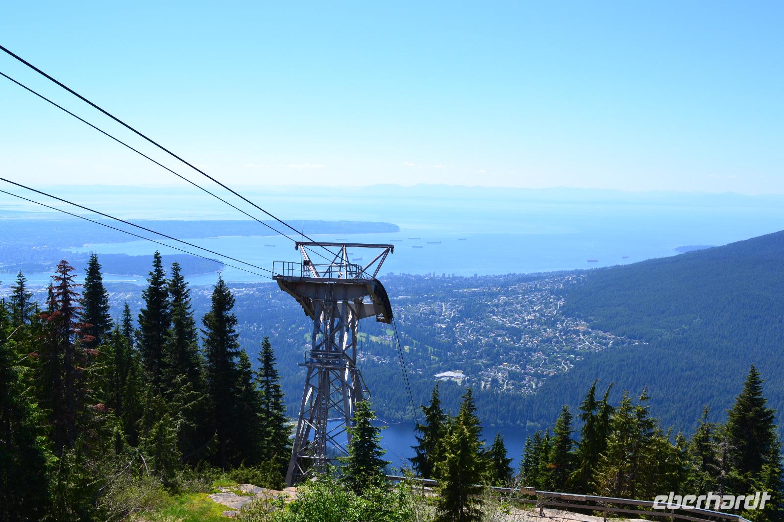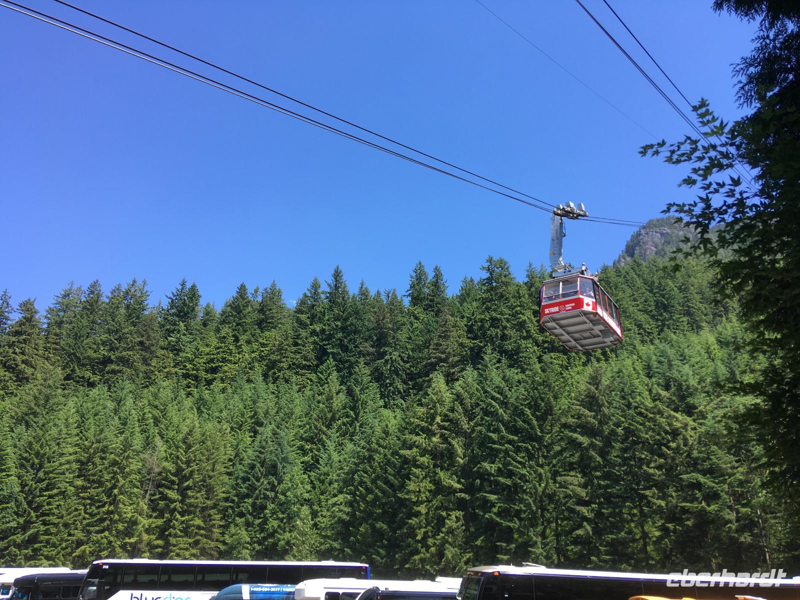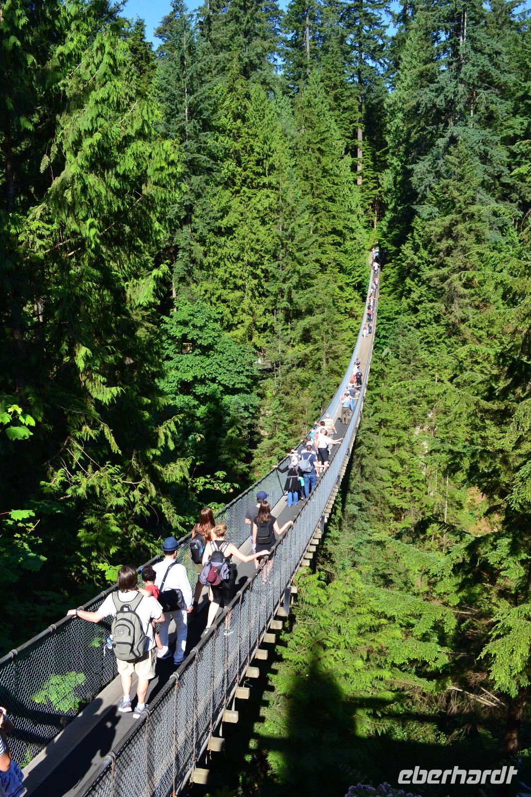 Da alle Gäste den Ausflug in den grünen Norden Vancouvers gebucht haben, starten wir gemeinsam mit dem Bus und fahren zur Capilano Suspension Bridge. Der schottische Ingenieur George Grant Mackay errichtete die erste Version dieser Brücke 1888-89, um seine Hütte auf der anderen Seite des Canyons zu erreichen. Als mutige Kanada-Abenteurer trauen wir uns natürlich alle über die 136 Meter lange Hängebrücke, 70 Meter über dem Capilano River, erklimmen den Baumwipfelpfad oder wagen tatsächlich den Spaziergang über die neu errichtete Glasbodenbrücke. In der Capilano Salmon Hatchery erklärt uns Al anschließend den Lebenskreislauf der Lachse und erzählt uns, welche Unterarten es hier gibt. Bei einer leichten Wanderung durch den Wald können wir immer wieder einen Blick auf den unter uns rauschenden Fluss erhaschen und ein paar Angler beobachten, die hier ihr Glück versuchen. Zum Abschluss unseres Ausflugs fahren wir mit der Gondel auf den Grouse Mountain, den Hausberg Vancouvers - den berühmten Treppenpfad „Grouse Grind" möchte niemand freiwillig mit mir laufen. Im Winter wird der Grouse Mountain von Wintersportfans in Beschlag genommen. Heute aber brennt wieder die Sonne vom Himmel, sodass wir uns oben angekommen erstmal in den Schatten flüchten und uns kurz orientieren. Meine Gäste können das Gipfelplateau auf eigenen Faust erkunden - einige möchten sich nach den morgendlichen Spaziergängen verständlicherweise stärken. Bekannte Attraktionen auf dem Grouse Mountain sind das Bärengehege, in dem zwei Grizzly-Bären leben, die als Waisenkinder in den Straßen Vancouvers aufgegriffen wurden, und die Holzfällershow. Bei dem schönen Wetter sind wir nicht die einzigen Besucher auf dem Berg, und so ist die Gondel auch auf der Rückfahrt wieder ziemlich voll. Aber natürlich schaffen wir es alle heil nach unten. Zusammen mit den meisten Gästen lasse ich mich dann in der Innenstadt von Vancouver absetzen, denn wir wollen den freien Nachmittag und Abend nutzen, um noch ein paar schöne Fotos zu machen und letzte Souvenirs zu kaufen.