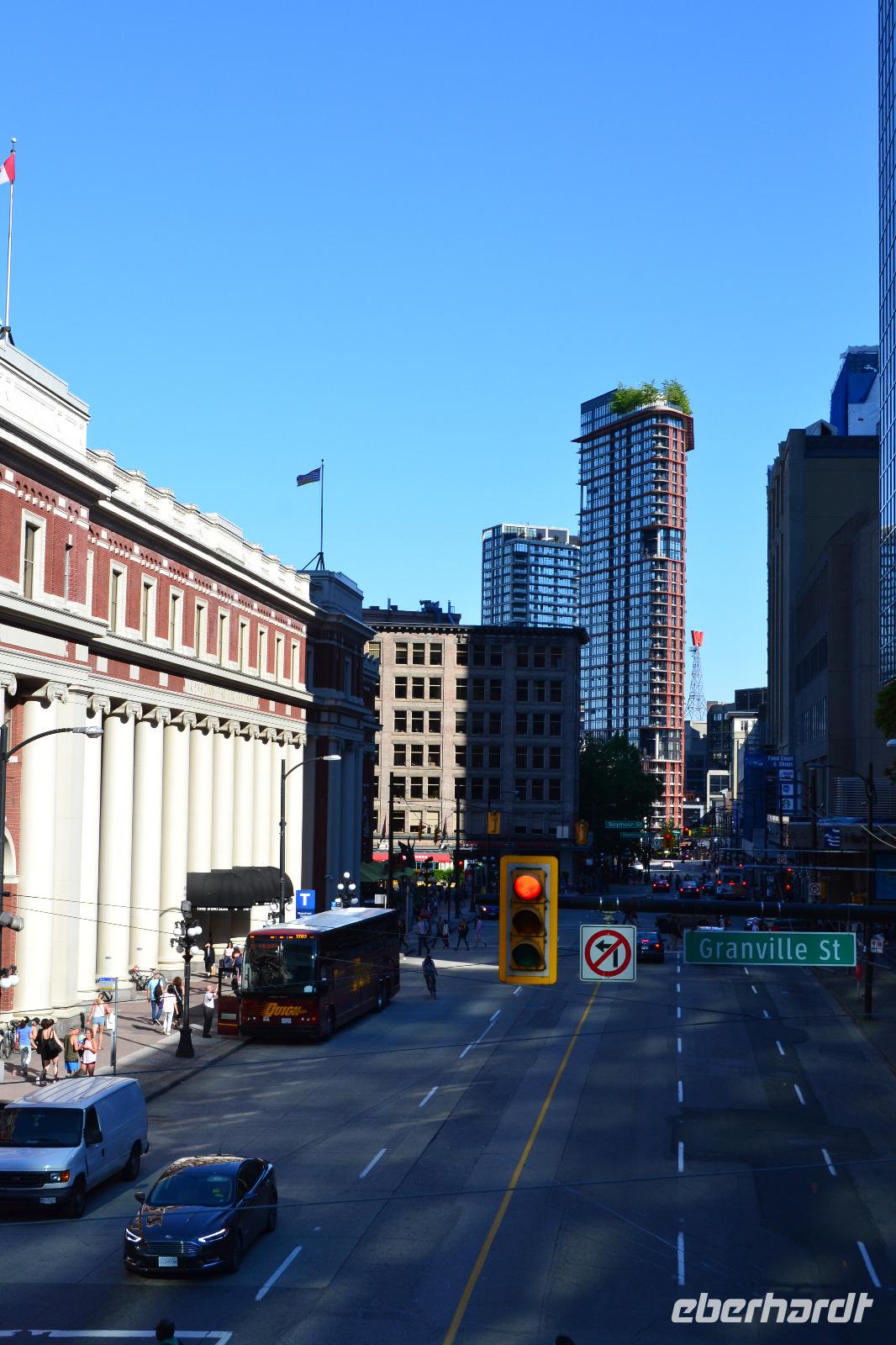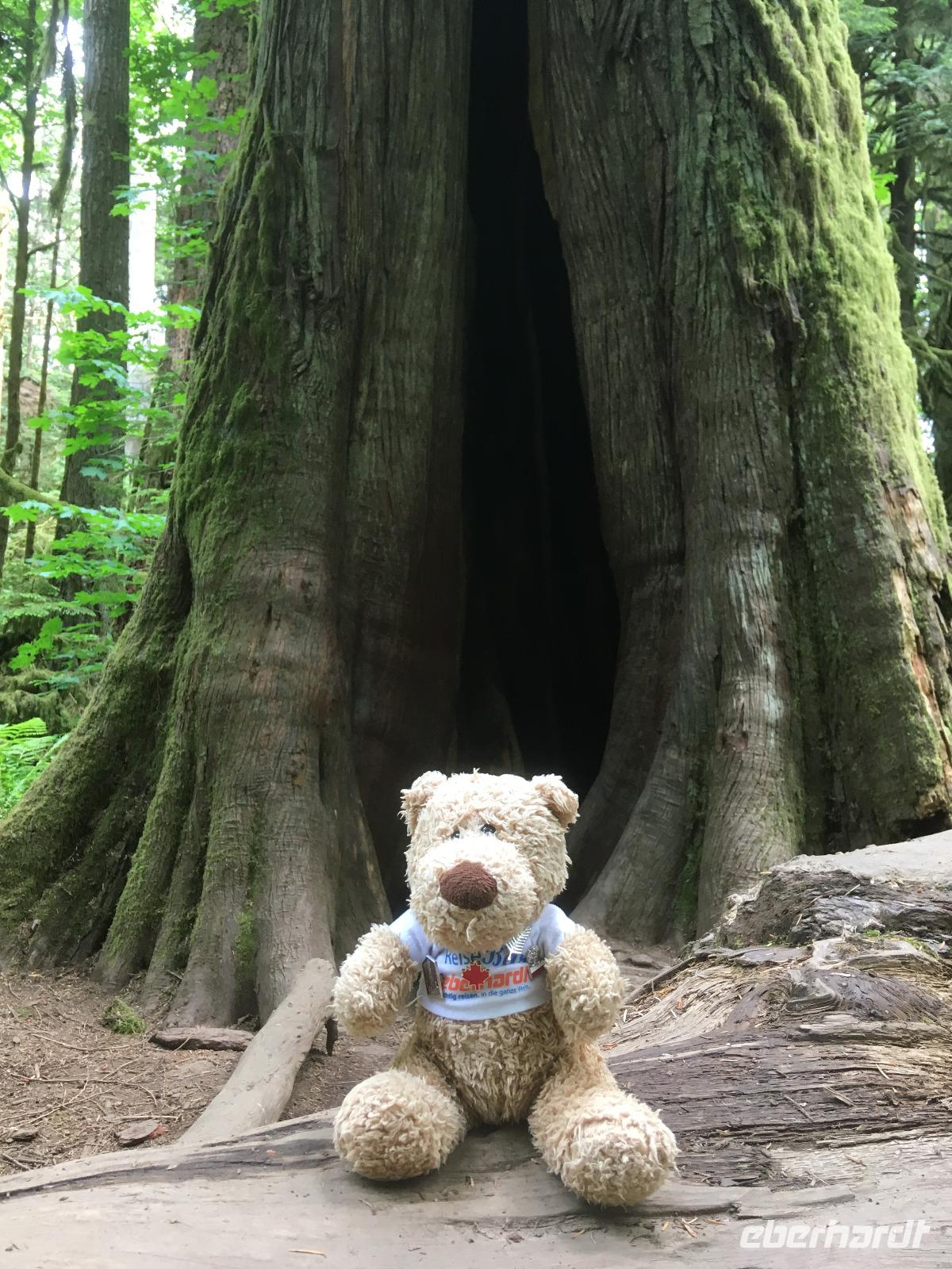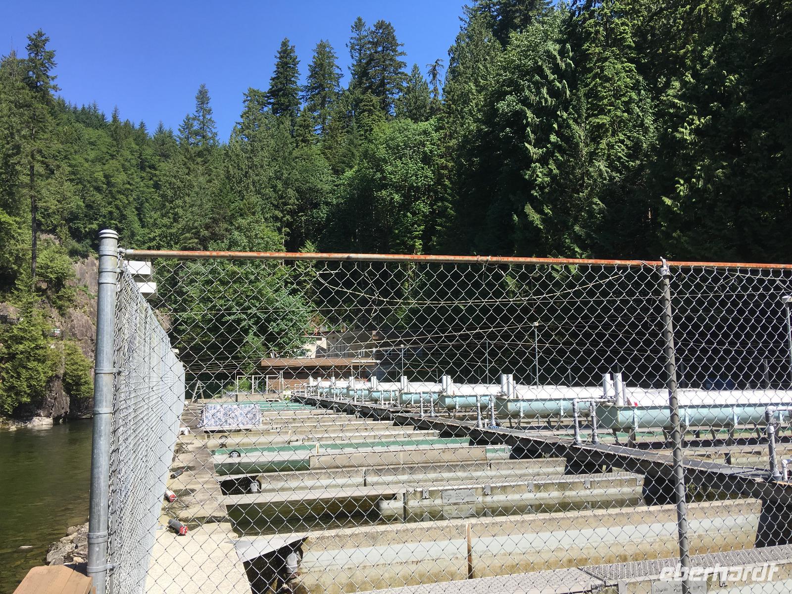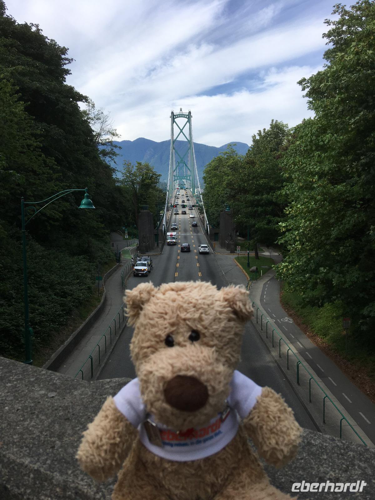 Da alle Gäste den Ausflug in den grünen Norden Vancouvers gebucht haben, starten wir gemeinsam mit dem Bus und fahren zur Capilano Suspension Bridge. Der schottische Ingenieur George Grant Mackay errichtete die erste Version dieser Brücke 1888-89, um seine Hütte auf der anderen Seite des Canyons zu erreichen. Als mutige Kanada-Abenteurer trauen wir uns natürlich alle über die 136 Meter lange Hängebrücke, 70 Meter über dem Capilano River, erklimmen den Baumwipfelpfad oder wagen tatsächlich den Spaziergang über die neu errichtete Glasbodenbrücke. In der Capilano Salmon Hatchery erklärt uns Al anschließend den Lebenskreislauf der Lachse und erzählt uns, welche Unterarten es hier gibt. Bei einer leichten Wanderung durch den Wald können wir immer wieder einen Blick auf den unter uns rauschenden Fluss erhaschen und ein paar Angler beobachten, die hier ihr Glück versuchen. Zum Abschluss unseres Ausflugs fahren wir mit der Gondel auf den Grouse Mountain, den Hausberg Vancouvers - den berühmten Treppenpfad „Grouse Grind" möchte niemand freiwillig mit mir laufen. Im Winter wird der Grouse Mountain von Wintersportfans in Beschlag genommen. Heute aber brennt wieder die Sonne vom Himmel, sodass wir uns oben angekommen erstmal in den Schatten flüchten und uns kurz orientieren. Meine Gäste können das Gipfelplateau auf eigenen Faust erkunden - einige möchten sich nach den morgendlichen Spaziergängen verständlicherweise stärken. Bekannte Attraktionen auf dem Grouse Mountain sind das Bärengehege, in dem zwei Grizzly-Bären leben, die als Waisenkinder in den Straßen Vancouvers aufgegriffen wurden, und die Holzfällershow. Bei dem schönen Wetter sind wir nicht die einzigen Besucher auf dem Berg, und so ist die Gondel auch auf der Rückfahrt wieder ziemlich voll. Aber natürlich schaffen wir es alle heil nach unten. Zusammen mit den meisten Gästen lasse ich mich dann in der Innenstadt von Vancouver absetzen, denn wir wollen den freien Nachmittag und Abend nutzen, um noch ein paar schöne Fotos zu machen und letzte Souvenirs zu kaufen.