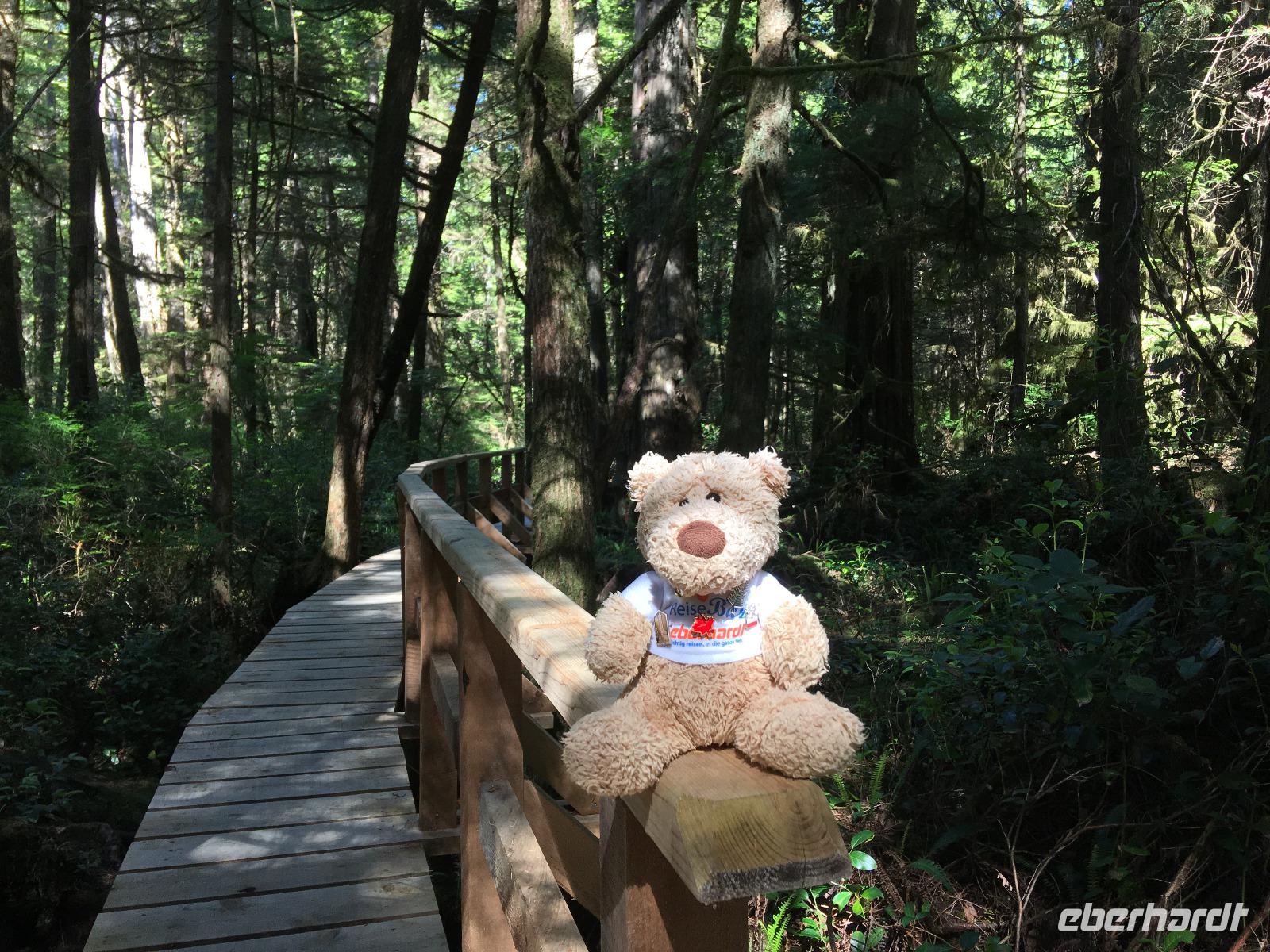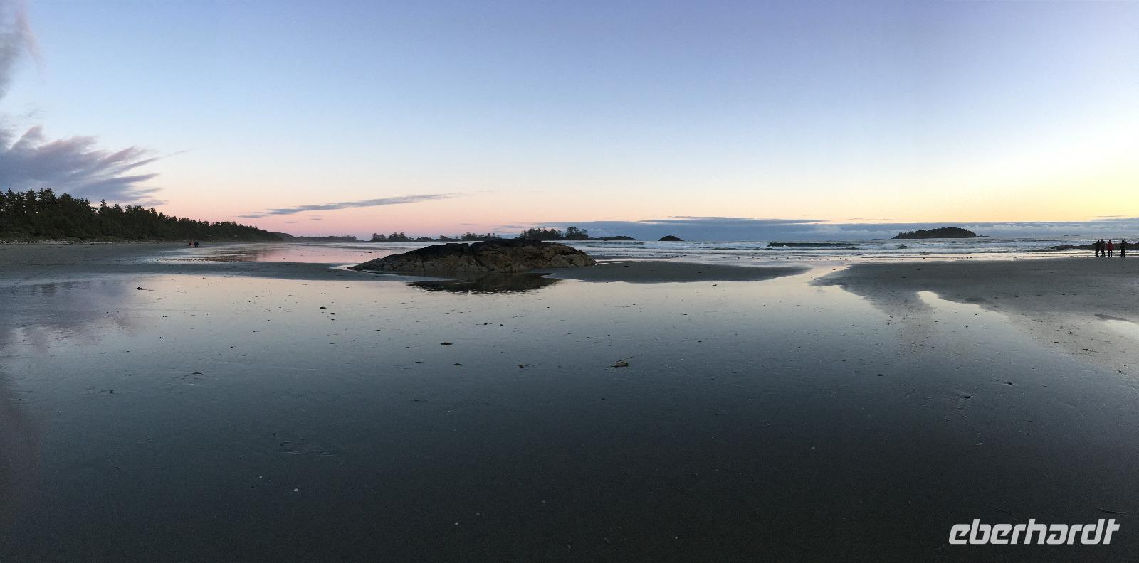 Der heutige Tag soll unser aller Entspannung dienen - ein bisschen Ruhe und Entschleunigung nach den langen Busfahrten an den Tagen zuvor, ein bisschen Erholung am Strand. Zumal wir diesmal großes Glück haben mit dem Wetter - wir sind mitten im Regenwald und es fällt den ganzen Tag kein einziger Tropfen; stattdessen blauer Himmel und Sonne vom Morgen bis zum Abend. Geplant sind für heute ein Spaziergang durch den Regenwald auf einem Naturlehrpfad, ein Aufenthalt am Wickaninnish Beach und Freizeit in Tofino. Wir beginnen mit letzterem, denn einige Gäste hatten zuvor nach einer Whale Watching Tour gefragt, und hier in Tofino besteht dafür die einzige Gelegenheit auf der ganzen Reise. Während also fünf Gäste aufbrechen, um in einem kleinen Boot die seltenen Grauwale zu finden, kann der Rest der Gruppe entweder auf eigene Faust Tofino erkunden, Vorräte für die nächsten Tage kaufen, nach ein paar Souvenirs jagen, oder mit mir zum Tonquin Beach laufen. Der kleine, aber sehr schöne Strand ist nach einem amerikanischen Handelsschiff benannt, das 1811 nach einer Explosion gesunken ist. Das Wrack wurde vom Sand verschluckt und bis heute nicht gefunden, mit Ausnahme des Ankers. Hobbyschatzsucher geben die Hoffnung auf einen reichen Fund jedoch nicht auf. Wir finden zwar keinen Schatz, aber dafür viele Seesterne, die sich an einen Felsen krallen und auf die Flut warten. Als sie dann kommt (plötzlich ist besagter Felsen wieder rundum vom Wasser umspült), treten wir langsam den Rückweg durch den Regenwald an. Als kleine Entschädigung für den ausgefallenen Stopp an der Hat Creek Ranch hat uns unsere örtliche Partneragentur ein zusätzliches Mittagessen organisiert. Wir fahren also nach Ucluelet und bekommen dort alle eine große Portion Fish & Chips. Frisch gestärkt rollen wir nun sozusagen den Pazifik Rim National Park von hinten auf und besichtigen zuerst den Wickaninnish Beach. Hier am Kwisitis Visitor Centre beginnt der mit Abstand längste Strand auf Vancouver Island, der sich über eine Länge von mehr als 16 km erstreckt und mit ganz viel Strandgut (Holz) übersät ist. Nun wird es Zeit für unsere Wanderung durch den Regenwald. Dieser schöne Küstenregenwald mit der Sitka-Fichte als dominierender Baumart zählt zu den artenreichsten Ökosystemen der gemäßigten Klimazone. Es soll auch hier Schwarzbären geben, und wir hören viele Vögel und unheimliche Geräusche. Wie viele Augen uns wohl heimlich aus dem Dickicht des Waldes (zurück)beobachten? Nach einem weiteren Aufenthalt am anderen Ende des langen Strandes, der hier auch den Namen „Long Beach" trägt, fahren wir ins Hotel zurück. Für den Abend empfehle ich meinen Gästen, sich am Mackenzie Beach, der sich ebenfalls in Laufnähe des Hotels befindet, den Sonnenuntergang anzuschauen. Das machen auch fast alle, entweder mit mir oder individuell, wodurch dieser schöne Tag auf Vancouver Island würdig abgerundet wird.