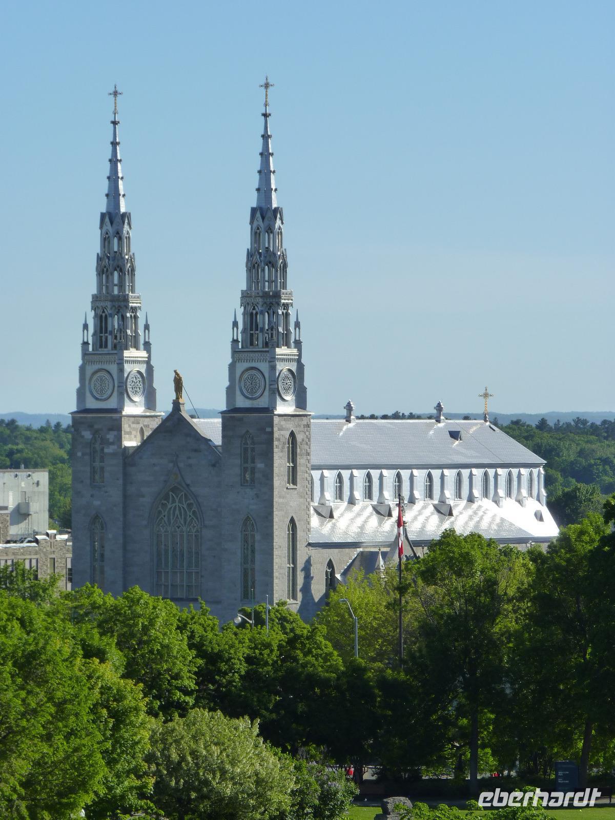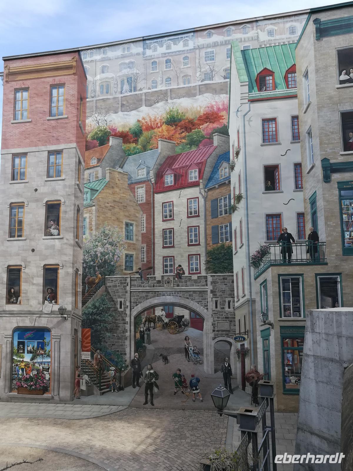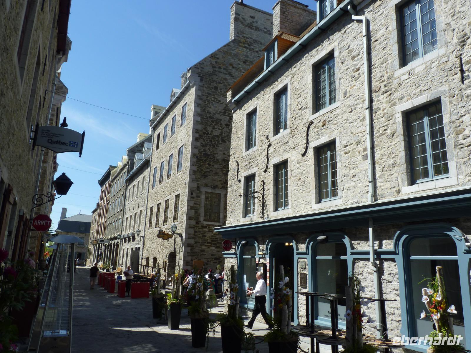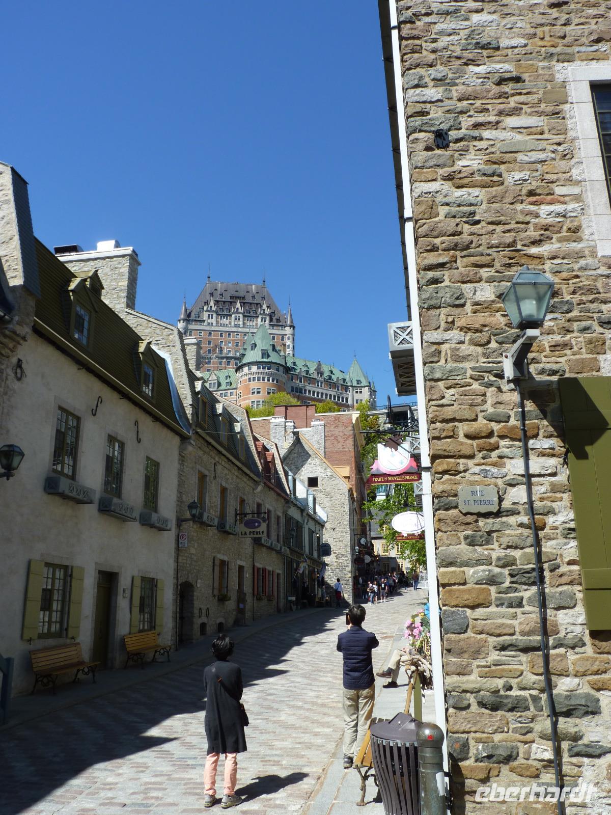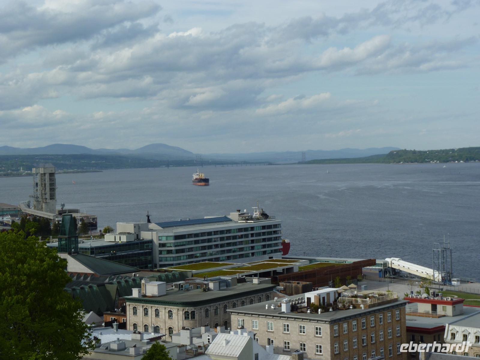 Montreal schützt seine Stadtführer und so begrüßten wir am Morgen Bettina, die uns bei einem Stadtrundgang die wichtigsten Sehenswürdigkeiten ihrer Stadt zeigen wollte. Wir machten einen Stopp auf der Insel Saint-Helene mit seinem wunderbaren Blick auf die Skyline der Stadt, befuhren die Insel Notre-Dame mit seiner Formel 1-Strecke, um dann in der Stadt in den Untergrund abzutauchen. Besser gesagt in die unterirdischen Passagen der Ville Souterrainne, einem Netz von insgesamt 30 km unter der Erde gelegenen Wegen, meist mit Geschäften ausgestattet, die den Bewohnern im Winter ein problemloses Fortkommen angesichts der Kälte und des Schnees sichern sollen. Weiter ging es zur Kathedrale Notre Dame, einer von außen sehr schlichten, aber innen üppig ausgestatteten Kirche. Anschließend unternahmen wir mit Christa noch einen Bummel durch die Altstadt und im weiteren Verlauf den Olympia-Park besuchen und danach in westlicher Richtung nach Quebec aufzubrechen. Auf der Fahrt dorthin machten wir unsere erste Bekanntschaft mit Tim Hortens, eine Art McDonald, aber eher auf Kaffee und süsse Sachen ausgerichtet. Süß, aber lecker und für kanadische Verhältnisse sehr günstig. In Quebec angekommen, wollten wir uns erst einmal die Füße vertreten und unternahmen einen Spaziergang auf der La Promenade des Gouverneurs direkt am berühmten Hotel Chateau Frontenac. Von hier hatten wir einen wunderbaren Ausblick auf den St. Lorenz Strom, der an dieser Stelle mit 800 m recht eng ist (daher der Name Quebec in der Algonkin-Sprache = wo der Fluss sich verengt) und auf die umliegende Gegend. Schon jetzt hatte uns die Stadt in ihren Bann gezogen.