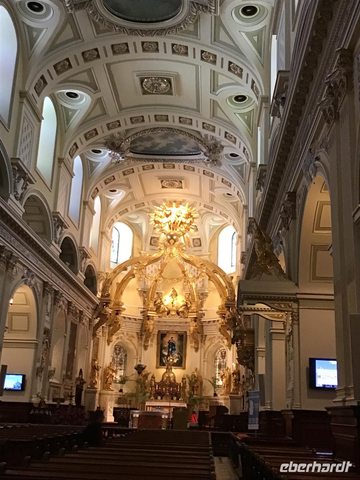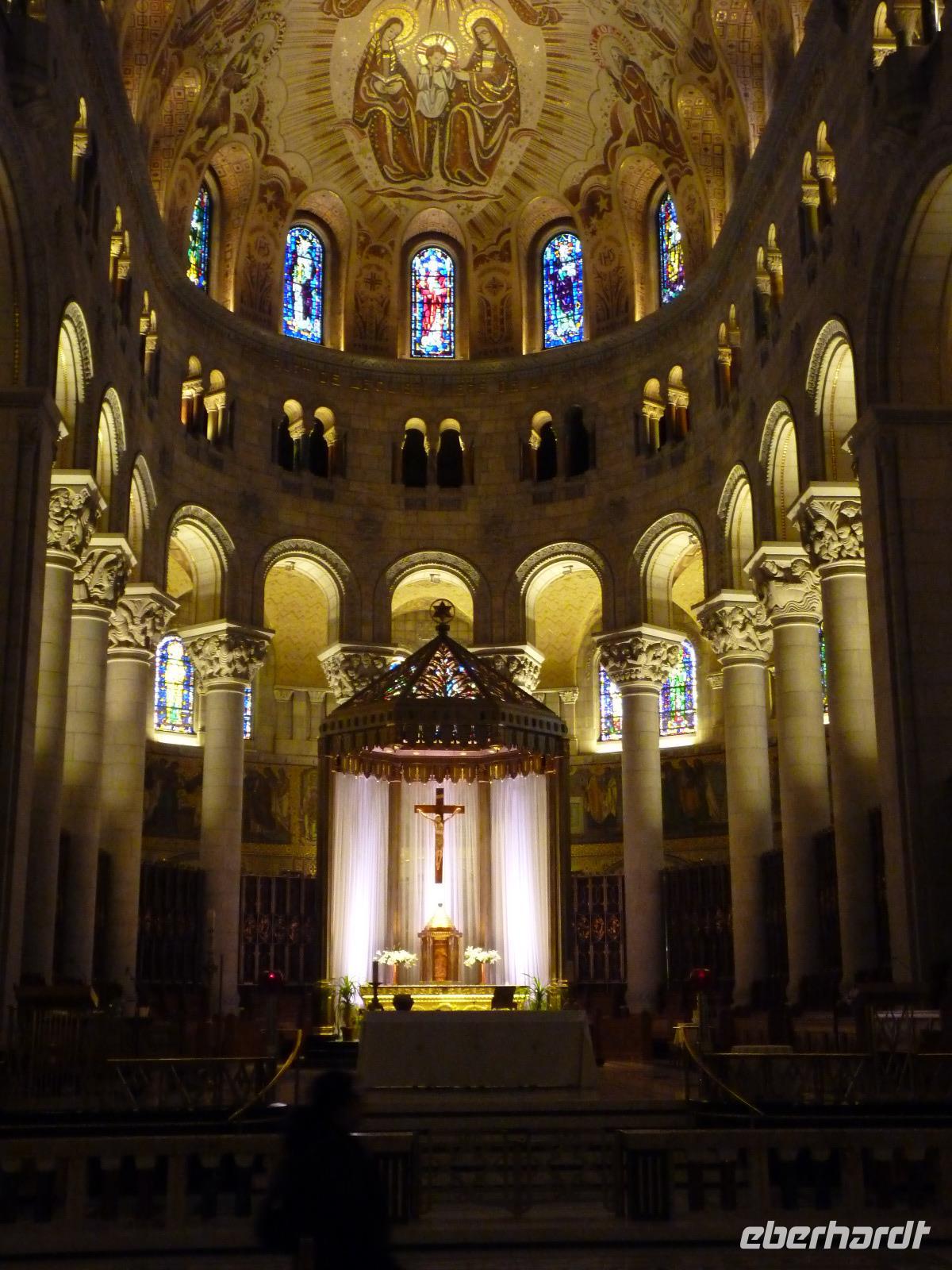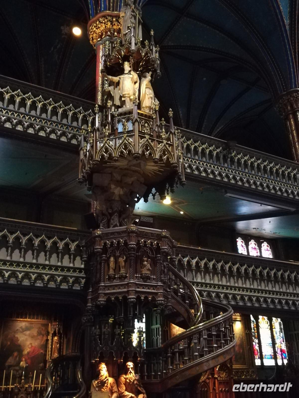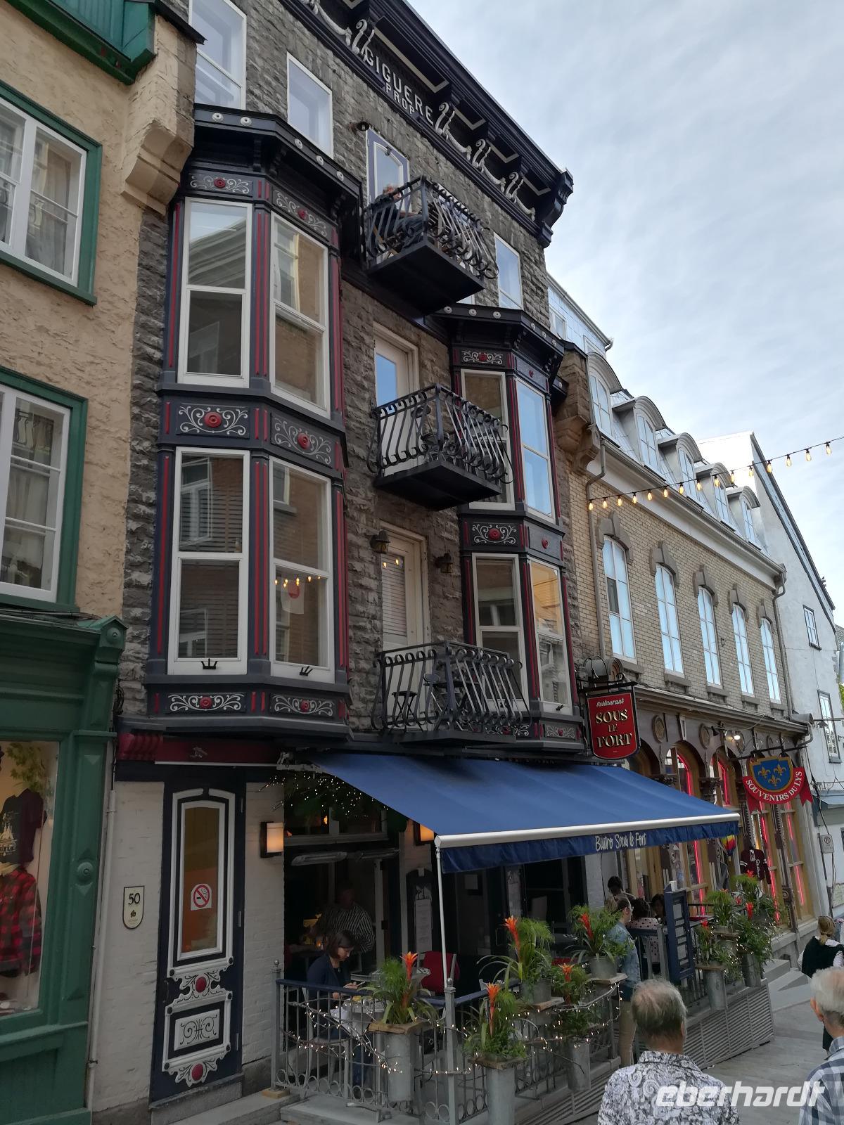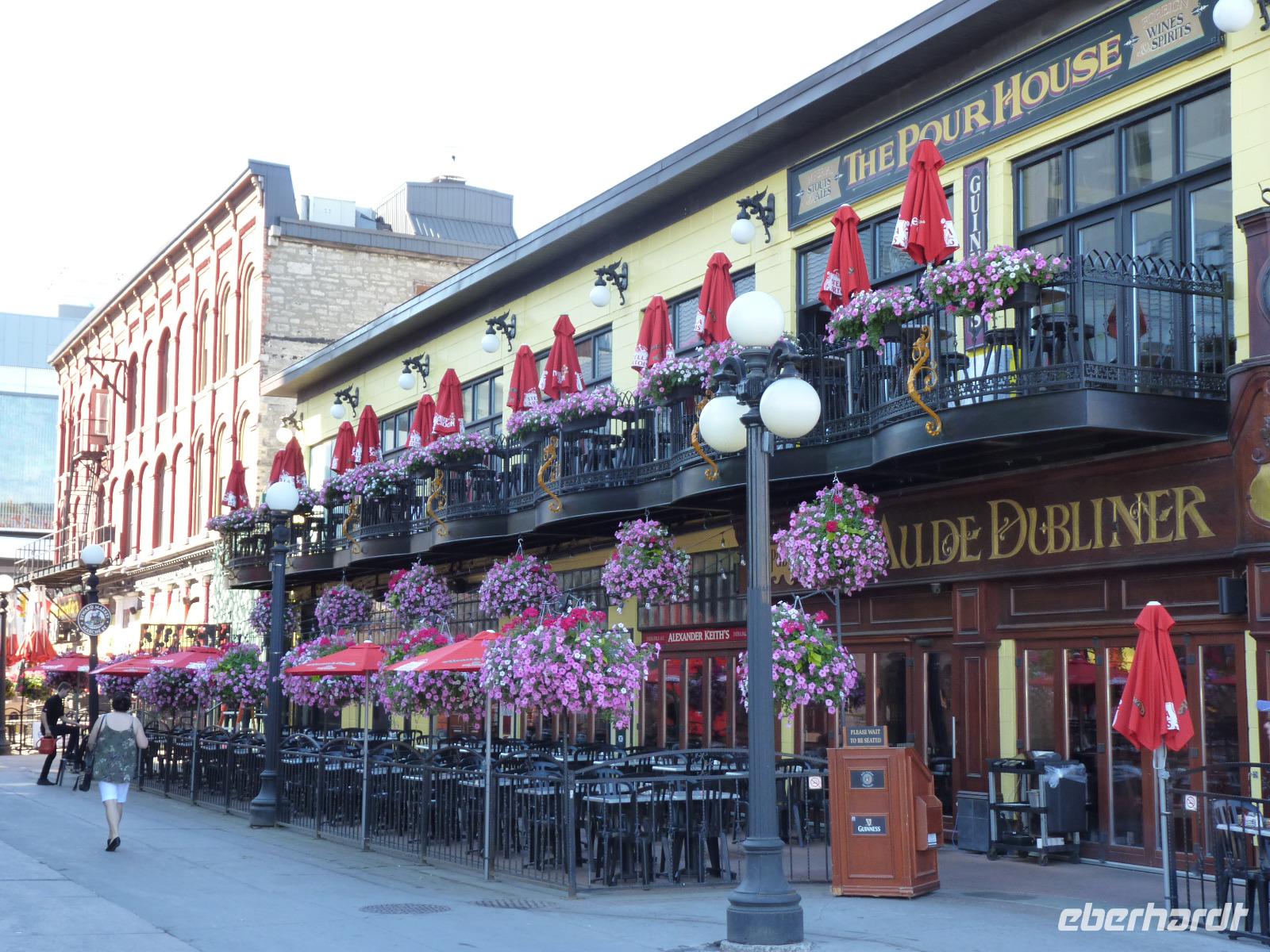 Montreal schützt seine Stadtführer und so begrüßten wir am Morgen Bettina, die uns bei einem Stadtrundgang die wichtigsten Sehenswürdigkeiten ihrer Stadt zeigen wollte. Wir machten einen Stopp auf der Insel Saint-Helene mit seinem wunderbaren Blick auf die Skyline der Stadt, befuhren die Insel Notre-Dame mit seiner Formel 1-Strecke, um dann in der Stadt in den Untergrund abzutauchen. Besser gesagt in die unterirdischen Passagen der Ville Souterrainne, einem Netz von insgesamt 30 km unter der Erde gelegenen Wegen, meist mit Geschäften ausgestattet, die den Bewohnern im Winter ein problemloses Fortkommen angesichts der Kälte und des Schnees sichern sollen. Weiter ging es zur Kathedrale Notre Dame, einer von außen sehr schlichten, aber innen üppig ausgestatteten Kirche. Anschließend unternahmen wir mit Christa noch einen Bummel durch die Altstadt und im weiteren Verlauf den Olympia-Park besuchen und danach in westlicher Richtung nach Quebec aufzubrechen. Auf der Fahrt dorthin machten wir unsere erste Bekanntschaft mit Tim Hortens, eine Art McDonald, aber eher auf Kaffee und süsse Sachen ausgerichtet. Süß, aber lecker und für kanadische Verhältnisse sehr günstig. In Quebec angekommen, wollten wir uns erst einmal die Füße vertreten und unternahmen einen Spaziergang auf der La Promenade des Gouverneurs direkt am berühmten Hotel Chateau Frontenac. Von hier hatten wir einen wunderbaren Ausblick auf den St. Lorenz Strom, der an dieser Stelle mit 800 m recht eng ist (daher der Name Quebec in der Algonkin-Sprache = wo der Fluss sich verengt) und auf die umliegende Gegend. Schon jetzt hatte uns die Stadt in ihren Bann gezogen.