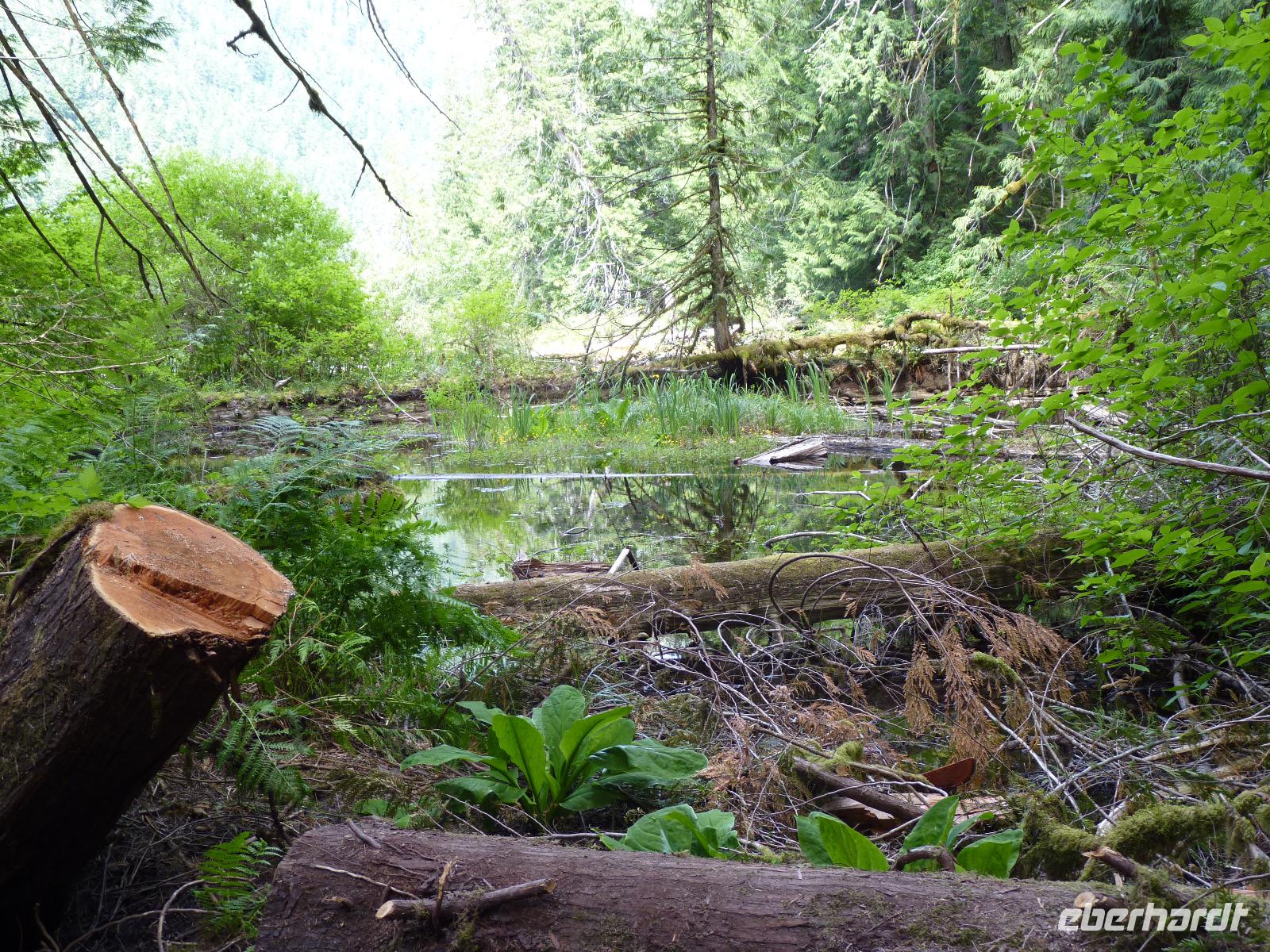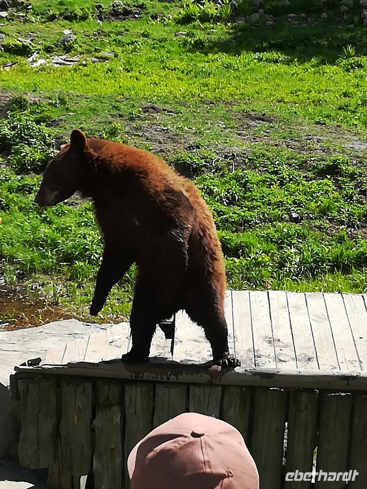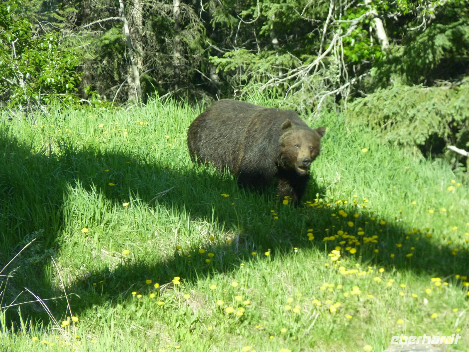 Wir waren noch gar nicht weit gekommen, erlebten wir den Traum aller Besucher des Westen von Kanadas. Wir konnten einen Grizzly beobachten und zahlreiche Fotos von ihm machen, bevor er im Wald verschwand.