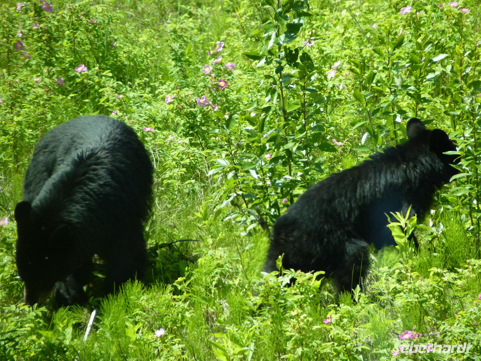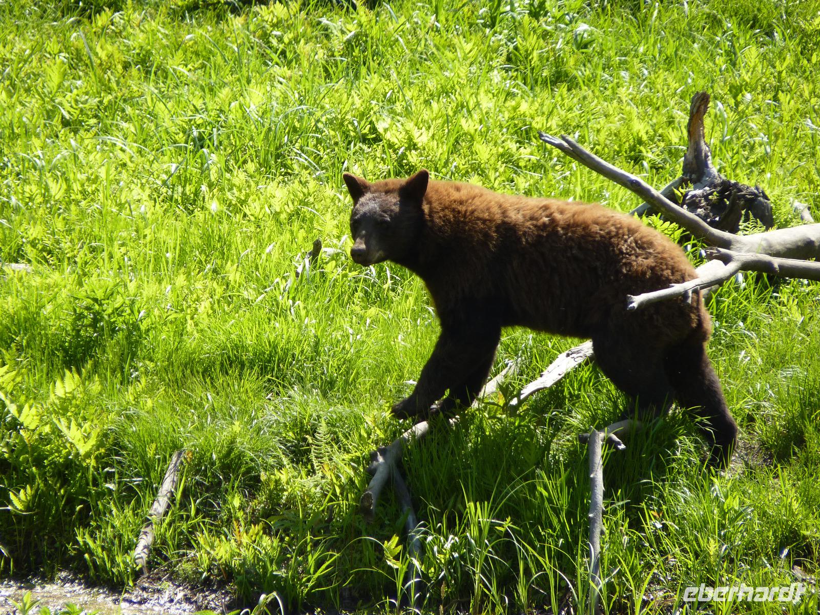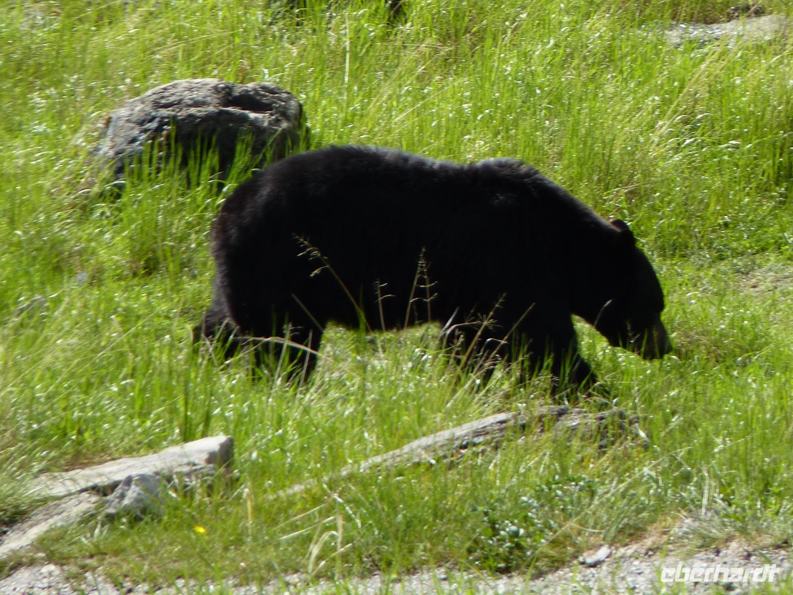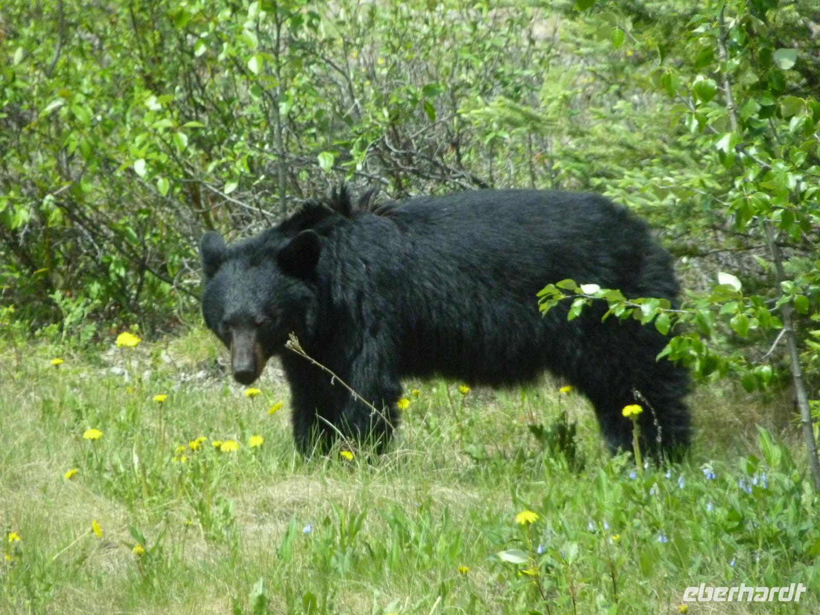Wenn wir schon kein Glück mit den Elchen hatten, Bärenglück hatten wir in jedem Falle. Wir waren noch gar nicht weit vom Mt. Robson weg, da sahen wir eine Schwarzbärin mit zwei Jungen. Die Jungen sahen uns wohl als Gefahr an und verschwanden recht schnell im Wald, aber die Mutter ließ sich Zeit und damit waren wieder etliche Fotos garantiert.