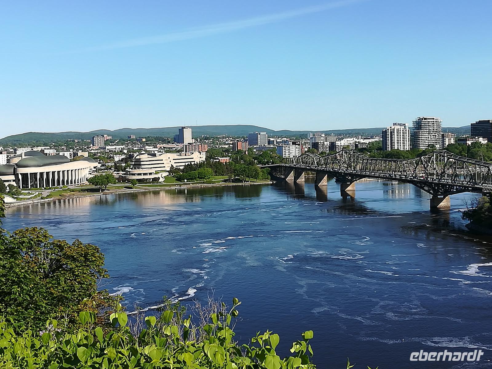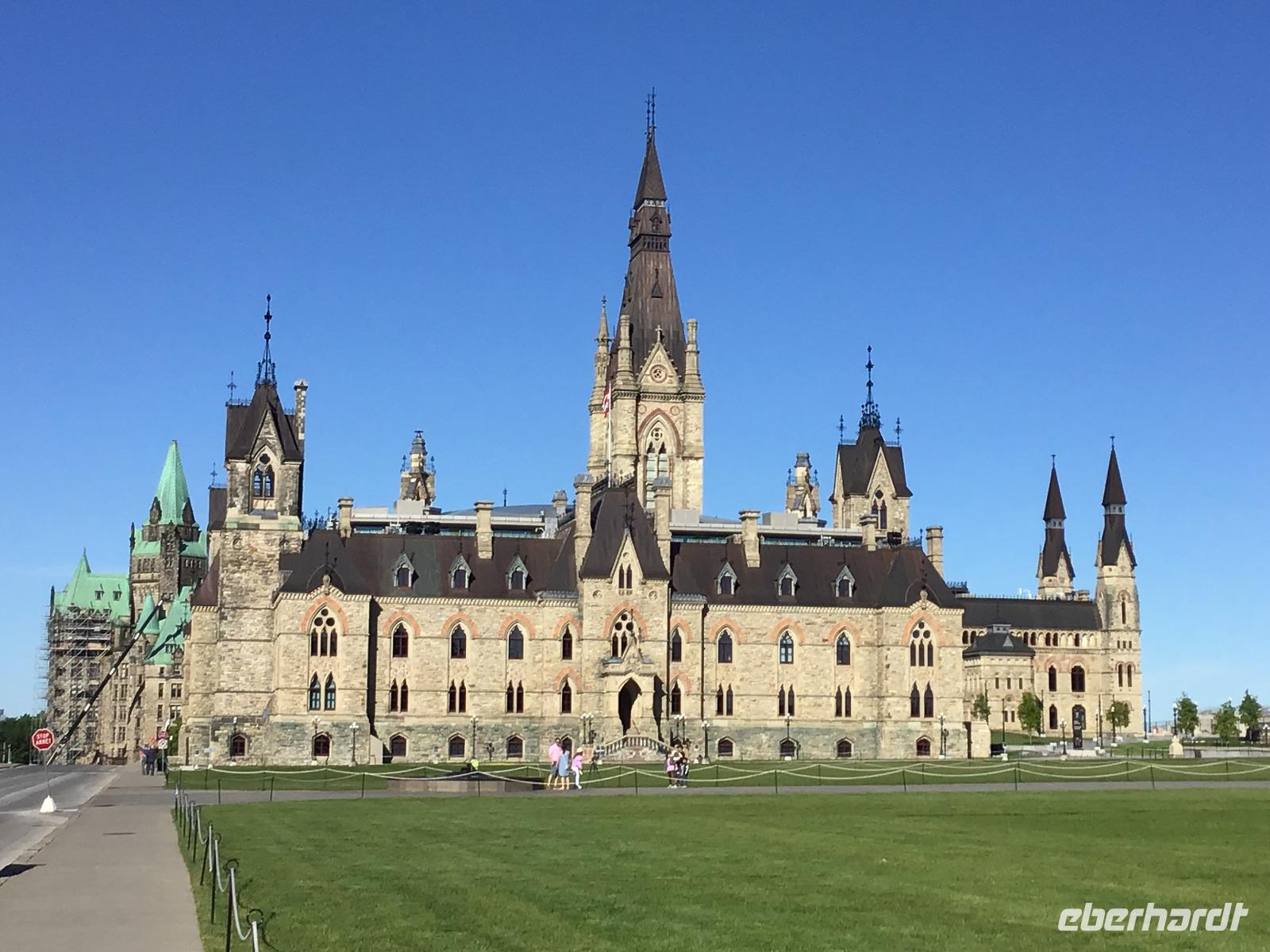 Der Tag begann etwas zeitiger als die Vorherigen, mussten wir doch rund 400 km bis in die kanadische Hauptstadt nach Ottawa zurücklegen und zwischendurch wollten wir ja auch noch Einiges erleben. Während der Busfahrt wurden unsere Gäste durch Christa mit allerlei Wissenswerten oder durch mich mit Geschichten über Kanada und kanadischer Musik unterhalten. Kanada hat auch so seine Eigenheiten im Straßenverkehr. An Bahnübergängen (mit Signalanlagen!) musste unser Bus eine extra für Buse eingerichtete Spur benutzen und zwingend vor dem Bahnübergang stoppen, während PKW´s und LKW´s ohne anzuhalten über den Übergang „brettern" dürfen. Den Sinn dieser Regelung konnte uns Niemand erklären.