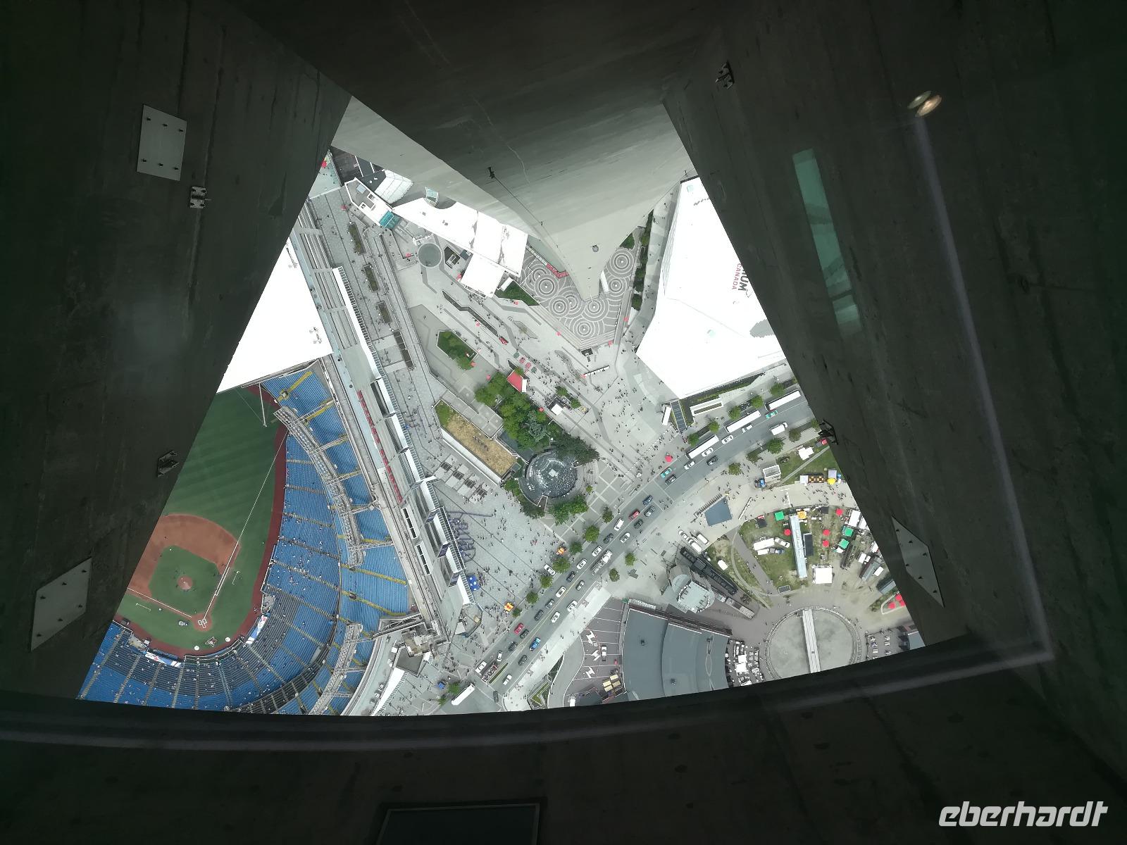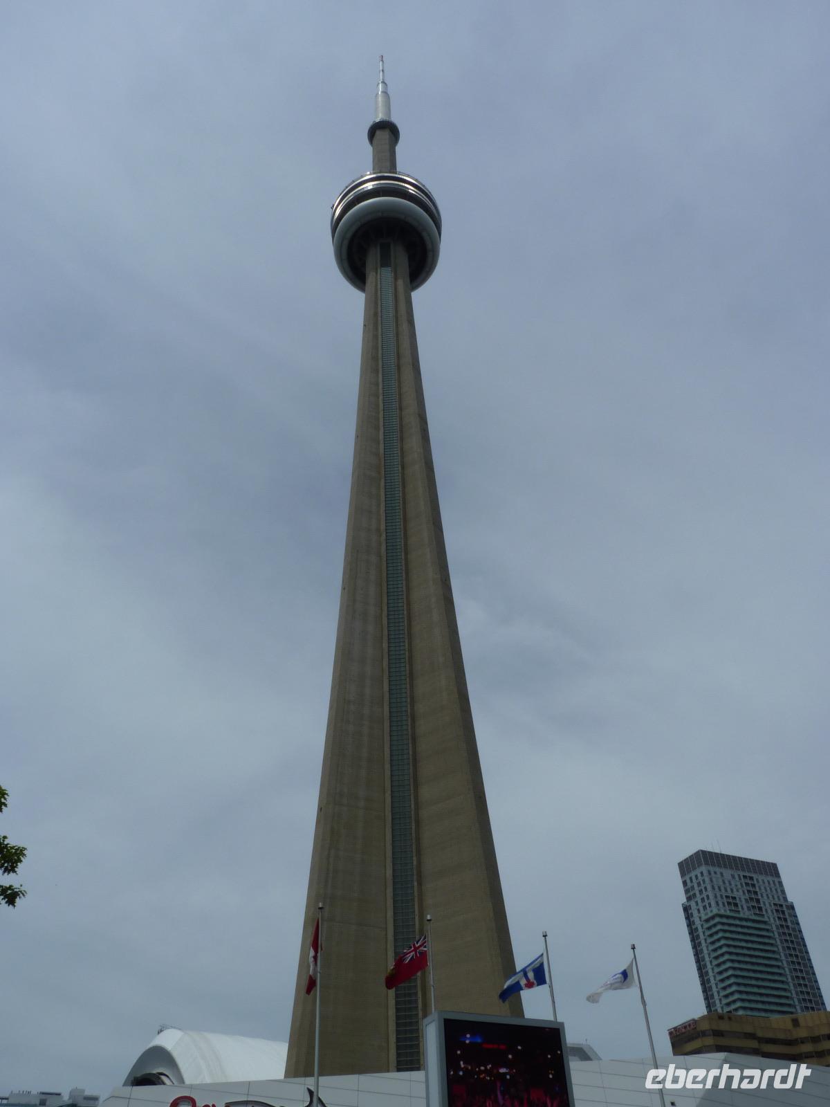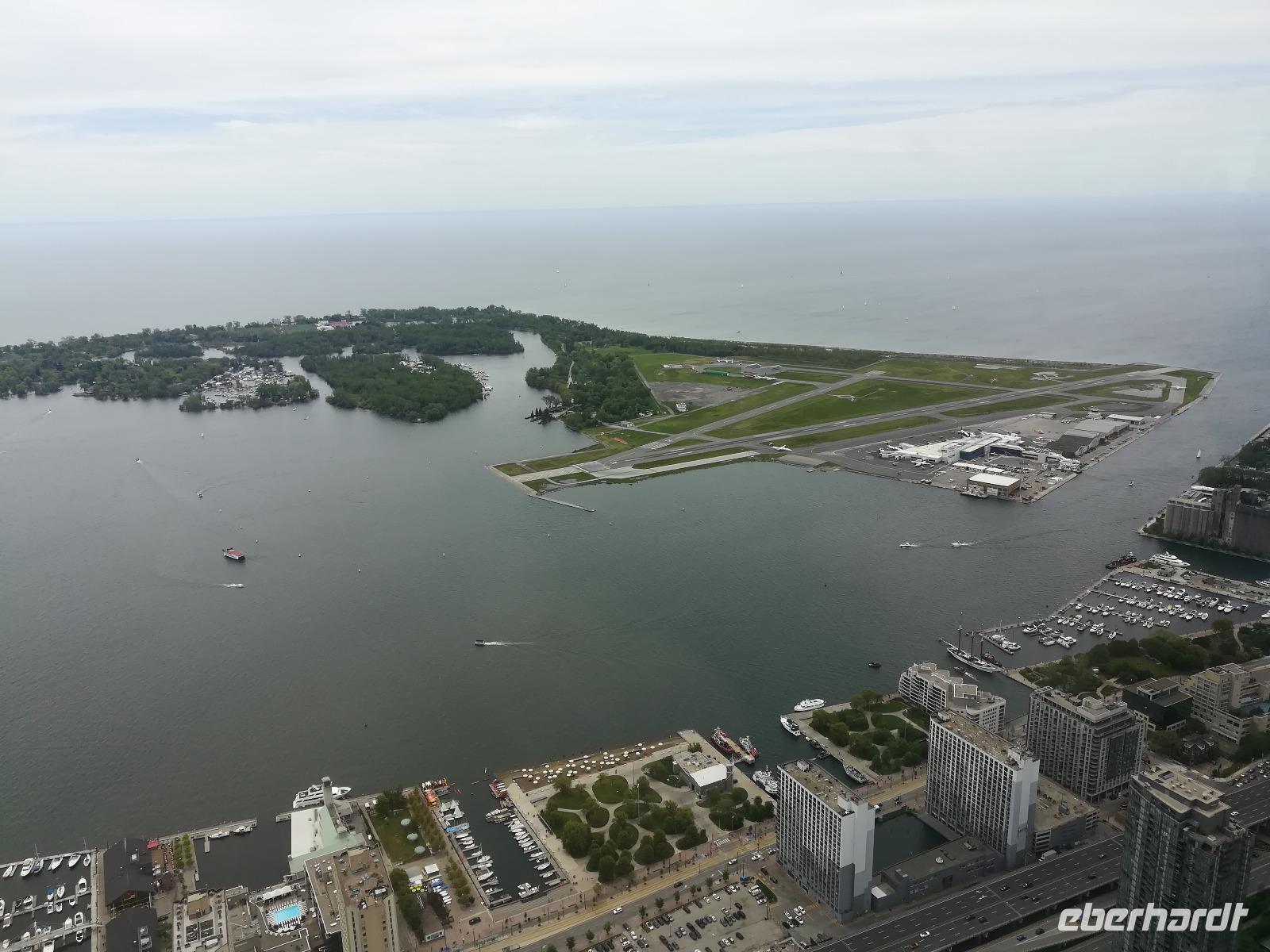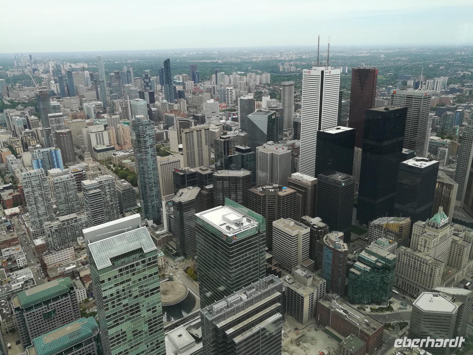 Der Höhepunkt des Tages sollte aber noch kommen. Fast alle Gäste entschlossen sich, mit mir auf den CN-Tower, dem bis 2009 mit 553 Meter höchsten Fernsehturm der Welt, zu fahren. Wir hatten tolles Wetter und daher wollten wir uns den Blick auf Toronto und die Umgebung von oben nicht entgehen lassen. Es standen nicht allzu viele Leute an und so waren wir ruckzuck in den Fahrstühlen und auf dem Weg nach oben zu der in 342 Meter Höhe befindlichen Besucherplattform. Wir hatten eine wunderbare Sicht auf die unter uns liegende Stadt und das wurde natürlich für viele unvergessliche Fotos genutzt.