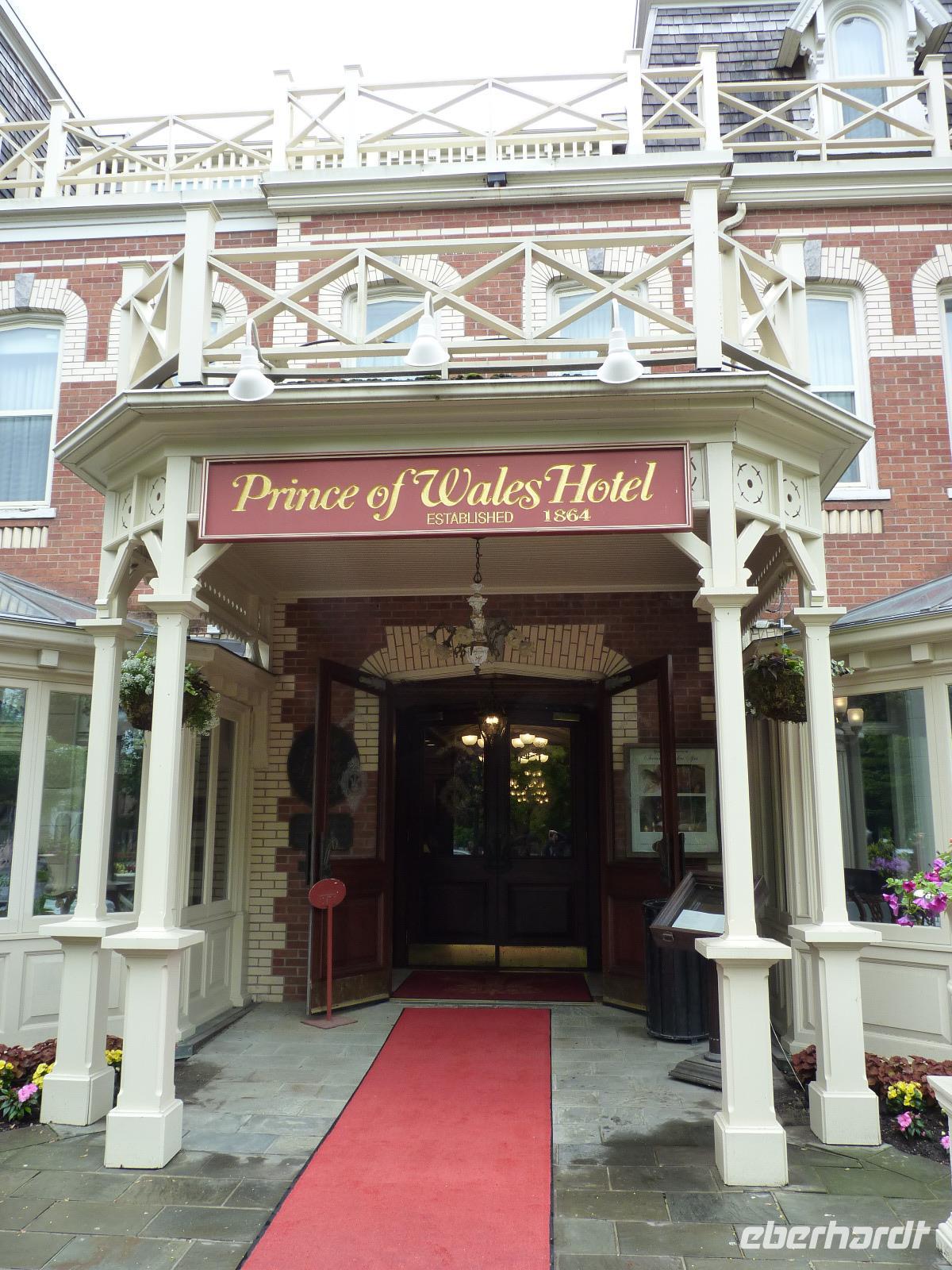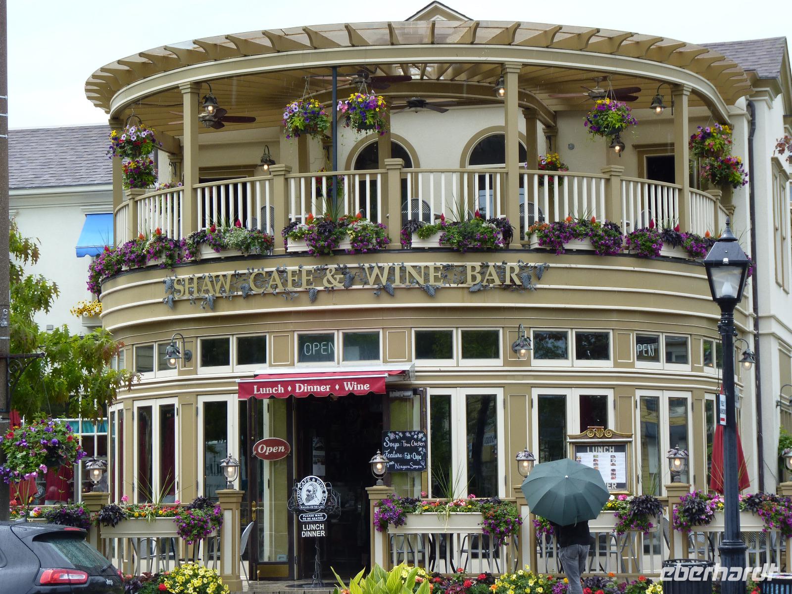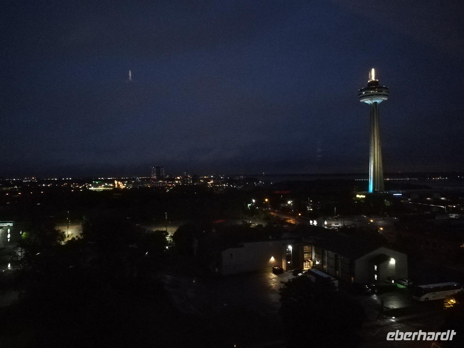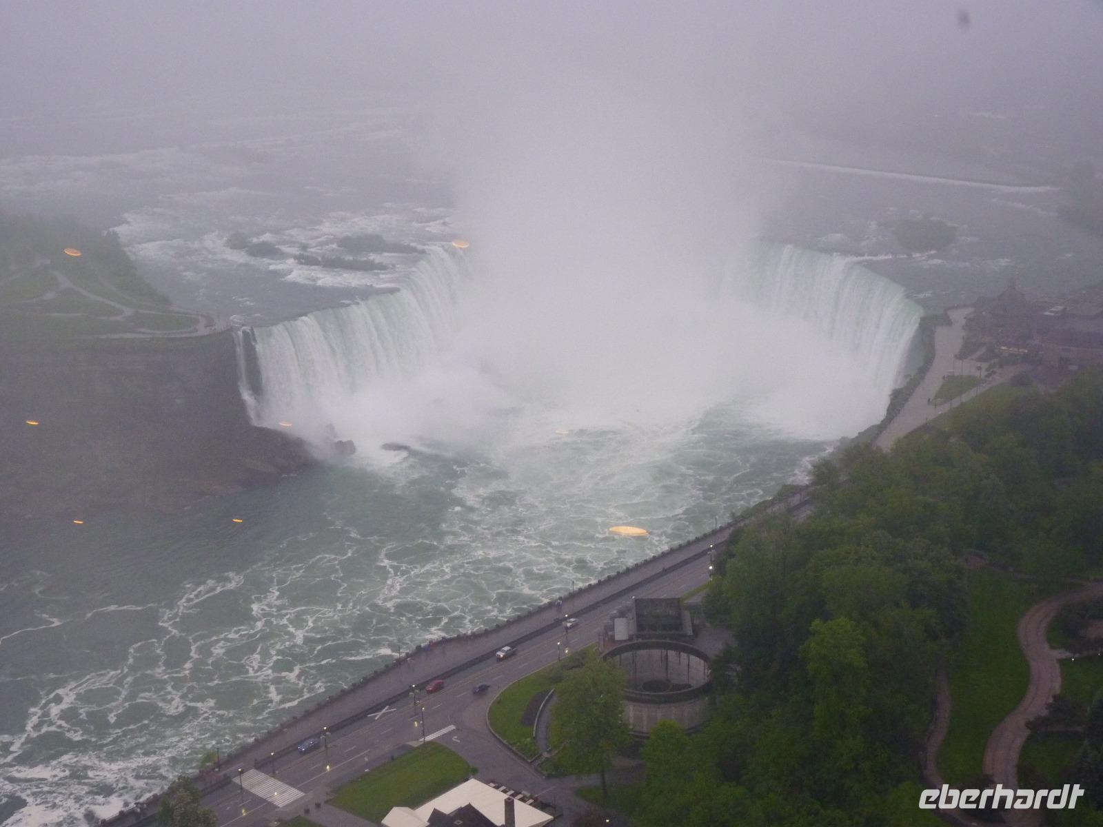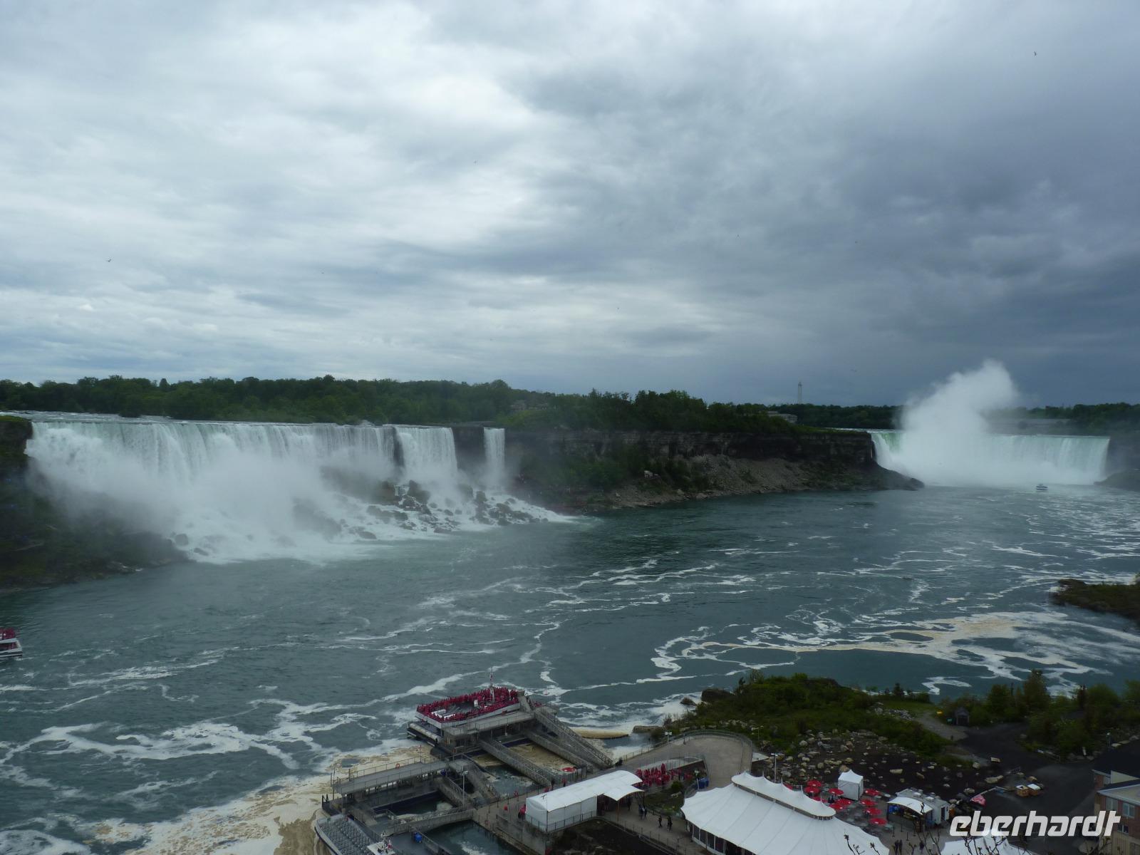 Weiter ging es nach Niagara on the Lake, wo wir einen Spaziergang durch den hübschen Ort unternahmen. Leider regnete es zu diesem Zeitpunkt zum ersten Mal auf unserer Reise, aber das störte nicht so sehr. Anschließend ging es auf dem Niagara Parkway mit seinen tollen Häusern (alles Siebenstellig) weiter zu den Wasserfällen. Zuvor legten wir aber noch einen Stopp bei den Niagara Stromschnellen ein, wo die Gruppe kurzentschlossen eine Gondelfahrt über den Niagara-River buchte und so tolle Fotos vom Fluss machen konnte. Dann aber der ultimative Höhepunkt des Tages, die Wasserfälle. Schnell waren die Tickets für die Bootsfahrt geholt, wir wurden mit Regencapes „eingekleidet" und kurze Zeit später ging die Bootsfahrt los. Je näher wir dem kanadischen Niagara-Wasserfall kamen, um so feuchter wurde es natürlich. Kurz vor dem Wasserfall fühlte sich die Gischt dann wie Starkregen an. Ohne die Capes wären wir innerhalb von Sekunden bis auf die Haut nass gewesen. Ein großer Spaß für alle. Im Anschluss hatten wir dann noch genügend Zeit, um von der Promenade entlang des Flusses aus viele tolle Fotos vom amerikanischen und kanadischen Wasserfall zu machen. Unser Abendessen nahmen wir an diesmal im Skylon Tower ein, von dem wir eine schöne Sicht auf die Wasserfälle hatten.