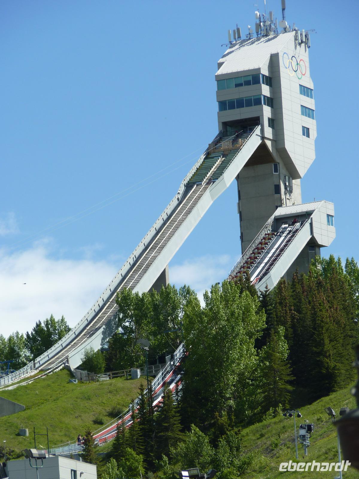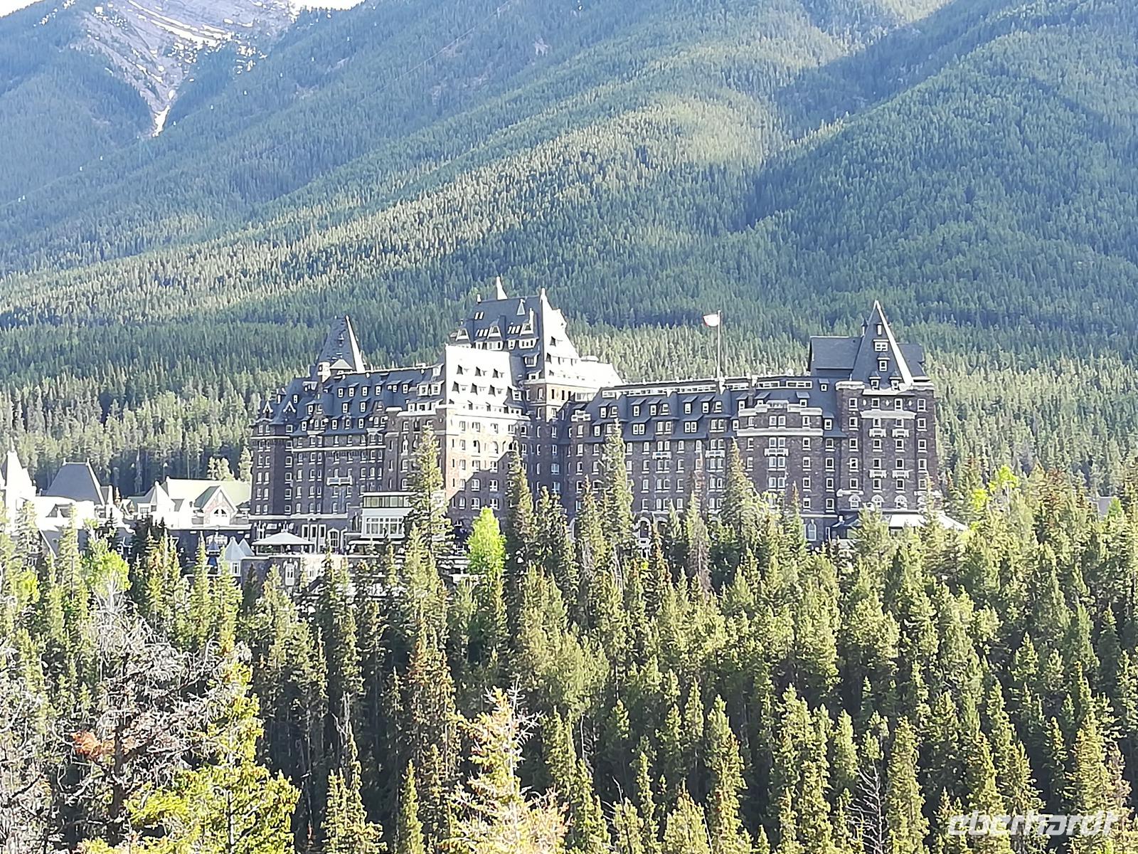 In Calgary nahm uns dann Renzo in Empfang, der uns in Personalunion als Fahrer und örtlicher Reiseleiter die Schönheiten des Westen Kanadas zeigen wollte. Nach einer kleinen Stadtrundfahrt in der Olympiastadt von 1976 und einem Besuch des Olympiaareals an den Skisprungschanzen fuhren wir nach Banff, wo wir unsere erste Übernachtung im Irwin´s Mountan Inn hatten. Unterwegs konnten wir dann auch schon das erste „wilde" Tier entdecken, einen Hirsch. Bei Ankunft in Banff unternahmen wir aber erst noch einen Abstecher zum Fairmont Hotel und dem nahe gelegenen Bow-Fall. Wir konnten uns schon jetzt einen Eindruck davon machen, dass die Flüsse in den Rocky Mountains viel Wasser führen und daher noch reißender und schneller flossen als sonst. Unser sehr gutes Abendessen nahmen wir im Ticino Swiss-Italien nur ein paar Meter von unserem Hotel entfernt ein. Die Zeit danach wurde dann noch für individuelle Spaziergänge durch den hübschen Urlaubsort genutzt.