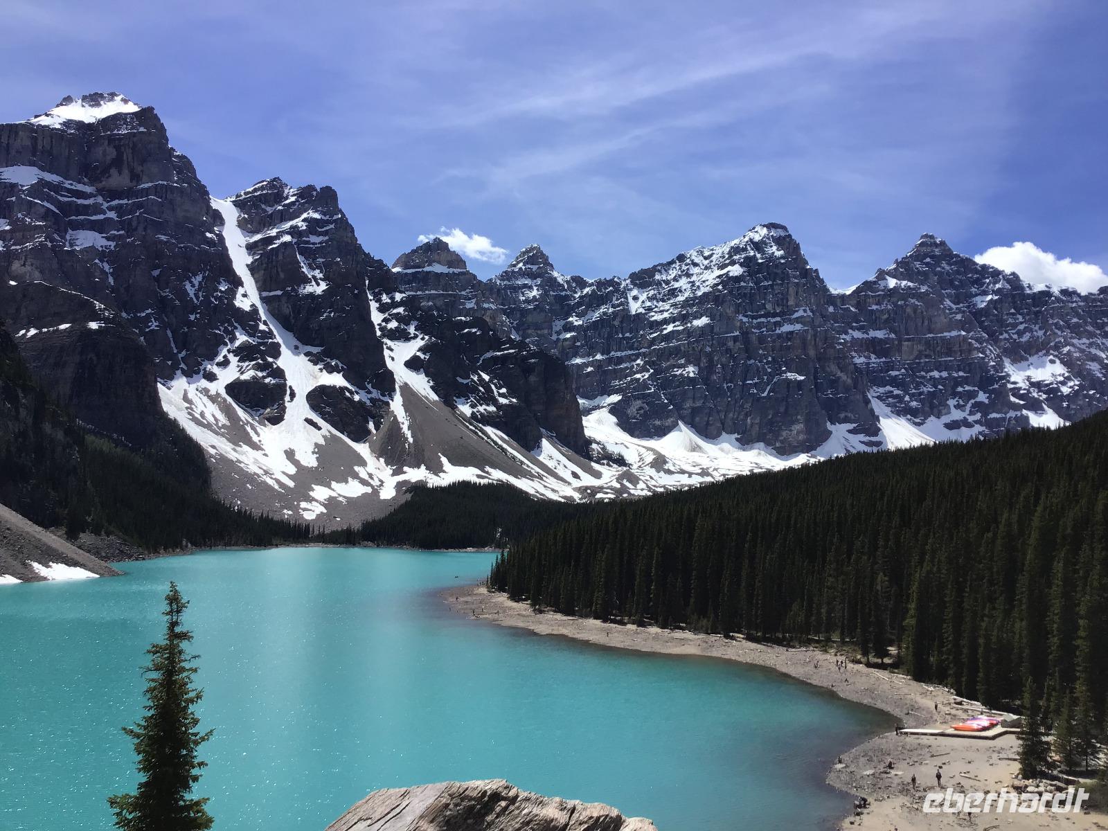 Heute war der Tag der großartigen Fotostopps. Es ging am Vormittag los mit dem Emerald Lake, der mit einer herrlichen Farbe und der umliegenden Landschaft ein schönes Bild ergab. Bei der Natural Bridge am Kicking Horse River konnten wir uns von der Urgewalt des Wassers überzeugen. Die Spiral Tunnel wiederum zeugten von der hohen Ingenieurskunst, mittels zweier Spirale im Felsen einen Höhenunterschied von insgesamt 30 Meter auf engem Raum zu überwinden. Wir hatten Glück und konnten einen Zug an einer der beiden Spiralen beobachten. Weiter ging es zum Lake Louis, wo wir auf und in das Fairmont Hotel Lake Louis einen Blick werfen und einen kleinen Spaziergang entlang des Seeufers machen konnten. Schöne Fotos vom See mit seinen dahinterliegenden schneebedeckten Bergen waren selbstverständlich. Noch einen Kick mehr gab es am Moraine Lake. Es war schon irgendwie schon nicht mehr wirklich, welches großartige Bild uns mit der Farbe des Sees und den umgebenden 10 schneebedeckten Bergen ergab. So etwas kann man nicht beschreiben, vielleicht kommt es auf den Fotos etwas rüber, so etwas muss man einfach selber sehen. Unwahrscheinlich schön.