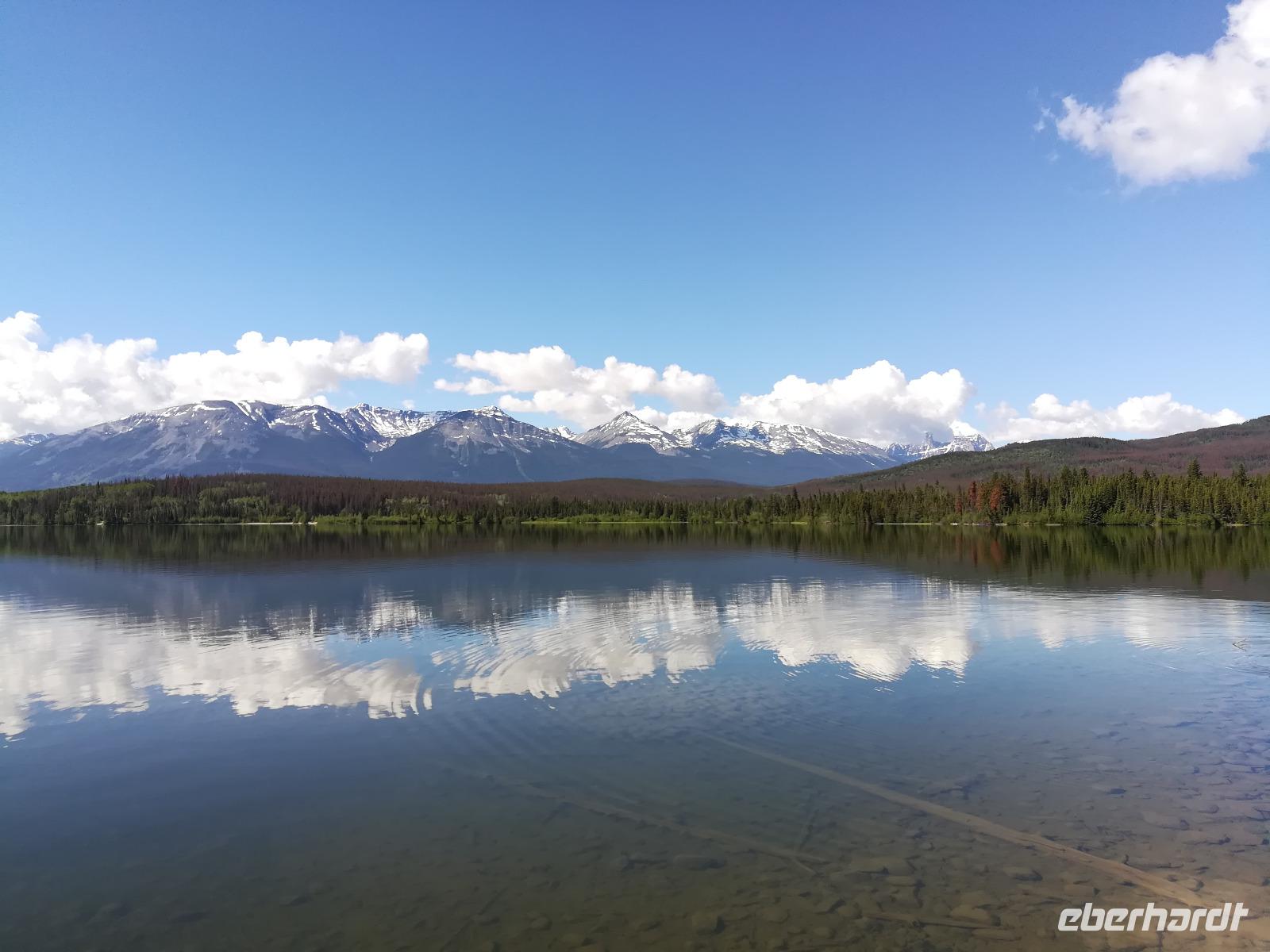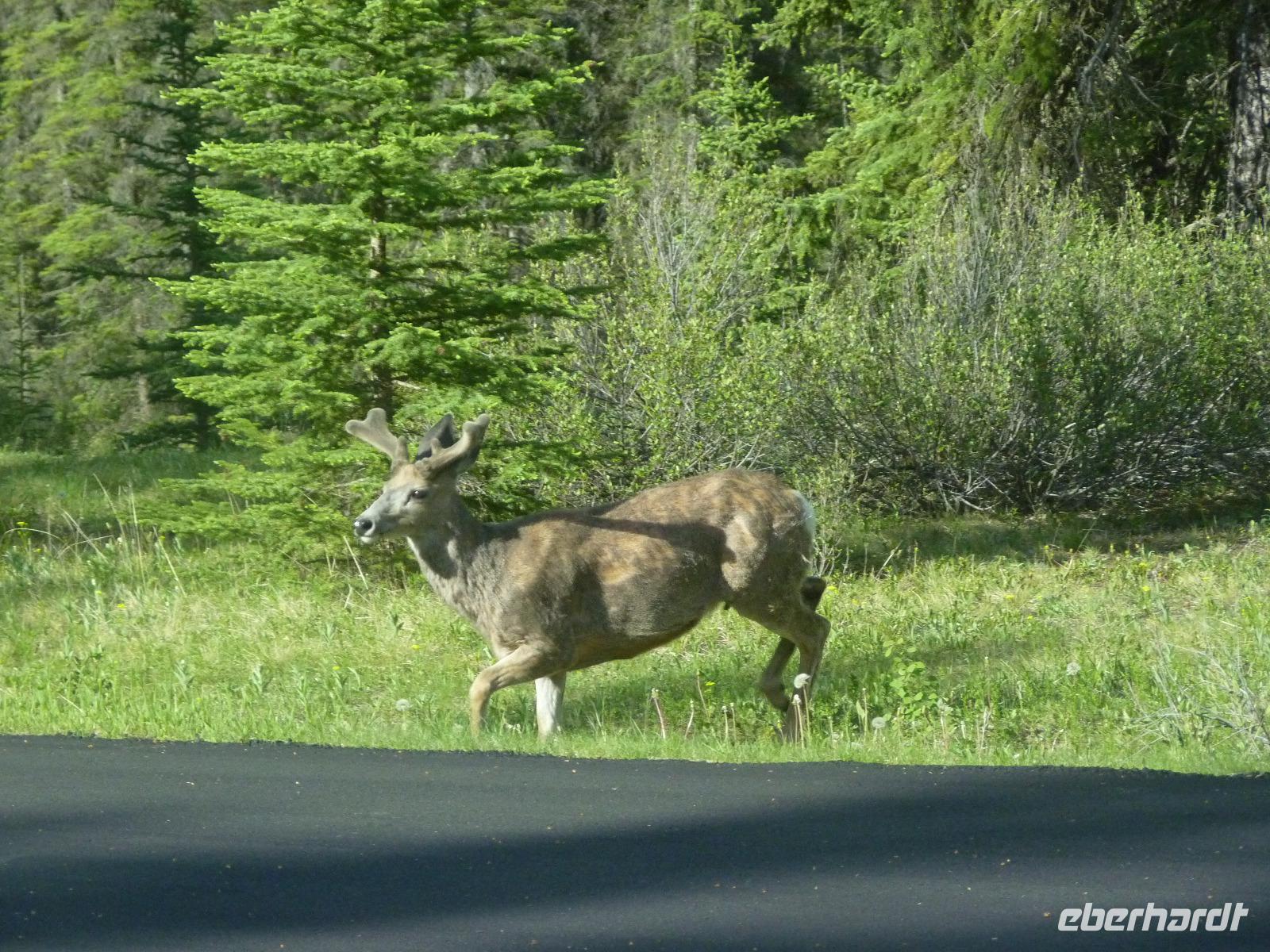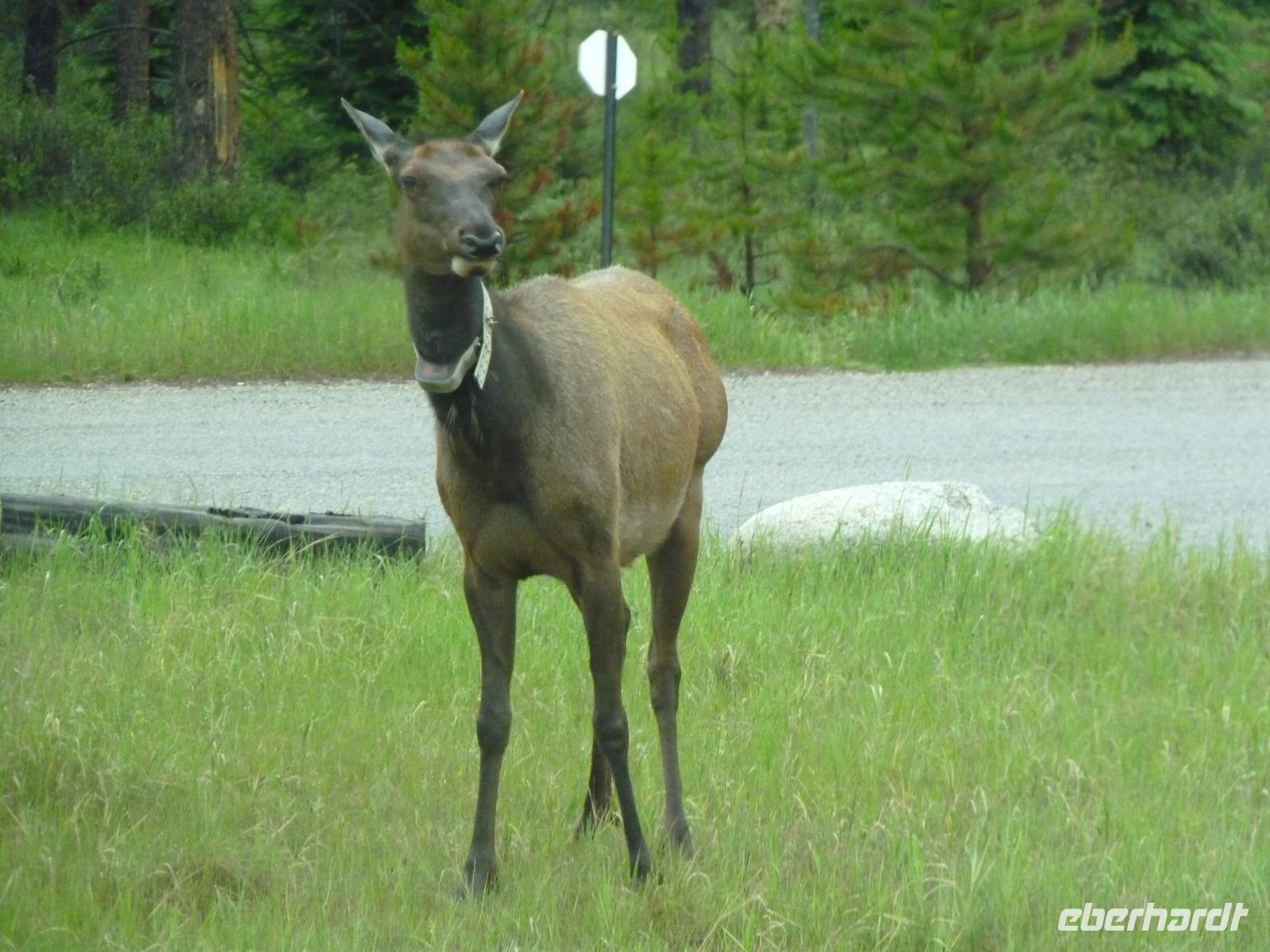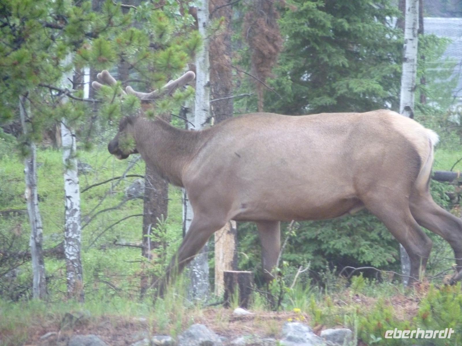 In der Nähe von Jasper besuchten wir noch den Pyramid Lake in der Hoffnung, vielleicht hier einen Elch zu sehen. Leider erfüllte sich diese Hoffnung nicht. Dafür gab sich ein Wapiti die Ehre, am Straßenrand in aller Ruhe zu speisen und sich überhaupt nicht von den vielen Touristen stören zu lassen.
