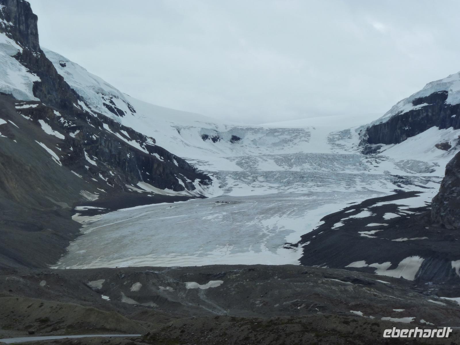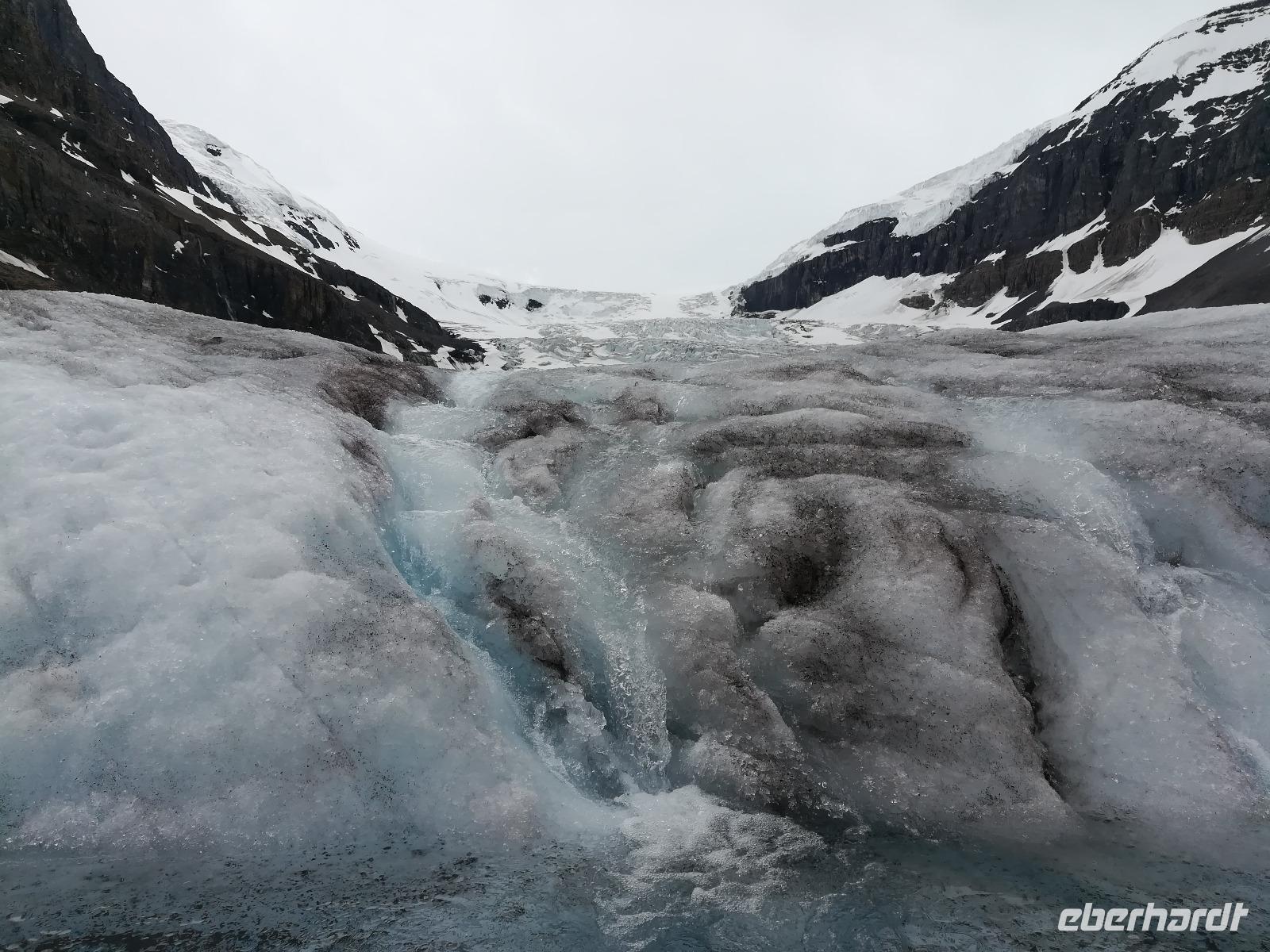 Am Athabasca-Gletscher selbst konnten wir bald nach unserer Ankunft in den Transferbus einsteigen, um von diesem zu unserem Schneemobil gebracht zu werden. Während unserer Fahrt zum Eisfeld informierte uns die Fahrerin über allerlei Interessantes zum Gletscher. Dieser hat zum Beispiel in den letzten reichlich einhundert Jahren mehr als die Hälfte seiner ursprünglichen Größe verloren und ist jetzt nur noch 5 Quadratkilometer groß. Dann konnten wir aussteigen und die uns zur Verfügung stehende Zeit für einen Rundgang und viele Fotos nutzen. Wir hatten zudem noch Glück mit dem Wetter, den zum Zeitpunkt unseres Eisspazierganges zeigte sich die Sonne und der Himmel schloss für kurze Zeit seine Regenschleusen.