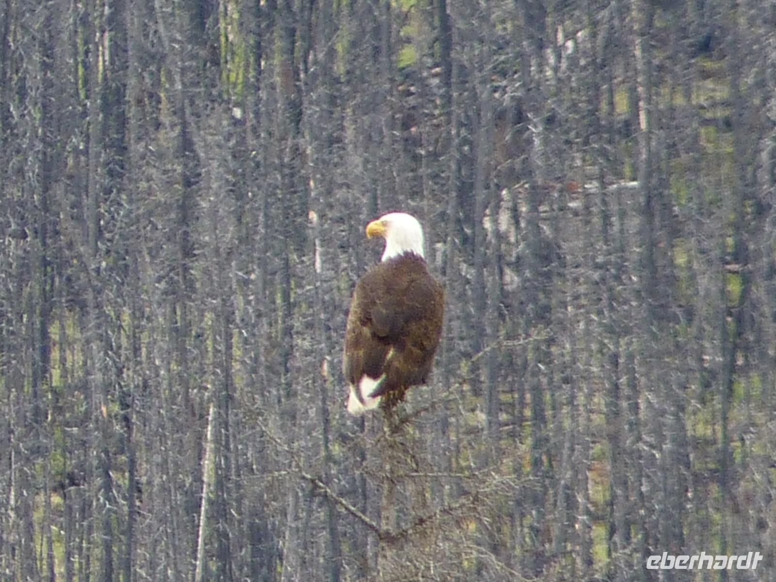 Vor dem Maligne Lake lag noch der Medicine Lake, bei dem wir auch einen Fotostopp einlegten und was sahen wir dort: einen Schwarzbären. Soviel Glück ist schon selten, dass man einen Grizzly und einen Schwarzbären innerhalb von 2 Tagen sieht. Zudem hatte in der Nähe noch ein Weißkopfadler sein Nest und gab sich für kurze Zeit die Ehre, dort für ein Foto zu landen.