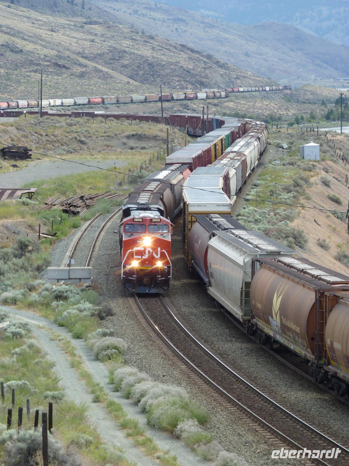 Immer wieder interessant in Kanada sind die gefühlt unendlich langen Güterzüge. Hinter Kameloops haben wir uns dann die Zeit genommen, bei einem gerade vorbeifahrenden Zug die Waggons zu zählen. 160 Wagen hatte der Zug zu ziehen, bei einer geschätzten Länge von 15-20 Metern ergibt das einen Güterzug von ca. 2,5 bis 3 Kilometer Länge. Wahnsinn. In Kanada sind die Menschen freundlich und so grüßte uns der Lokführer natürlich auch mit einem kräftigen Signalton.