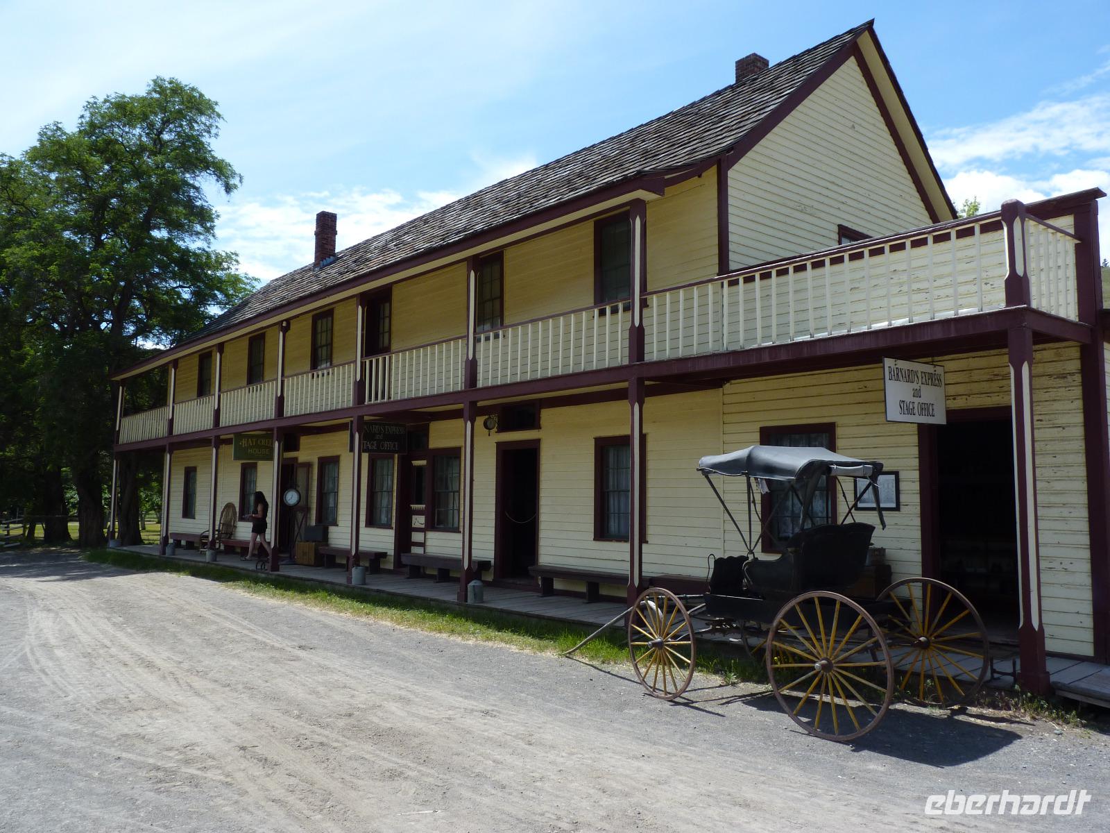 Der Höhepunkt des Tages war der Besuch der Hat Creek Ranch. Das Hat Creek House war in der Zeit des Goldrausches in der zweiten Hälfte des 19. Jhd. eines der komfortabelsten Rasthäuser in der Gegend. Dort sind Einrichtungsgegenstände und Tapeten im Original zu bewundern. Auf dem Gelände befindet sich auch in indianisches Besuchszentrum. Korrekterweise müsste man sagen ein Besuchszentrum der First Nations People. Eine echte Shuswap-Frau zeigte uns dann die Lebensweise dieses Stammes aus längst vergangenen Zeiten. Natürlich durfte eine Kutschfahrt nicht fehlen. So konnte jeder Gast unserer Gruppe einmal fühlen, wie unbequem eine solche Fahrt war und was die Passagiere und der Kutscher seinerzeit aushalten mussten, wenn sie tage- oder wochenlang über Stock und Stein fuhren.