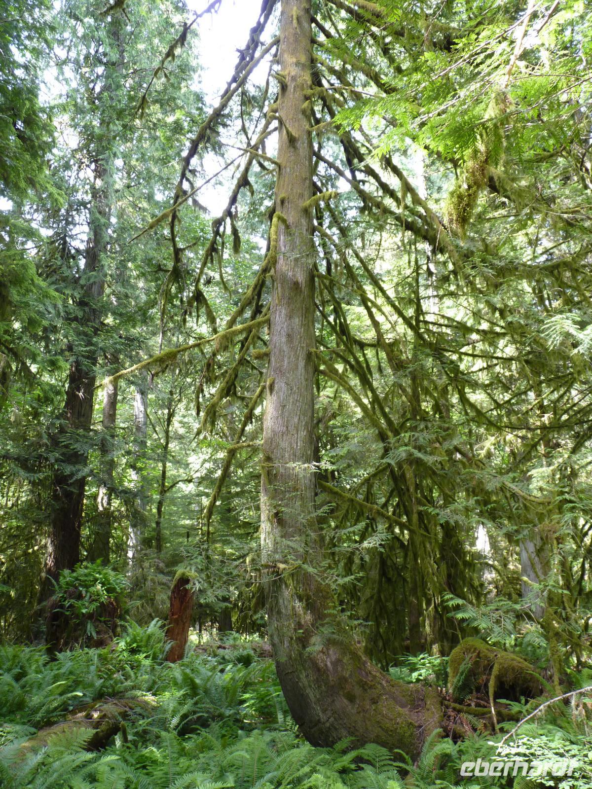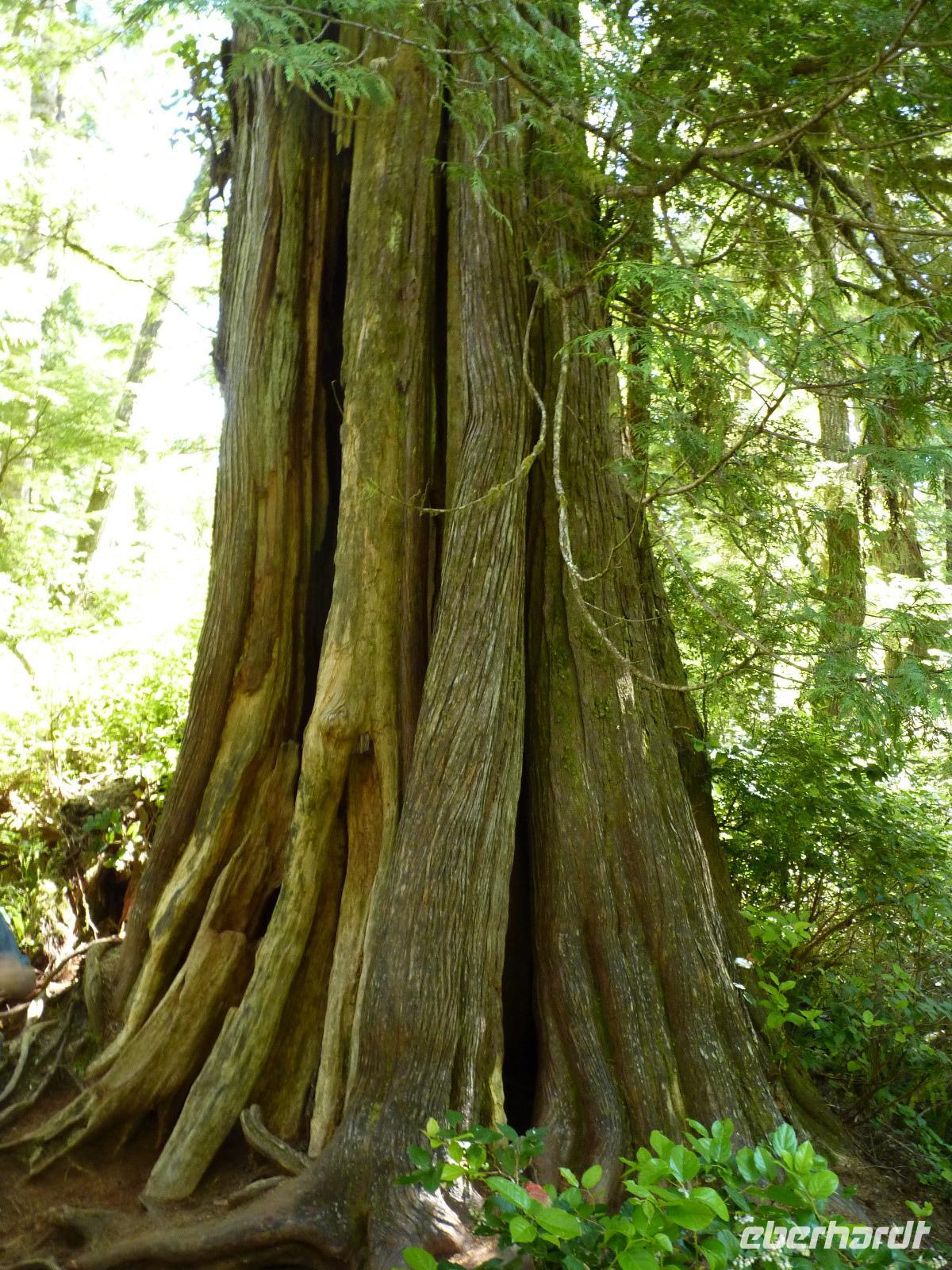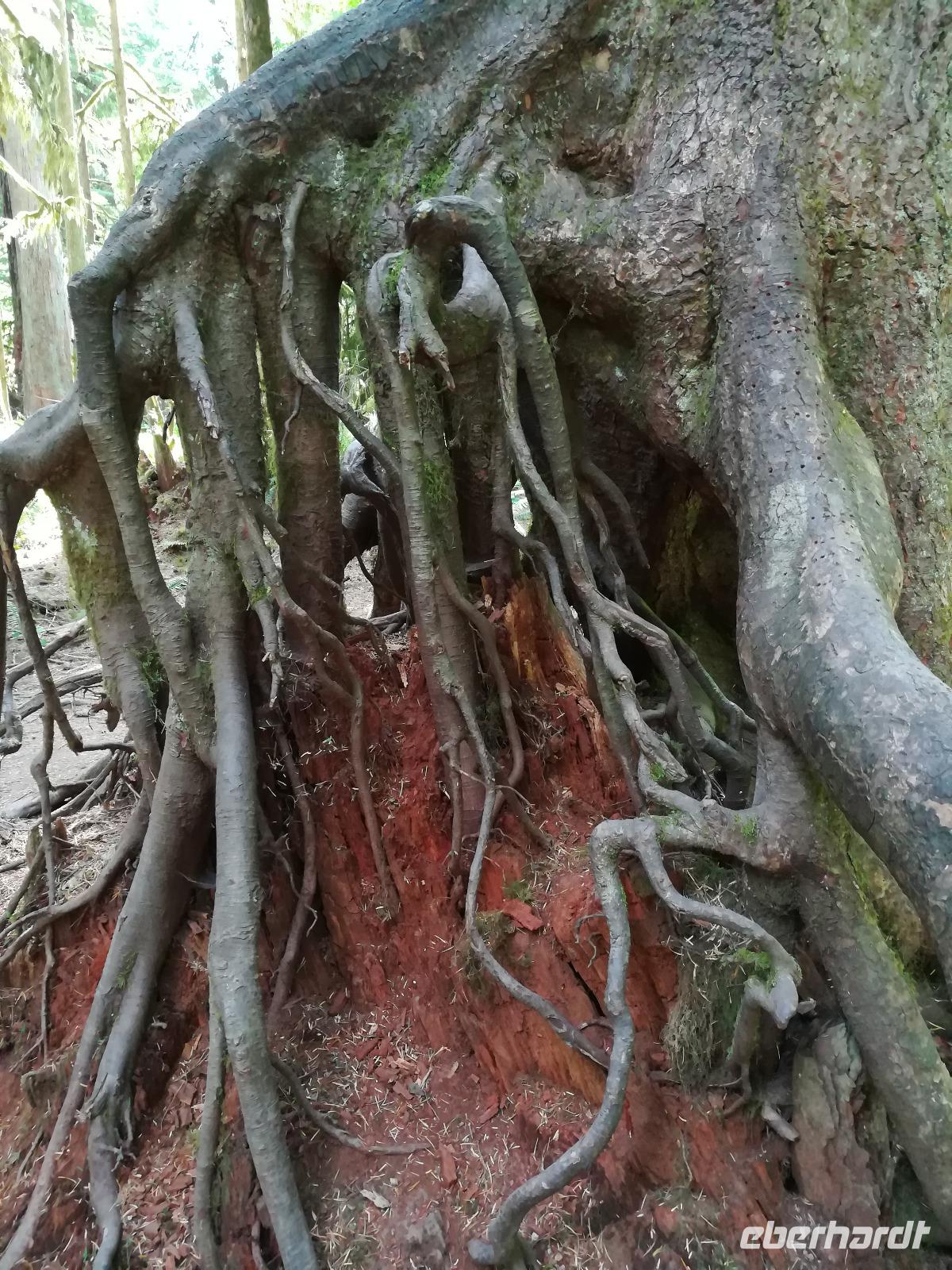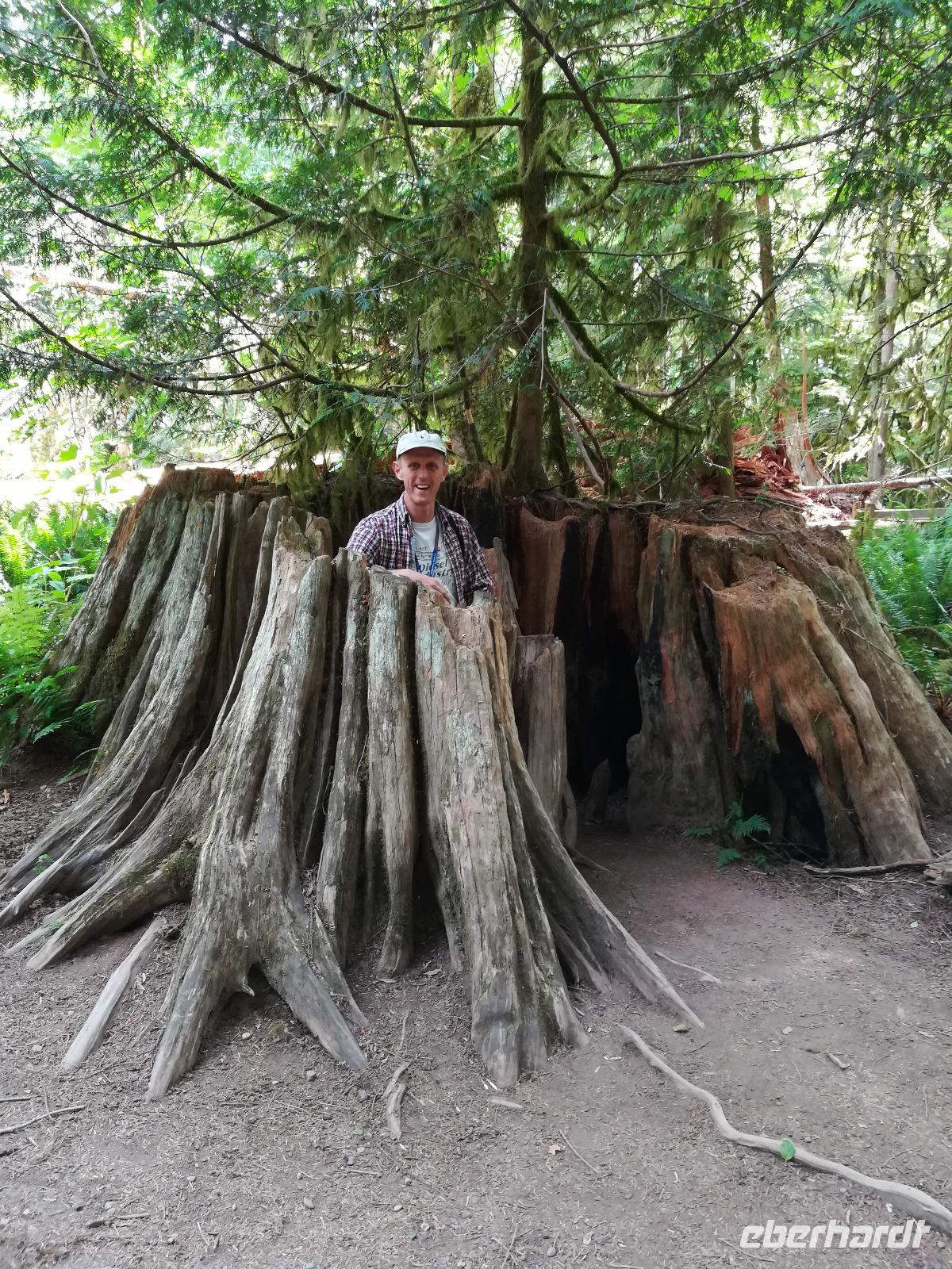Ein Highlight unserer Reise war sicher der Besuch des Cathedral Grove mit seinen uralten Baumriesen aus überwiegend Zedern und Douglasien. Der älteste Baum dieses geschützten Bereiches ist älter als die Landung von Kolumbus in Amerika. Die dicksten Bäume hatten einen Umfang von ca. 9 Metern. 5 Gäste und ich wurden benötigt, um so einen Baum zu umfassen. Unglaublich. Da in diesem Bereich alles in seiner Ursprünglichkeit erhalten geblieben ist, muss man schon von einem richtigen Urwald reden. Die Fotoapparate kamen gar nicht zur Ruhe, um all die Eigentümlichkeiten an Wurzeln, Stämmen und Farnen aufzunehmen. Ein eindrucksvolles Erlebnis.