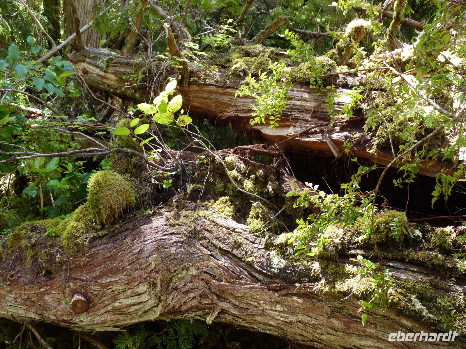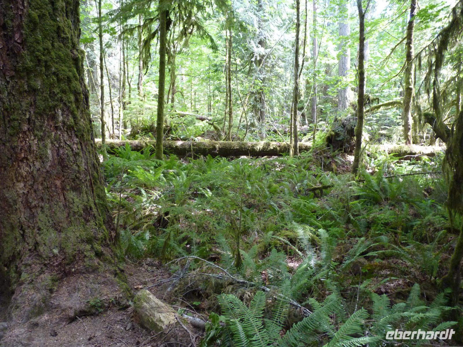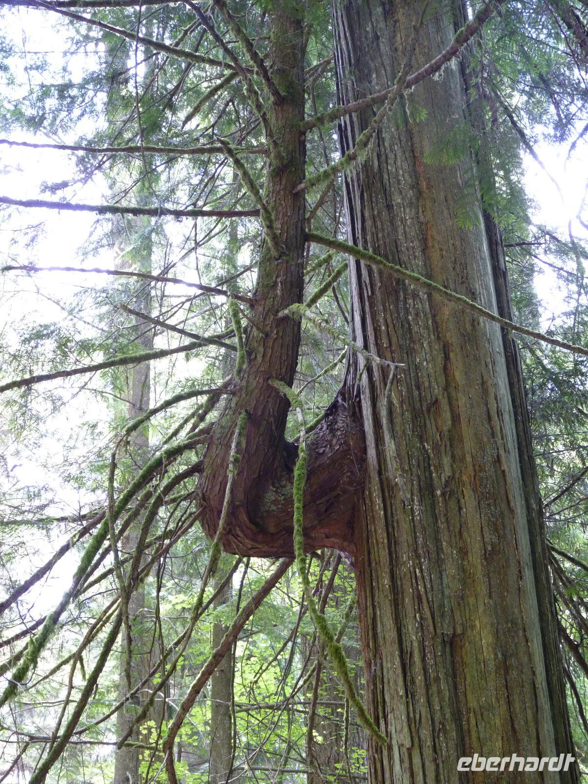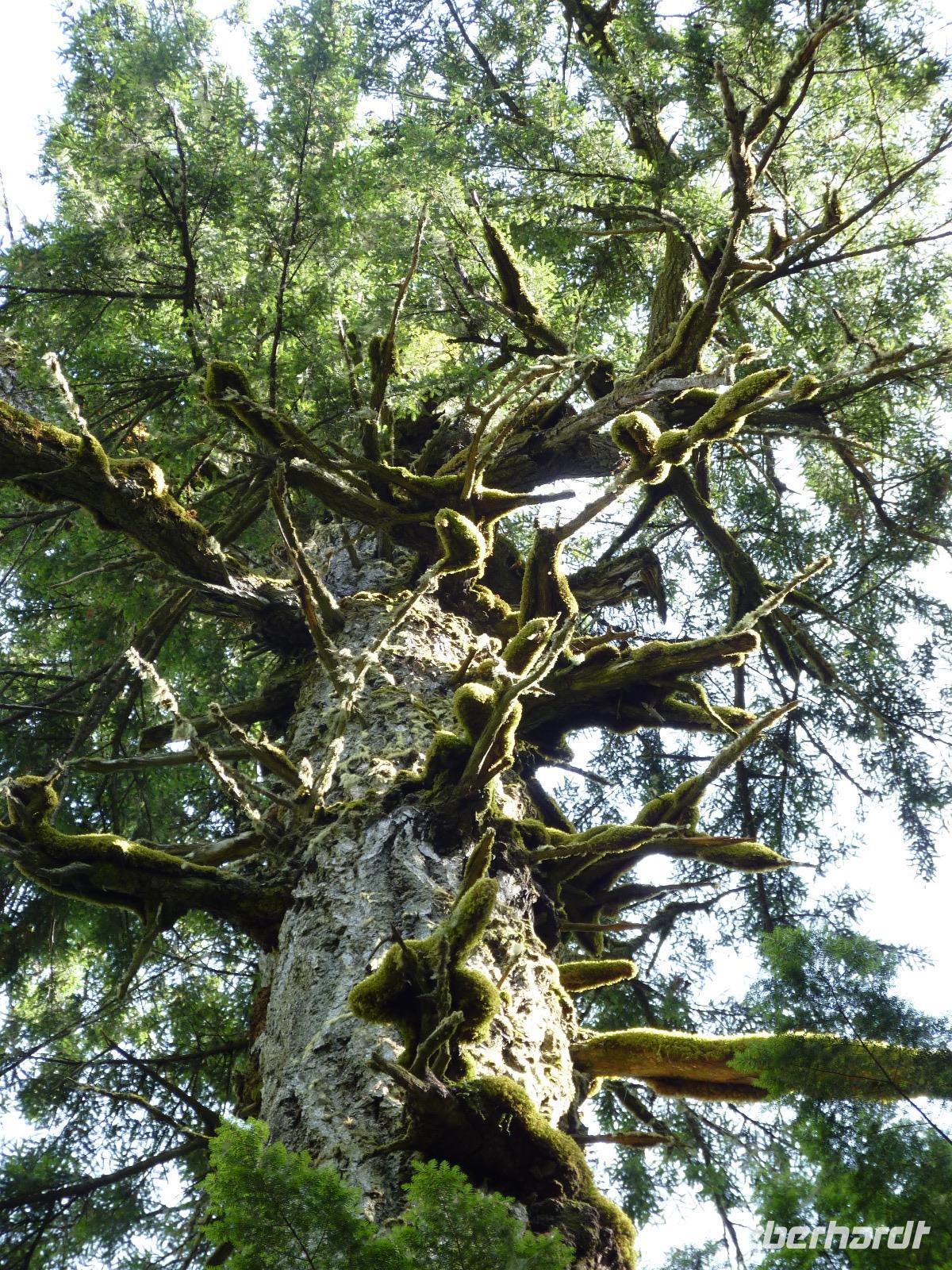 Ein Highlight unserer Reise war sicher der Besuch des Cathedral Grove mit seinen uralten Baumriesen aus überwiegend Zedern und Douglasien. Der älteste Baum dieses geschützten Bereiches ist älter als die Landung von Kolumbus in Amerika. Die dicksten Bäume hatten einen Umfang von ca. 9 Metern. 5 Gäste und ich wurden benötigt, um so einen Baum zu umfassen. Unglaublich. Da in diesem Bereich alles in seiner Ursprünglichkeit erhalten geblieben ist, muss man schon von einem richtigen Urwald reden. Die Fotoapparate kamen gar nicht zur Ruhe, um all die Eigentümlichkeiten an Wurzeln, Stämmen und Farnen aufzunehmen. Ein eindrucksvolles Erlebnis.
