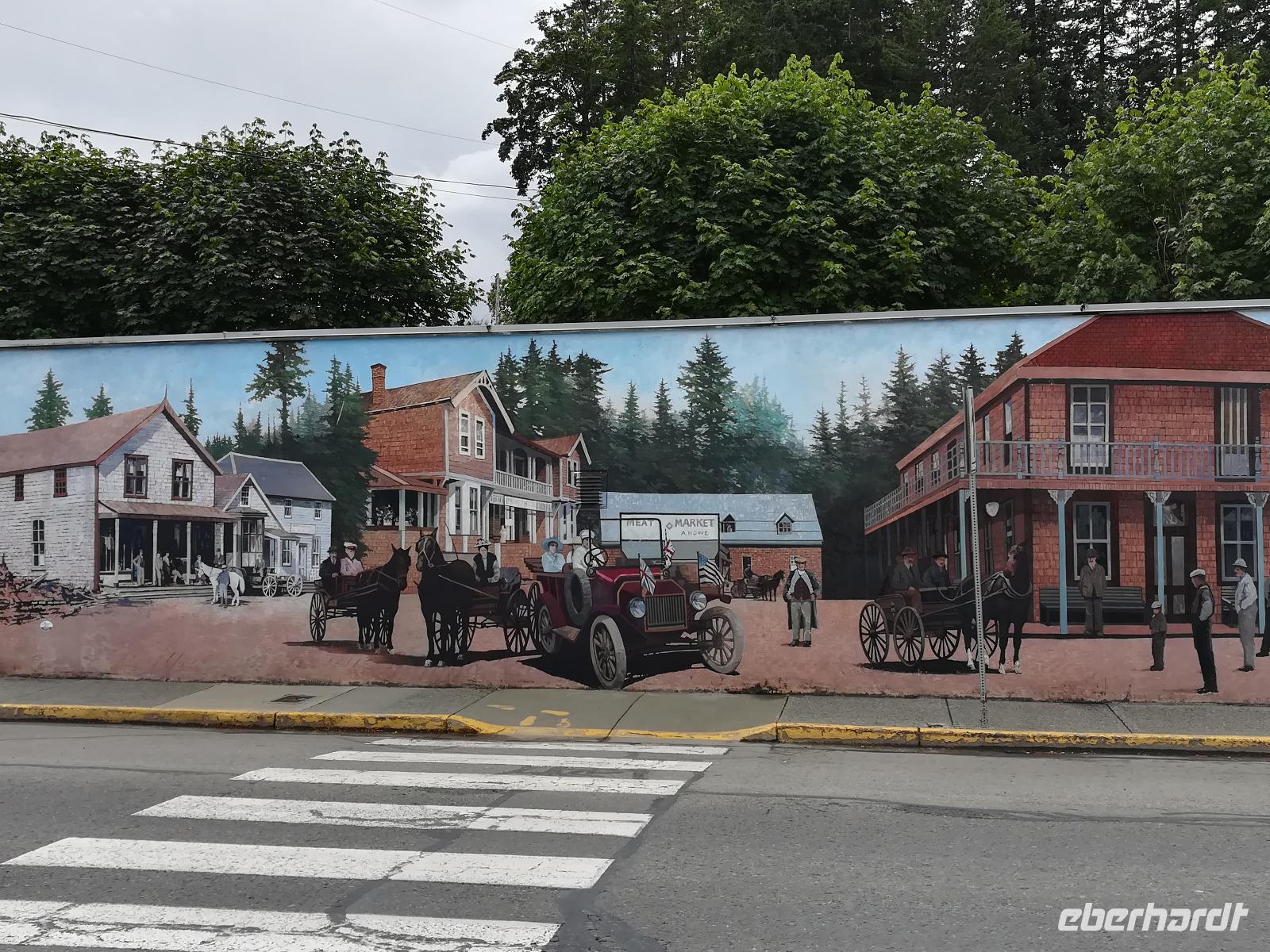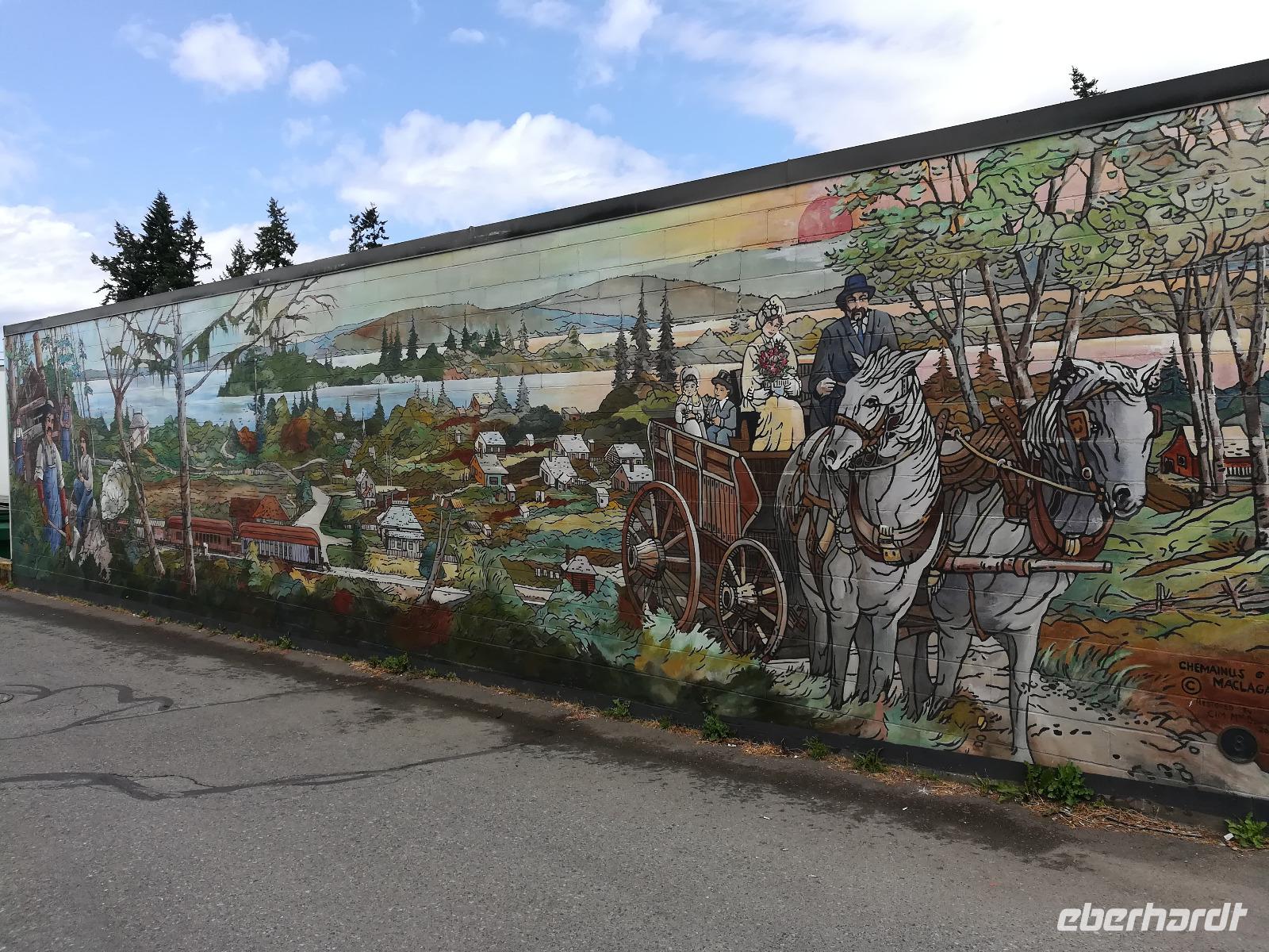 Unterwegs machten wir einen Stopp im Dorf Chemainus. Dieser Ort wurde bekannt durch seine Wandmalereien, in denen die Geschichte des Dorfes und der Menschen zeichnerisch an Hauswänden dargestellt wird. Wir mussten nur den gelben Fußspuren auf dem Gehweg folgen und konnten so kein Bild verpassen. Sehr interessant! Zudem hatten der Ort noch ein paar hübsche Geschäfte, unter anderem einen Weihnachtsladen. Die Besitzerin sprach zwar kein Deutsch, kannte aber alle wichtigen Weihnachtsregionen in Deutschland und war selbst schon mehrere Male in Seiffen, Nürnberg usw.