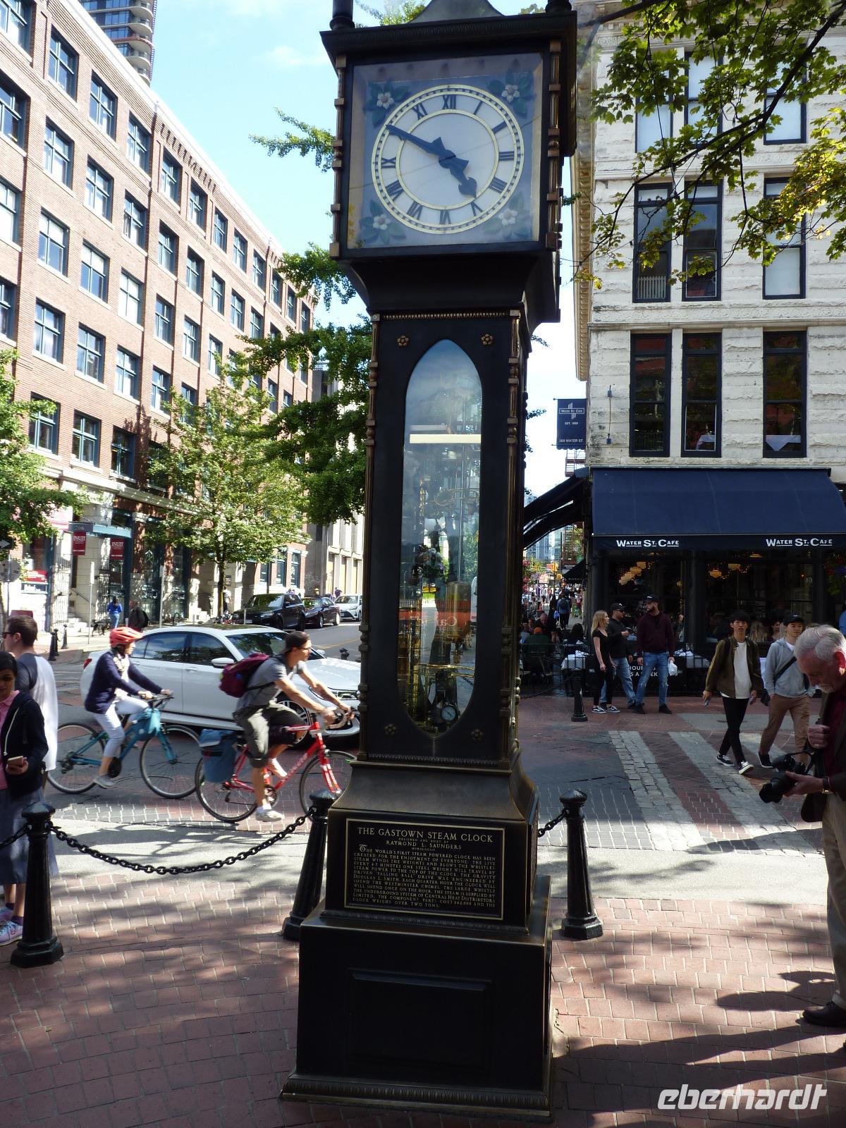 Wir merkten sofort, wieder in einer Großstadt zu sein. Verkehr ohne Ende, Stau und natürlich jede Menge Menschen. Bei ca. 700.000 Einwohnern kein Wunder. In einer kleinen Stadtrundfahrt zeigte uns Renzo seine Stadt. Dabei besuchten wir in Gastown das Wahrzeichen dieses Stadtteils, die Steam Clock oder Dampfuhr. Zu jeder Viertelstunde „pfeift" die Uhr eine Melodie und nur zu jeder vollen Stunde gibt es noch einen zusätzlichen einzelnen Pfiff aus jeder der 5 Pfeifen. Natürlich ein Touristenmagnet.